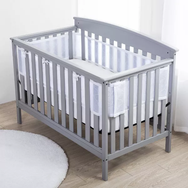 - "SAFE ALTERNATIVE TO CRIB BUMPER: Helps prevent arms and legs from getting caught between slats. Unlike crib bumpers, a single layer of breathable mesh allows exhaled air to pass through the fabric and mitigates the risk of carbon dioxide rebreathing. "