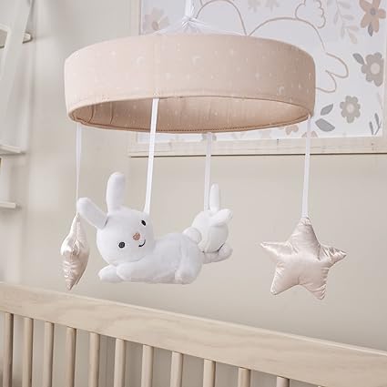 The Sammy & Lou Cottontail Cloud Musical Crib Mobile features a round open canopy in a lovely shade of pink from which hangs 2 shiny stars and 2 plush white bunnies. As they rotate above your baby, the mobile plays Brahms' lullaby.