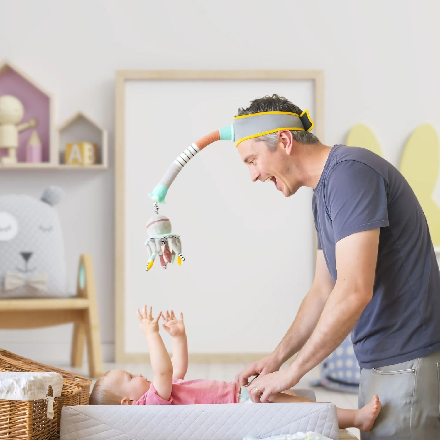 Ollie the Octopus: Say hello to Ollie, your new diaper-changing sidekick! This plush octopus attaches to the sensory rod, transforming it into a head-worn mobile. Ollie is super soft, and thanks to the gentle baby-safe chime in its head, it creates a calming sensory experience that’ll keep baby happily occupied during diaper time.