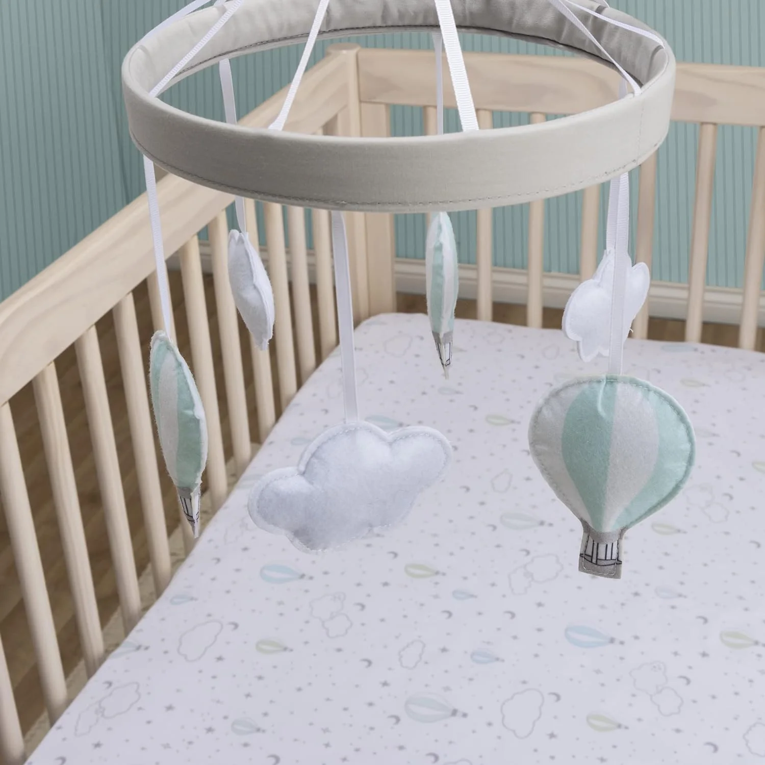 The Sammy & Lou Hot Air Balloon Musical Crib Mobile featues a group of 3 plush clouds and 3 plush balloons that hang from a round open grey canopy. Adorable mobile plays Brahms' lullaby as the balloons and clouds rotate over your baby.