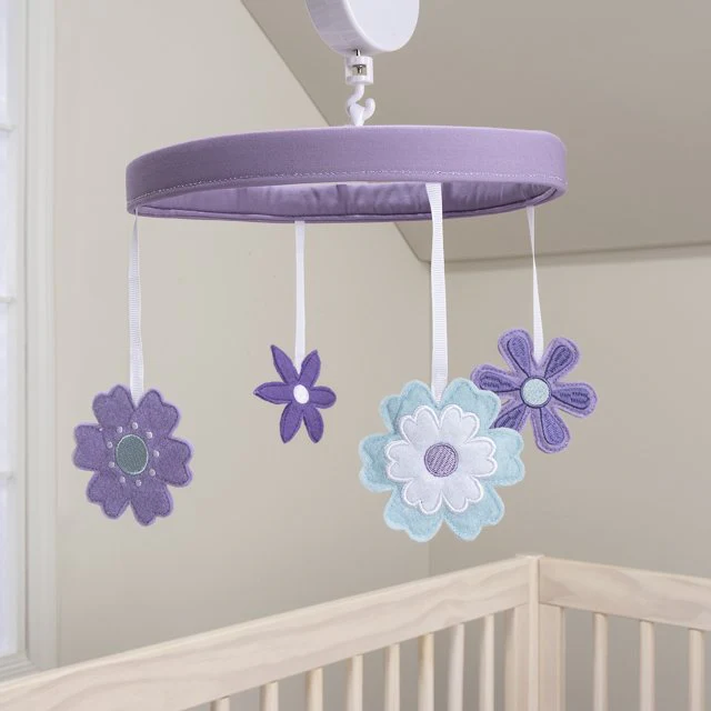 Encourage eye tracking and sound perception skills with the Lilac Flowers Musical Crib Mobile by Sammy & Lou. Mobile features an orchid bloom, 9-inch banded mobile ring. There are 4 purple, blue and purple bloom flowers suspended from decorative white ribbons to slowly rotate to Brahms’ Lullaby. This mobile coordinates with Butterfly Meadow and Tiny Dinos bedding collections by Sammy & Lou.