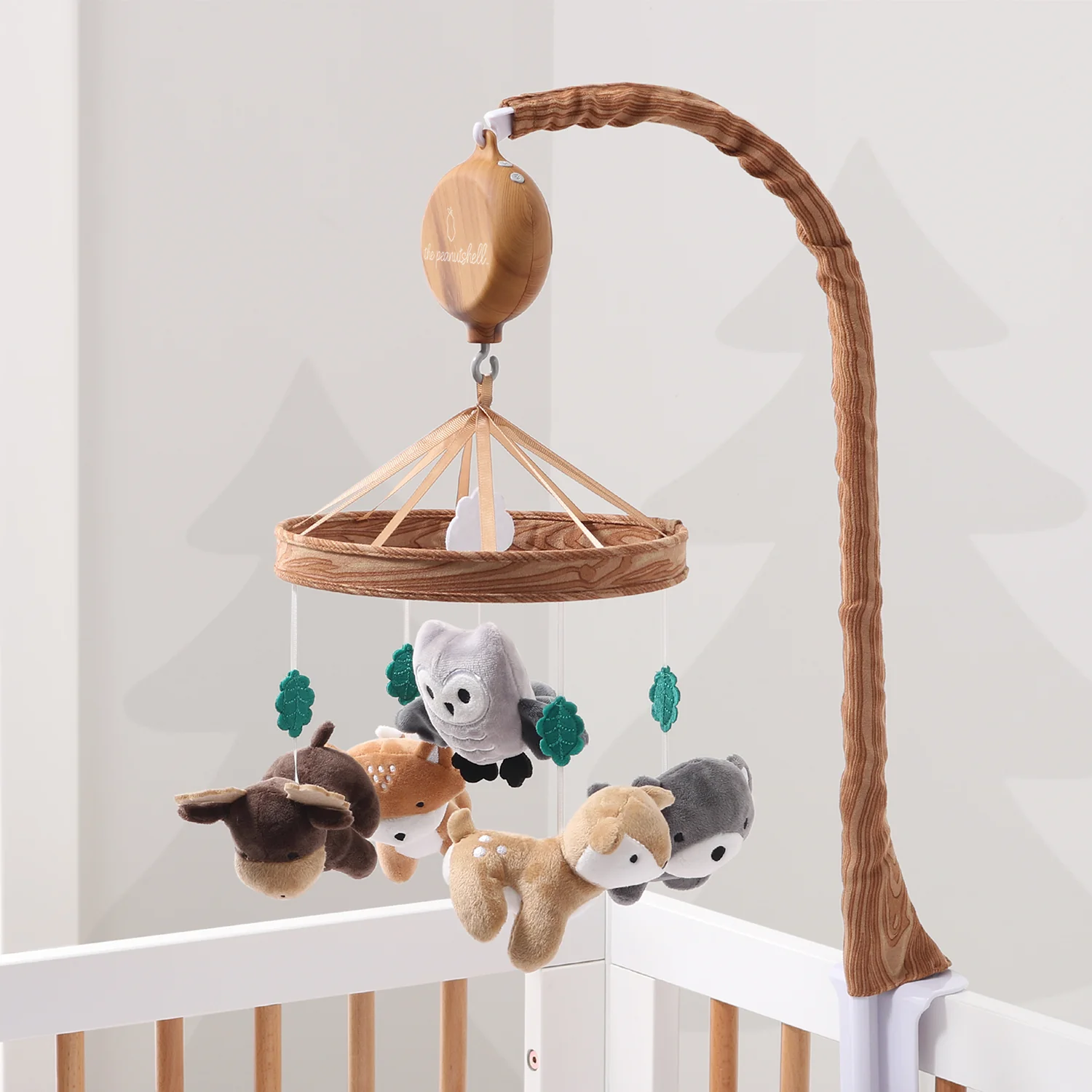 Whimsical Woodland Musical Mobile by The Peanutshell helps to promote baby's auditory development, motor skills and visual stimulation. Our thoughtfully designed nursery essential features a soft velour bear, deer, owl, moose and fox surrounded by green felt leaves and central white cloud. A faux woodgrain printed ring construction adds extra forest flair to your nursery. The digital music box plays snippets of 12 different lullabies to sooth your little one gently to sleep. Easily switch music on/off or between songs with the simple touch of a button. A matching faux woodgrain padded arm cover enhances the nature theme for a polished designer look. This item coordinates perfectly with several of our woodland themed bedding collections and fitted crib sheet packs. Requires two AA batteries that are not included.
