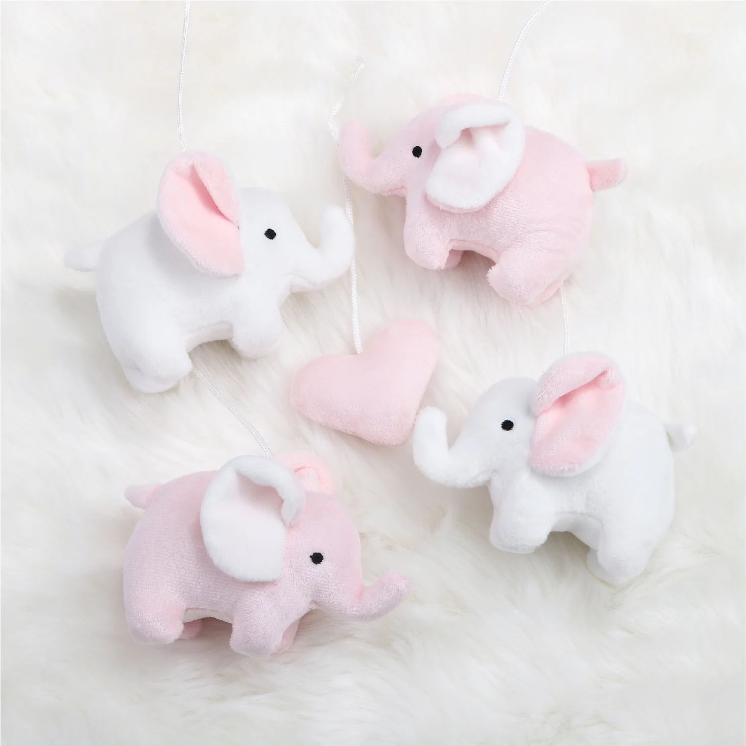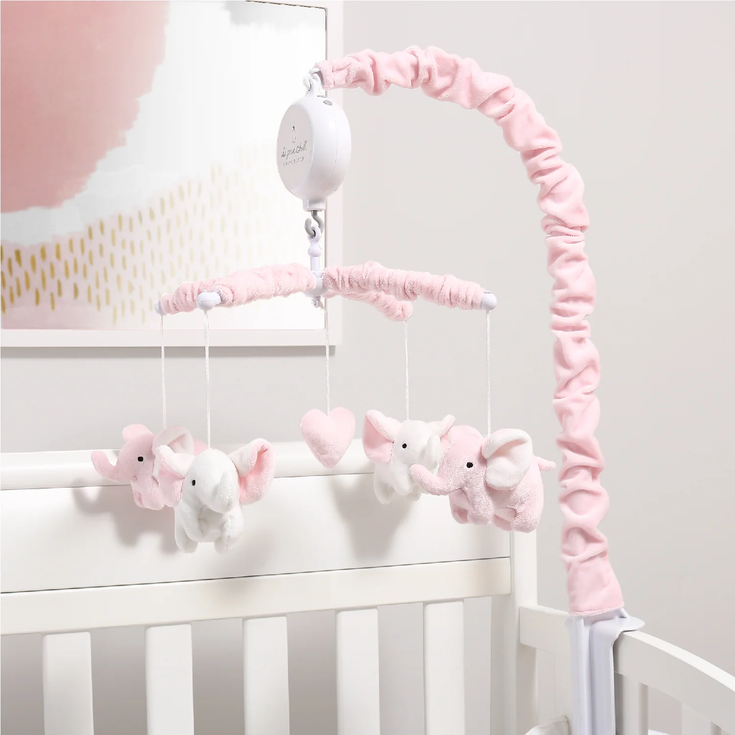Playful elephants will send your little one off to dreamland with The Peanutshell Pink Elephant Musical Mobile. These adorable elephants, in shades of pink and white, playfully hang from arms above. Arms are covered in velour, and each character is made of super-soft velour with embroidered details. Mobile pairs wonderfully with several of The Peanutshell Bedding Sets or is great on its own. The perfect thing to send your little one off to dreamland. Digital music box plays snippets of 12 lullabies. Requires two AA batteries that are not included.