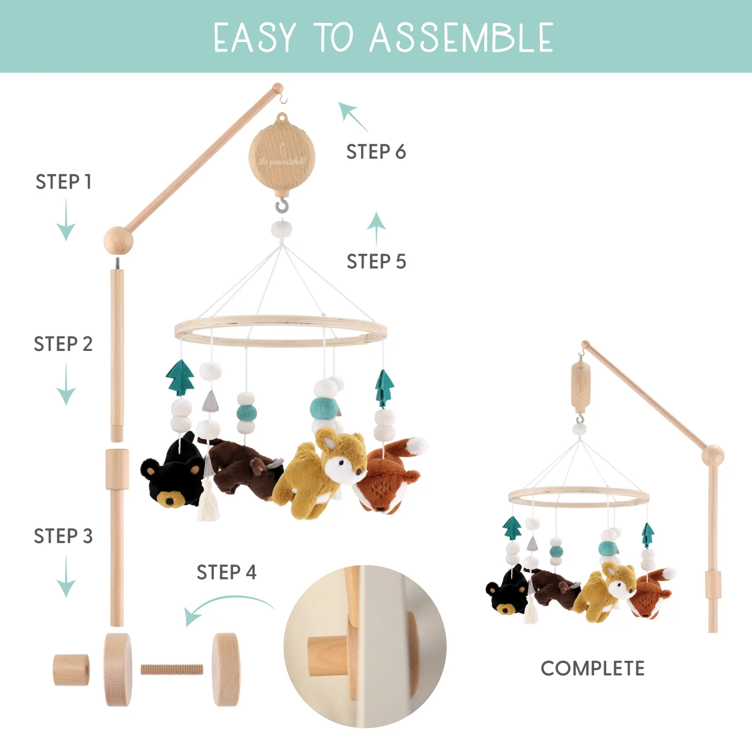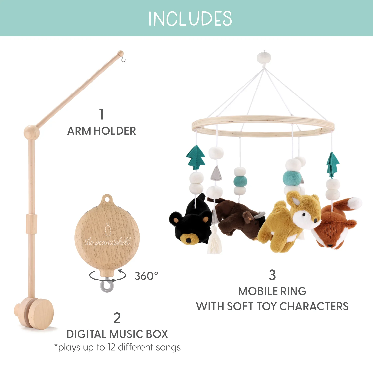 The Western Woods Wooden Musical Mobile from The Peanutshell is an easy-to-install addition to any nursery. An assortment of woodland animals and motifs capture baby’s curiosity and promote visual coordination. The built-in digital music box plays 12 soothing lullabies, helping you effortlessly put baby to sleep. Requires two AA batteries (not included). Pair it with our forest-themed bedding collections to complete your nursery.