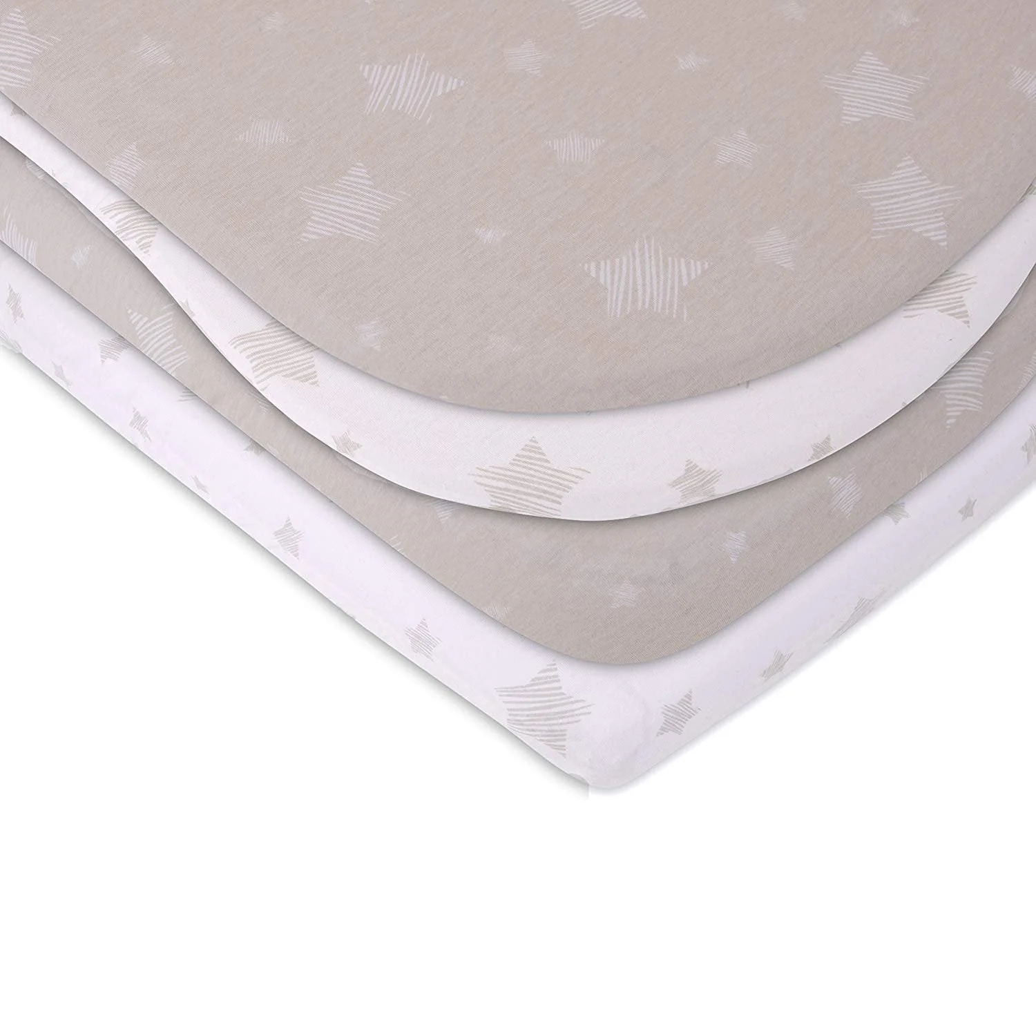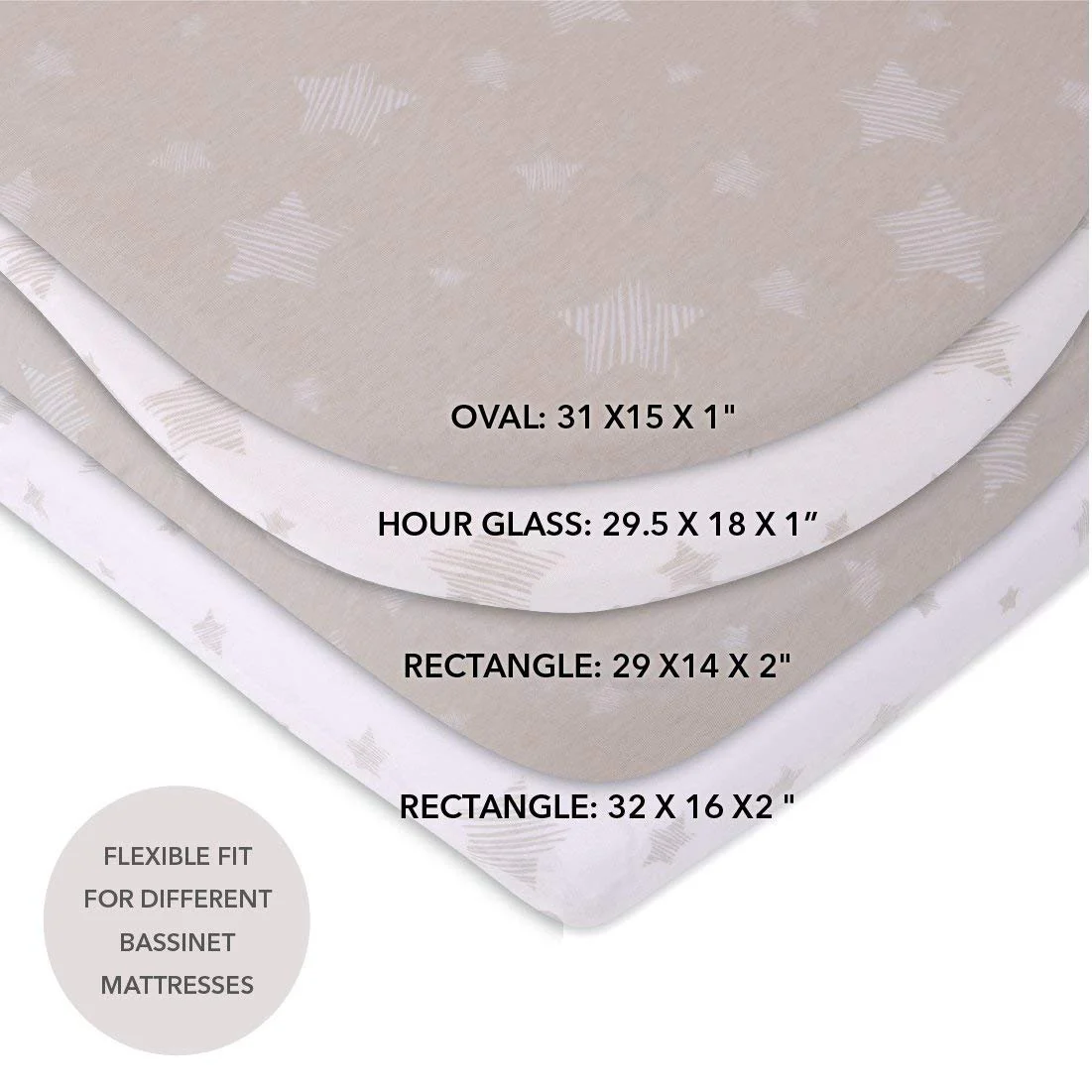 Adaptable Elasticity: Fits Multiple Mattress Sizes Our exceptional product fits all standard Bassinet mattresses as well as Co-sleepers, enabling a great fit on irregular sized mattresses. Our uniquely designed sheet set is equipped with flexible, generous elastic, easily covering your mattress while simultaneously offering a tight seal, enabling a great fit for your mattresses.