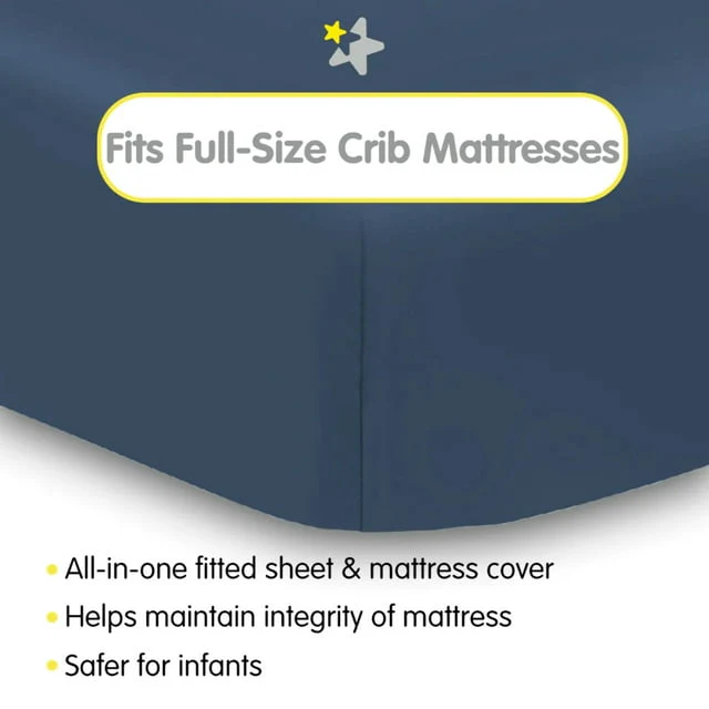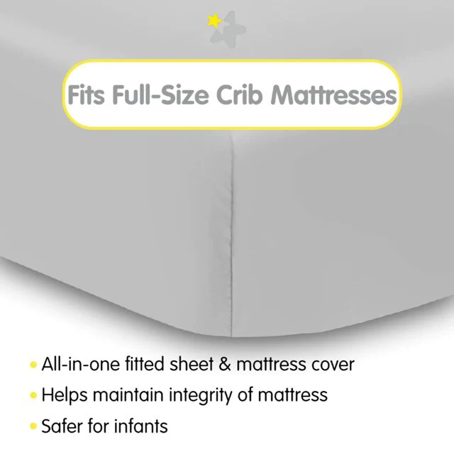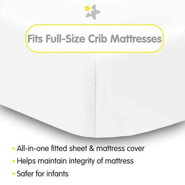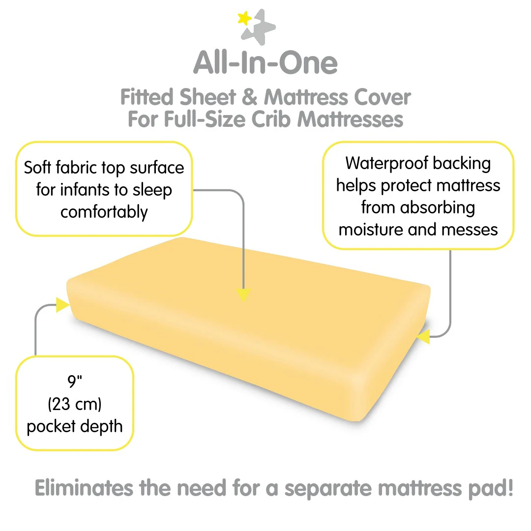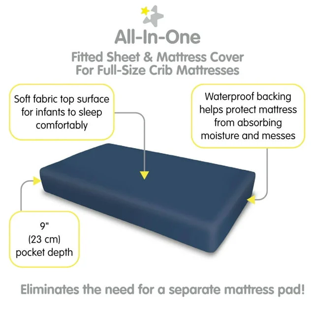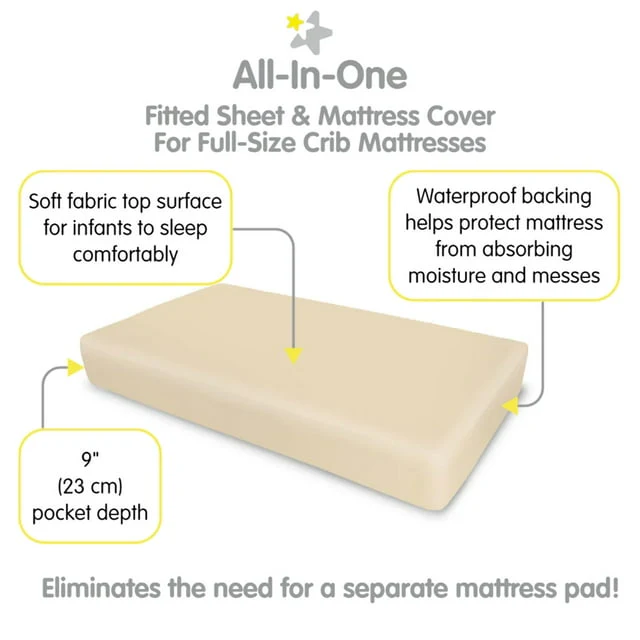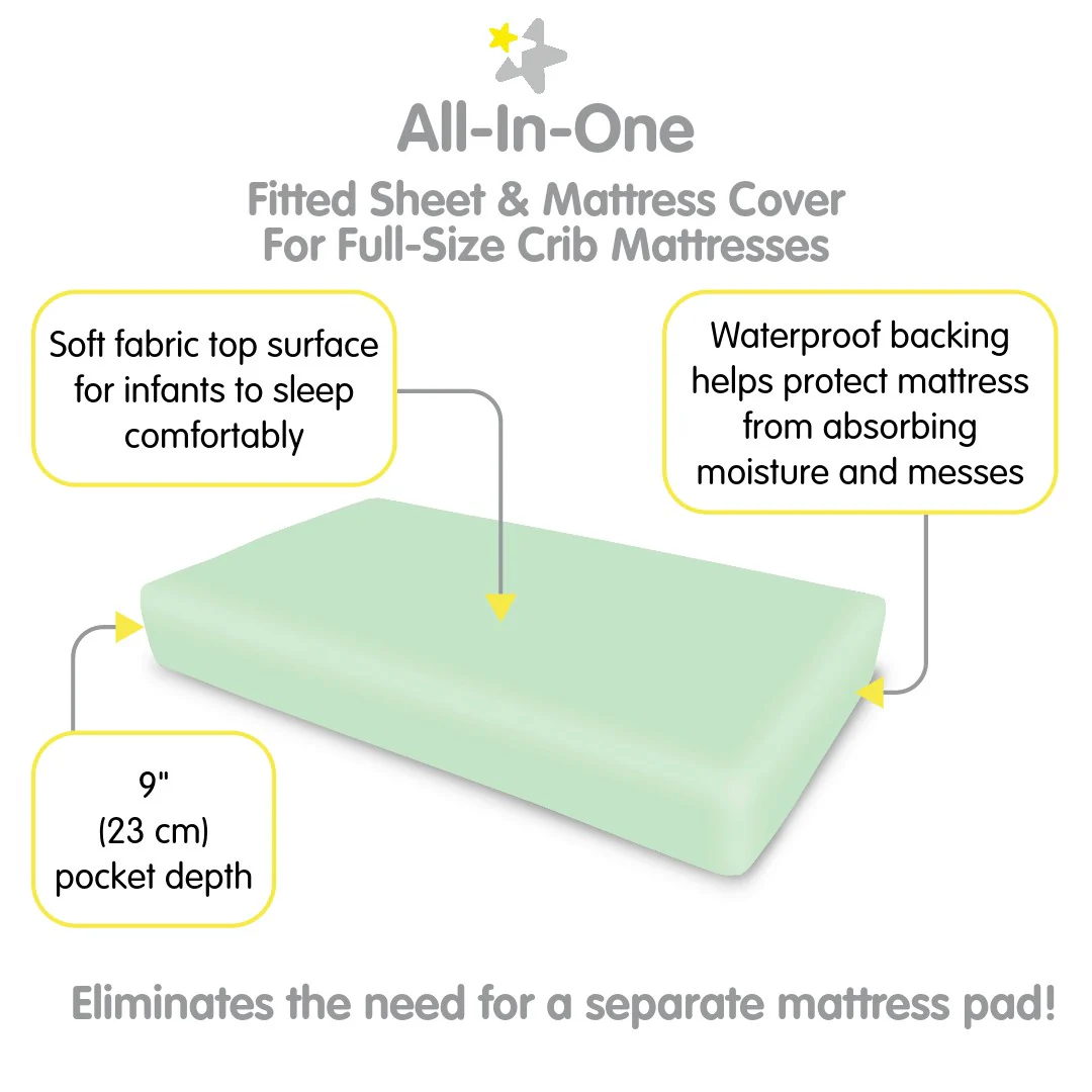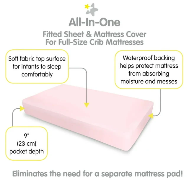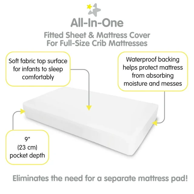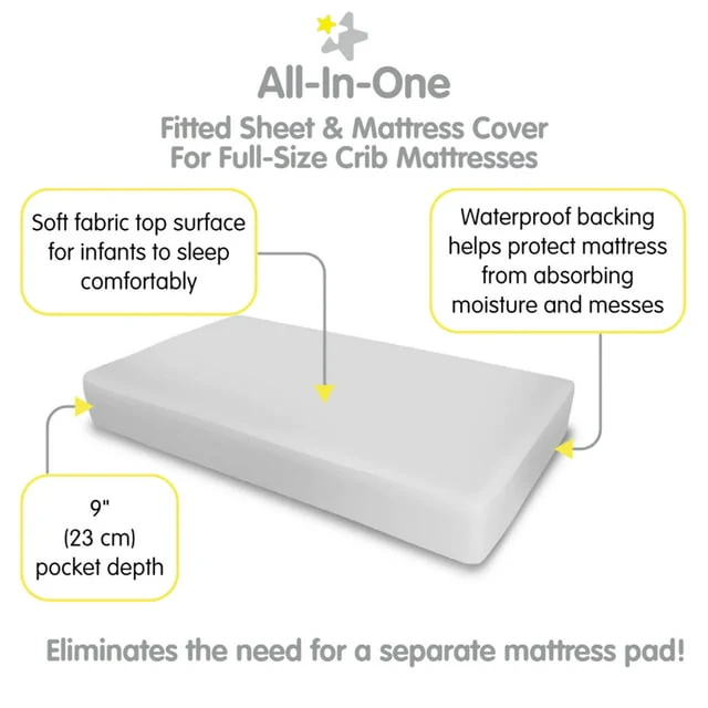 - ALL-IN-ONE FITTED SHEET & MATTRESS COVER: A soft fabric top surface for infants to sleep comfortably while the waterproof backing helps protect the mattress from moisture and messes. No need for a mattress pad.