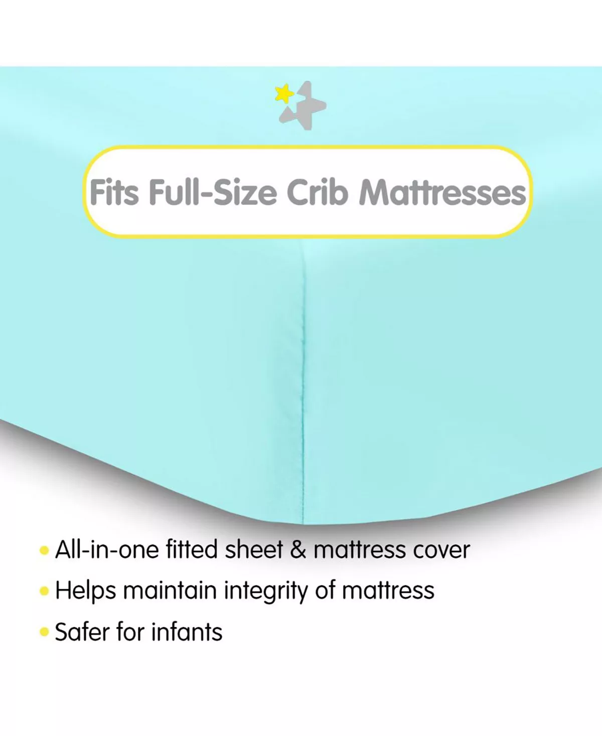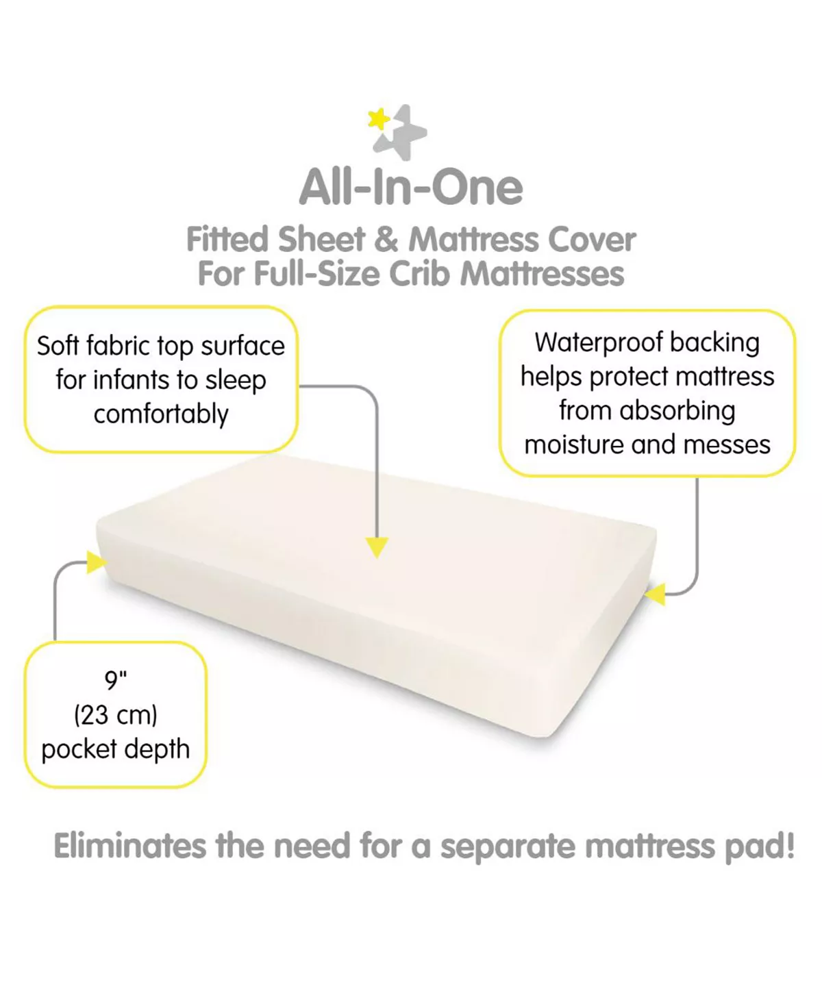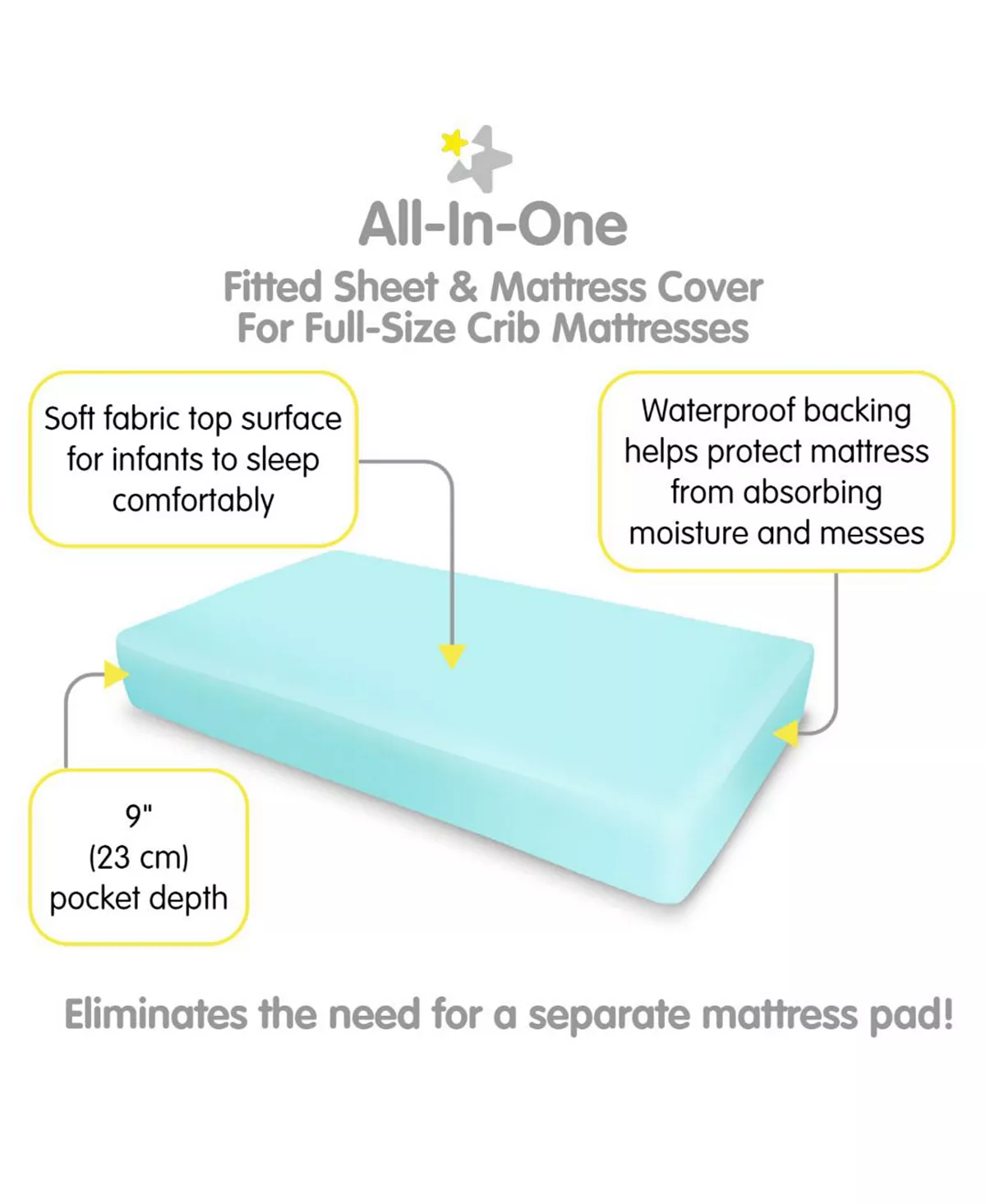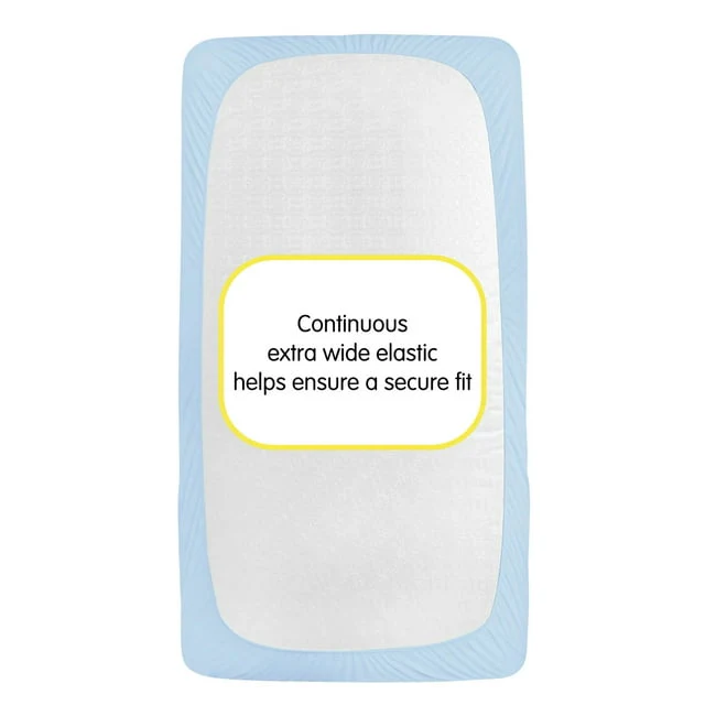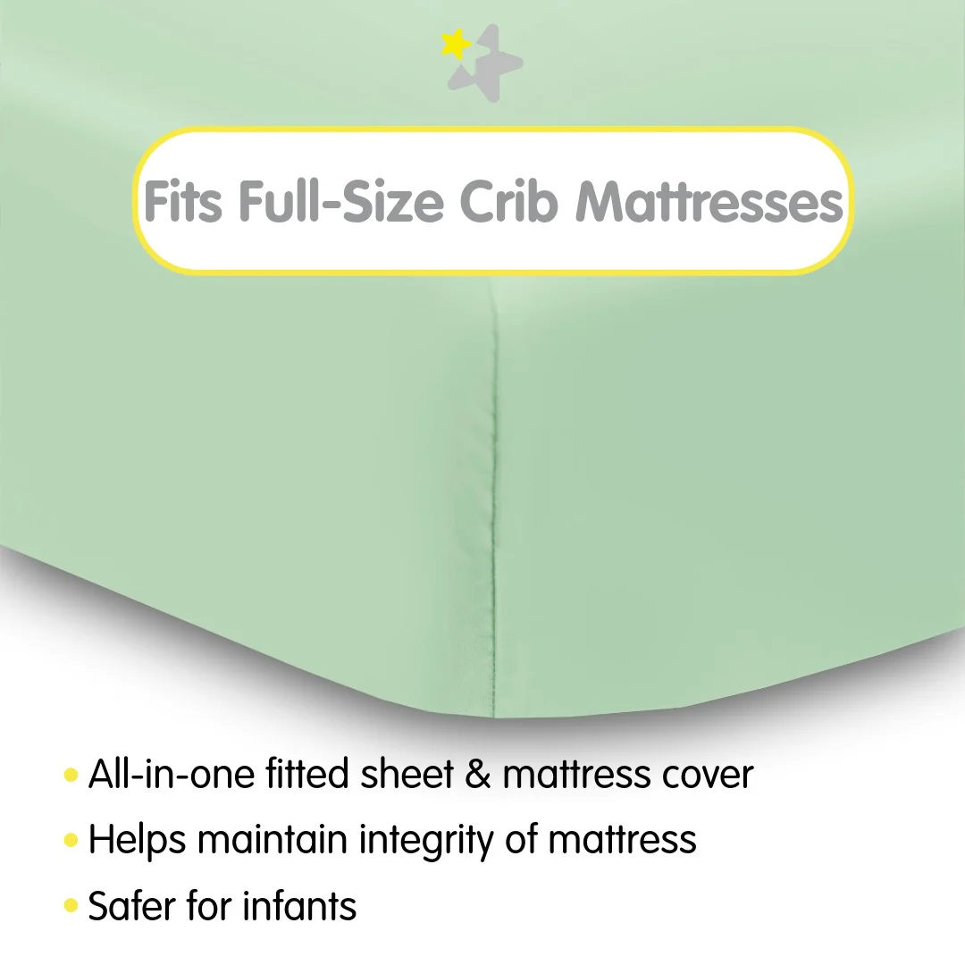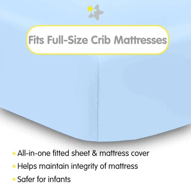- ALL-IN-ONE FITTED SHEET & MATTRESS COVER: A soft fabric top surface for infants to sleep comfortably while the waterproof backing helps protect the mattress from moisture and messes. No need for a mattress pad.