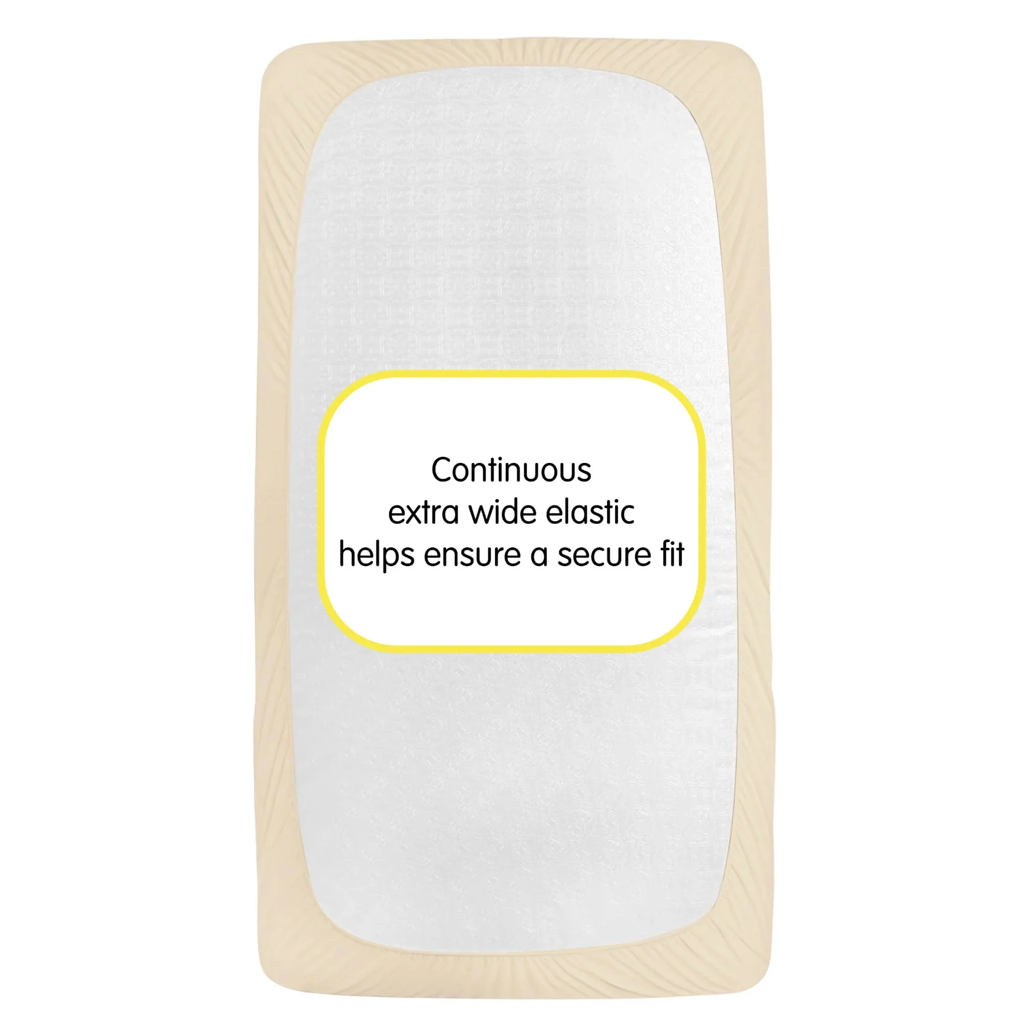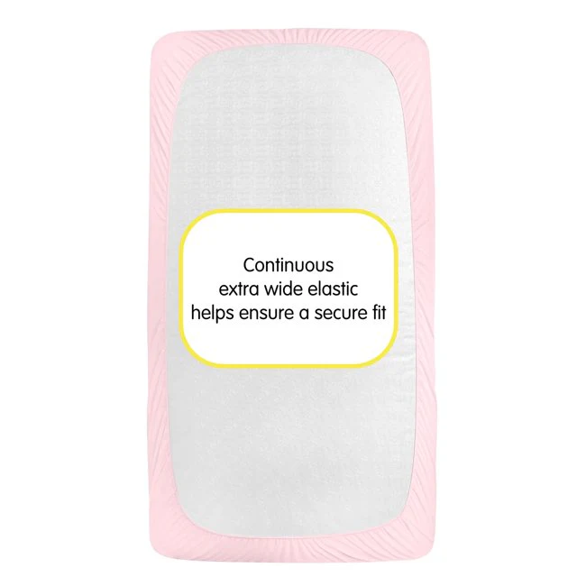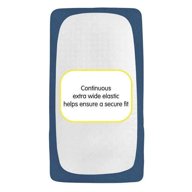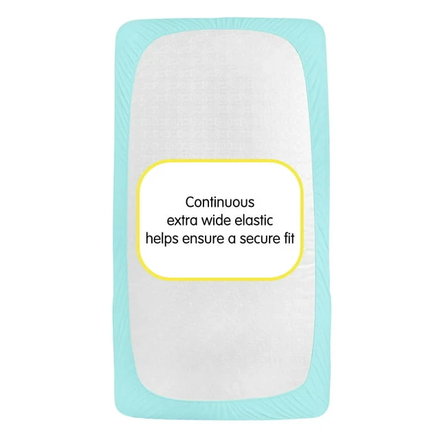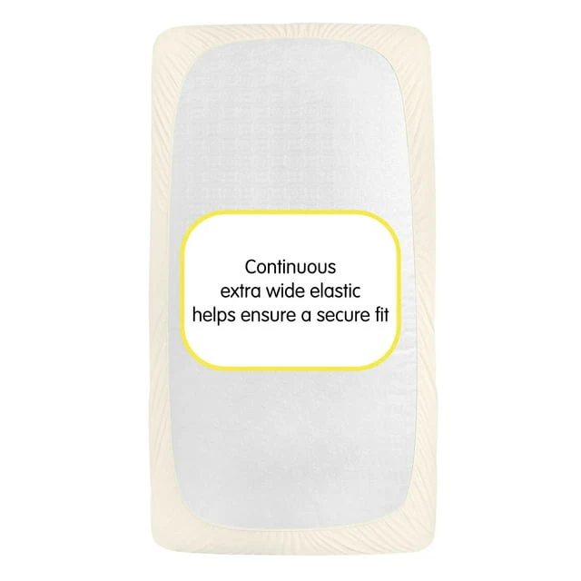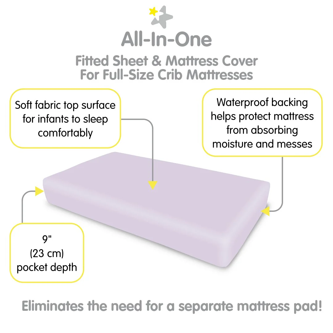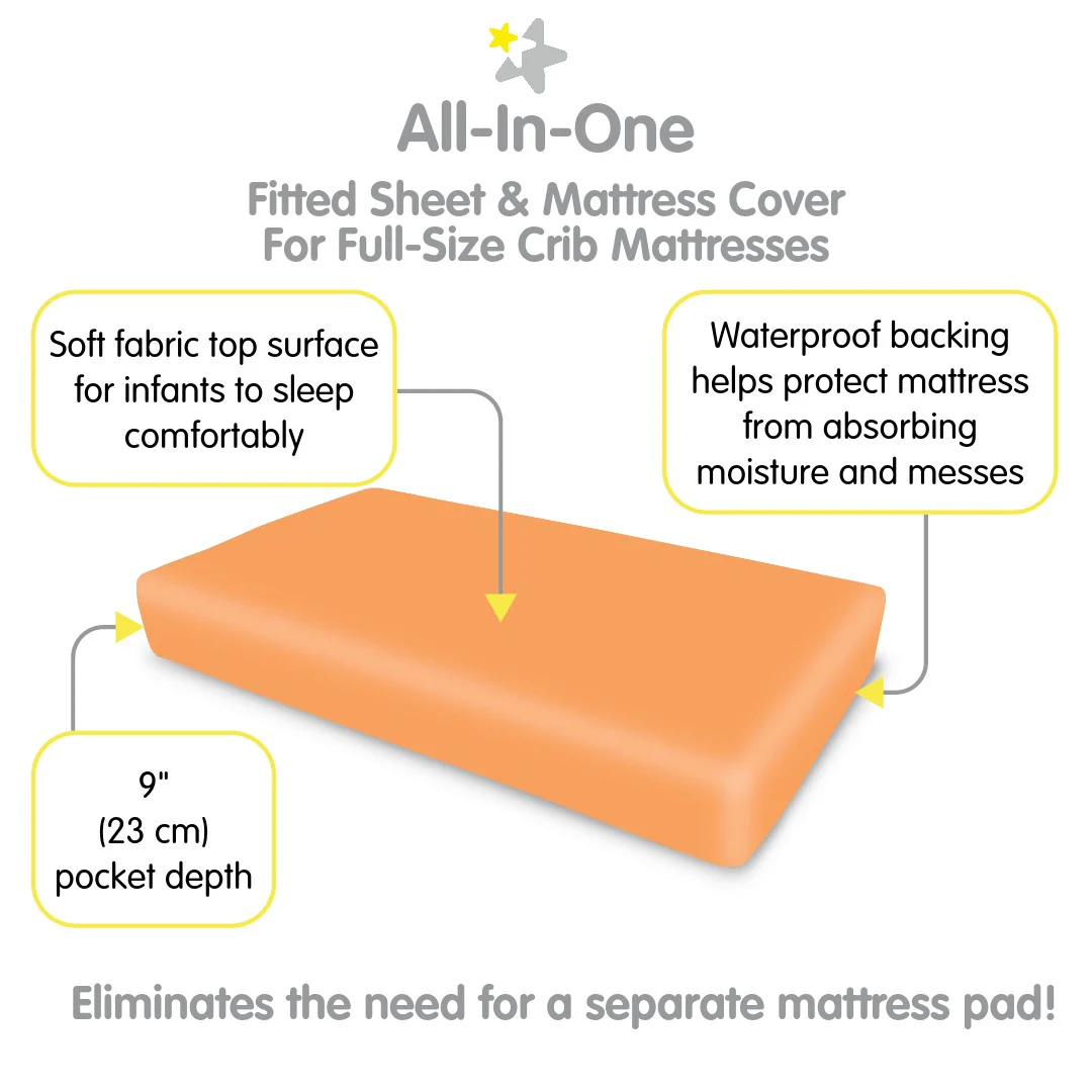 The All-in-One Fitted Sheet & Mattress Cover provides a soft fabric top surface for infants to sleep comfortably while the waterproof backing helps protect the mattress from absorbing moisture and messes.