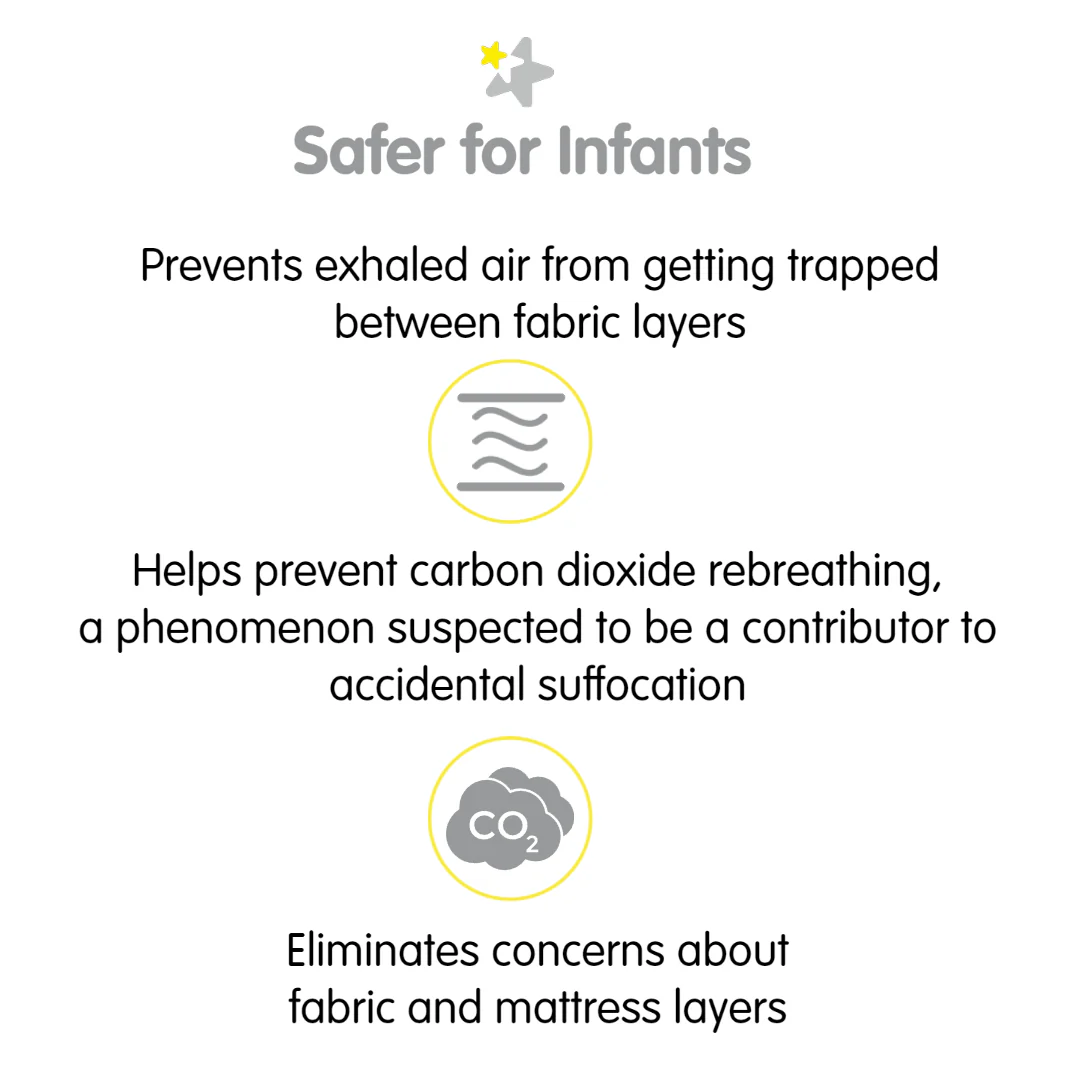- SAFER FOR INFANTS: Helps prevent exhaled air from getting trapped between fabric layers and helps prevent carbon dioxide rebreathing, a phenomenon suspected to be a contributor to accidental suffocation.