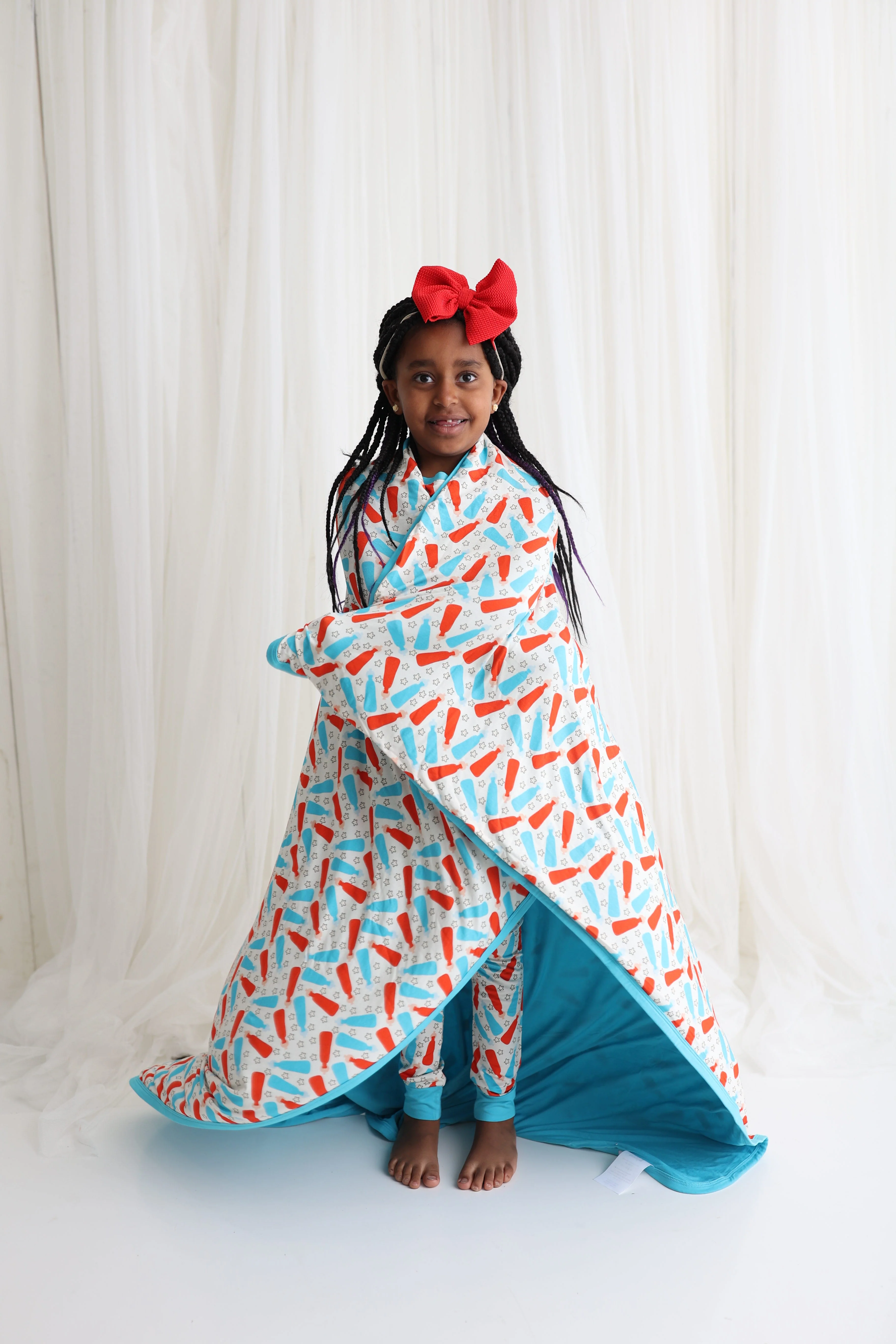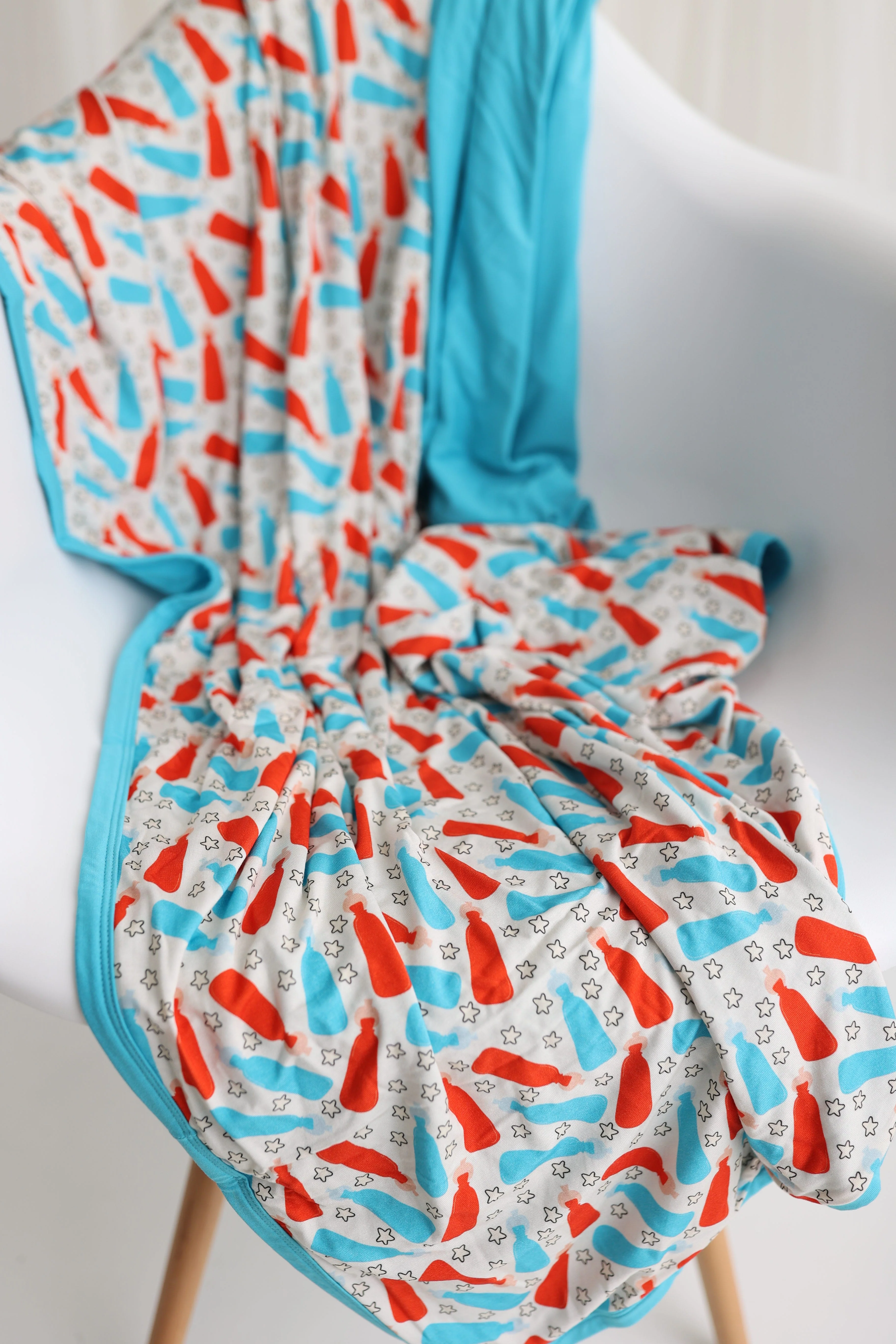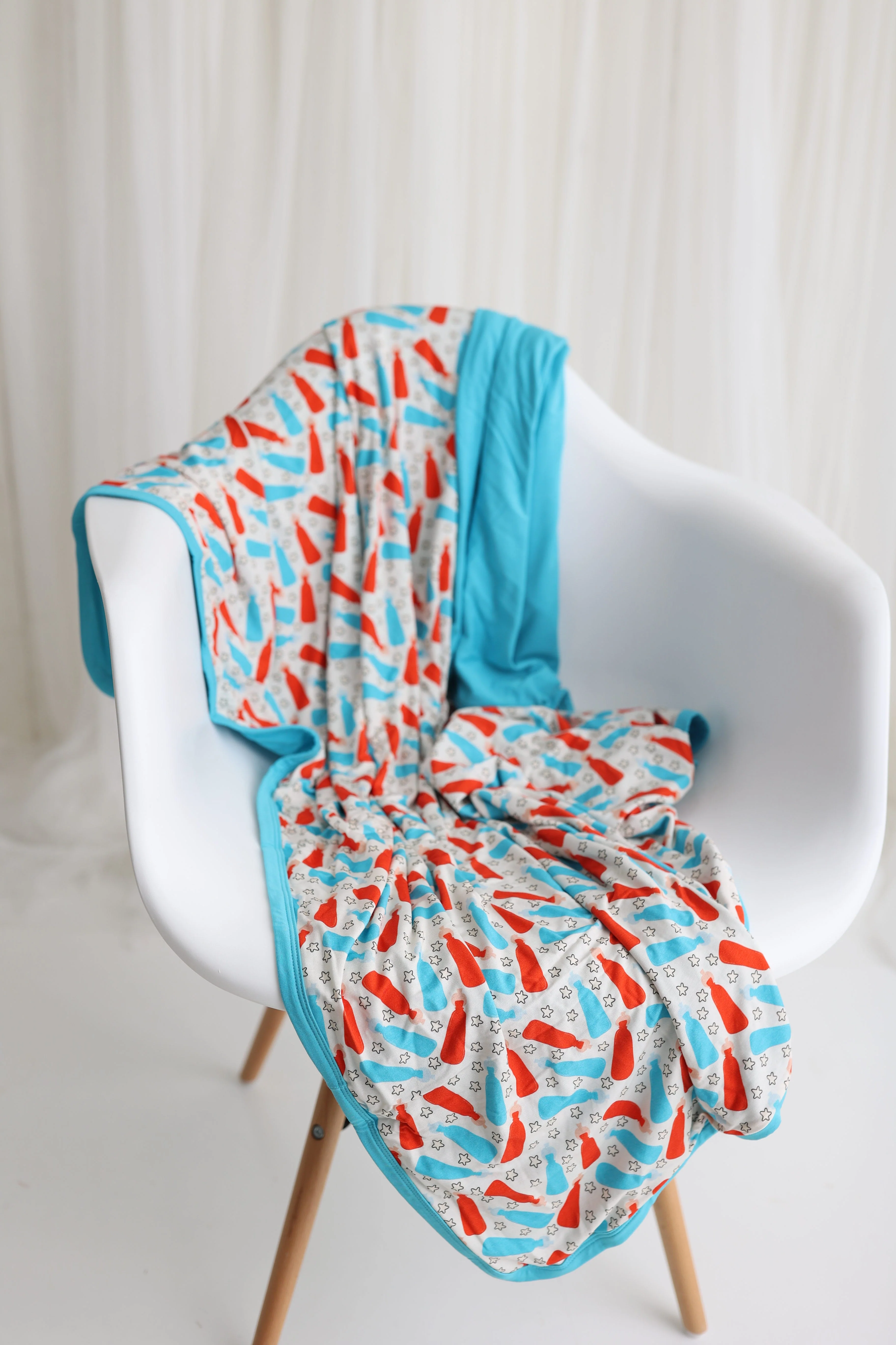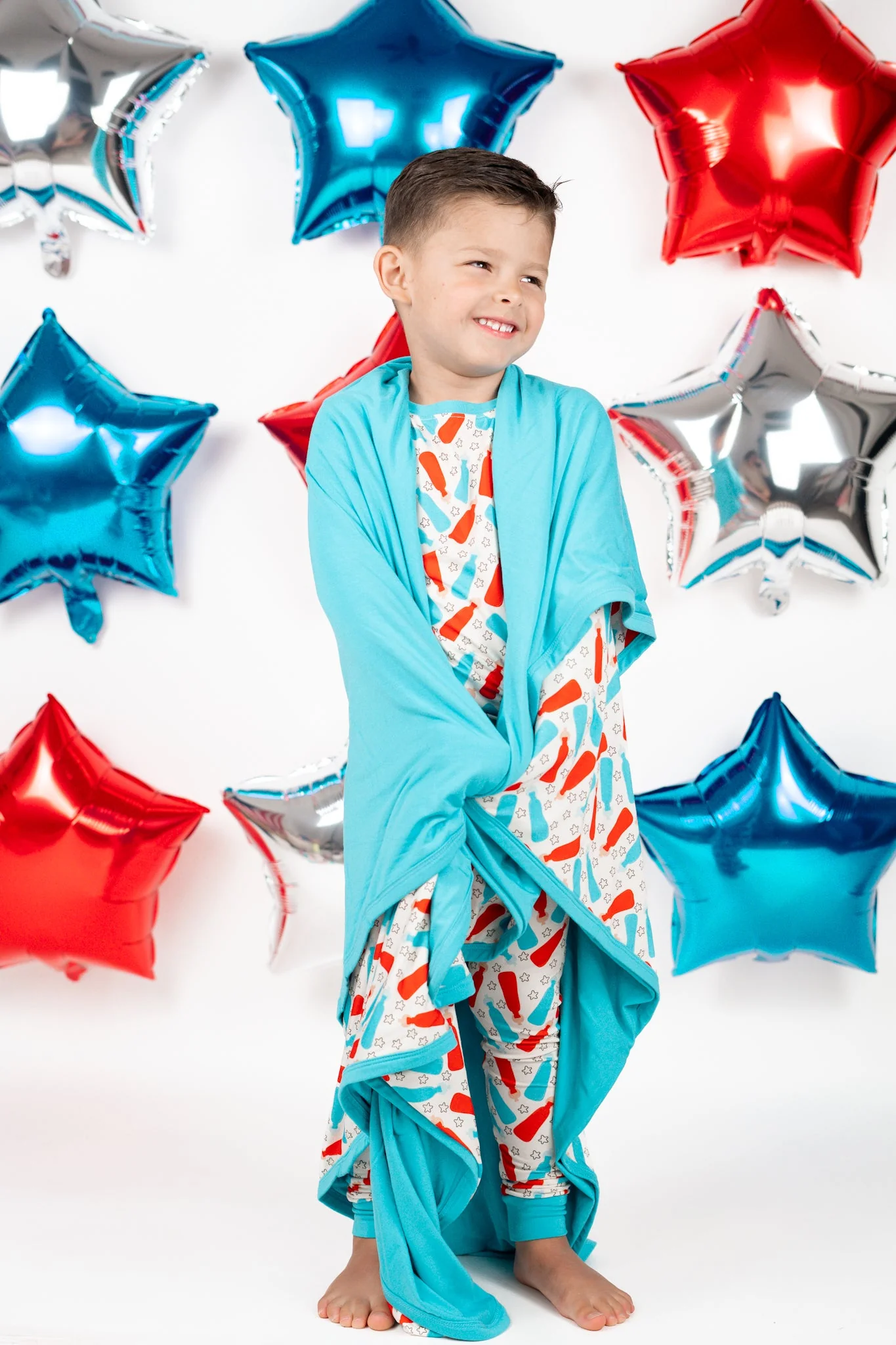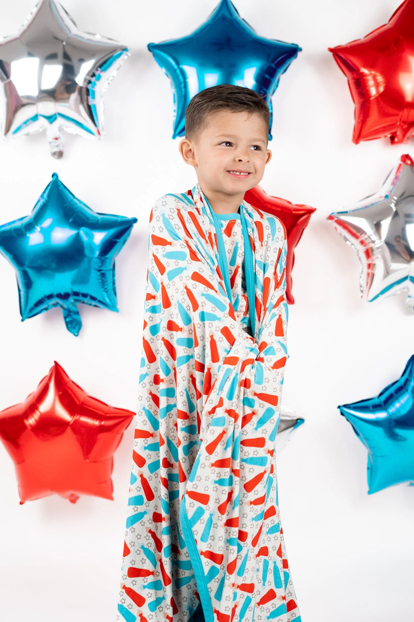 Wrap yourself in a Bursting Red White & Blue Dream Blanket! Made with soft bamboo, this blanket features a fun patriotic print of stars, perfect for celebrating July 4th. Stay cozy and festive with this unique and playful addition to your home.