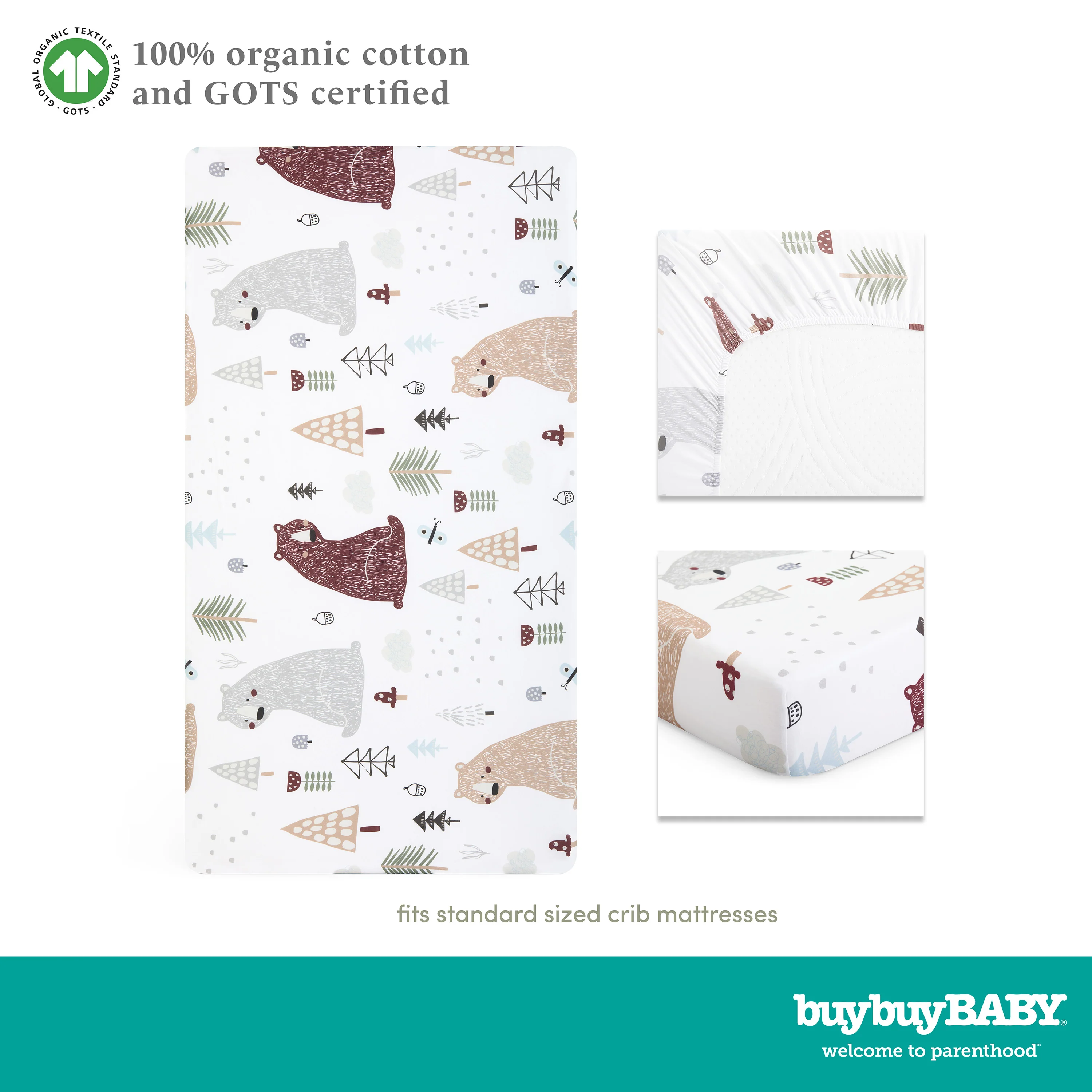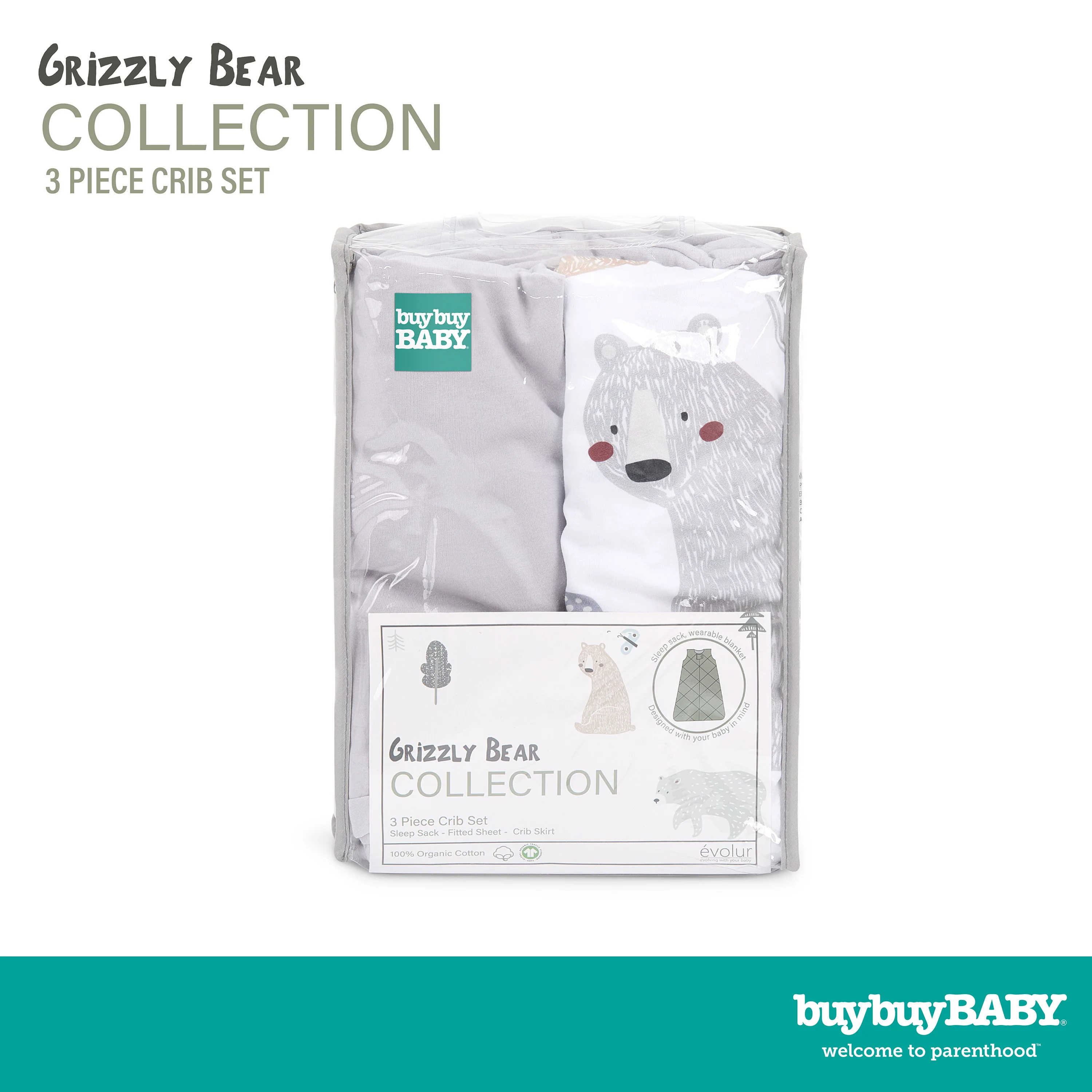 Create a cuddle-worthy space for your little bear with the buybuy BABY by Evolur Grizzly Bear 3 Piece Crib Set. This set includes a sleep bag, fitted sheet, and crib skirt. The sleep sack replaces a traditional comforter, promoting safe sleep practices to reduce the risk of SIDS. Crafted from 100% organic cotton and GOTS certified, these bedding essentials ensure a cozy sleep environment for your little cub. Embracing adventure, this set is available in Rockey Grey with Bear Print.