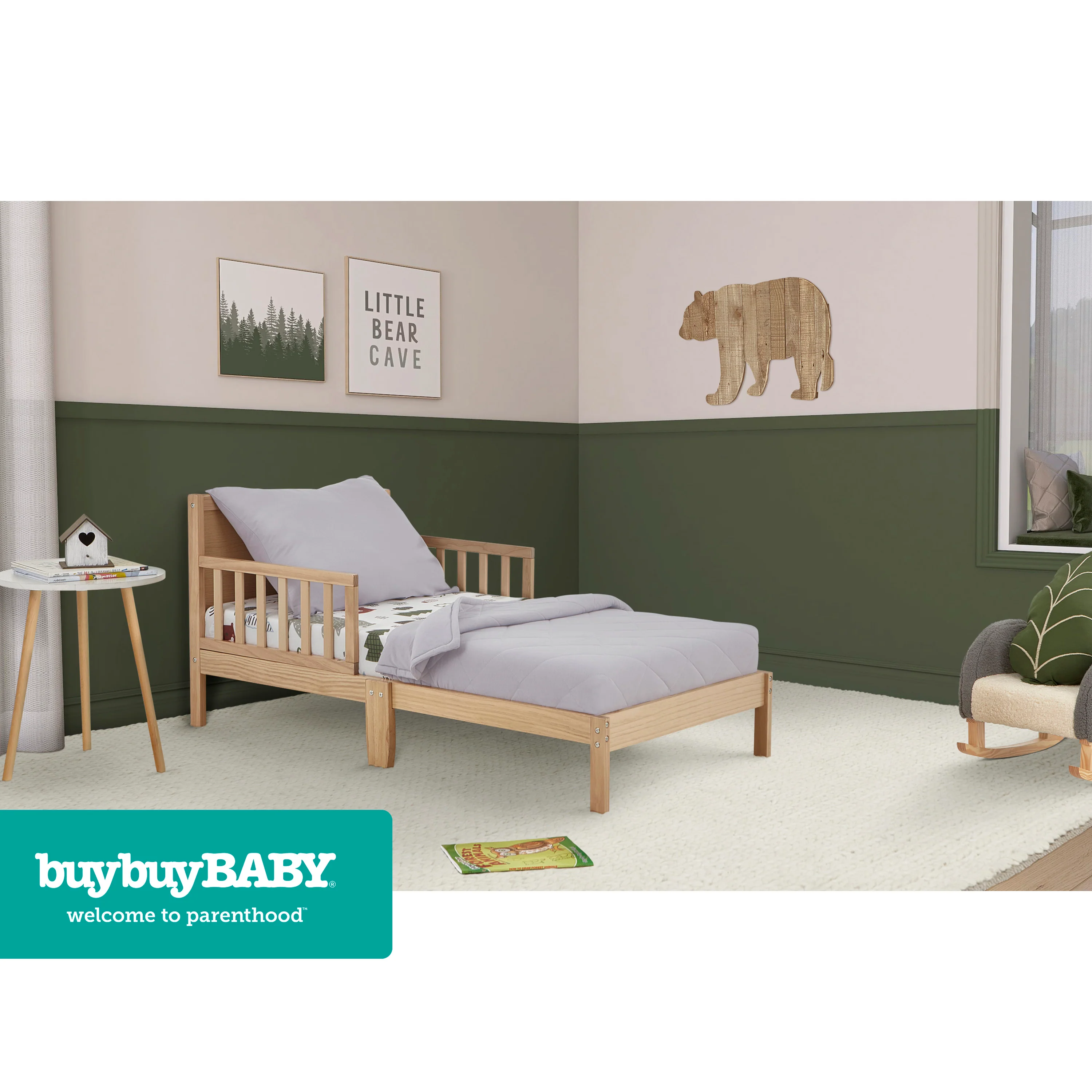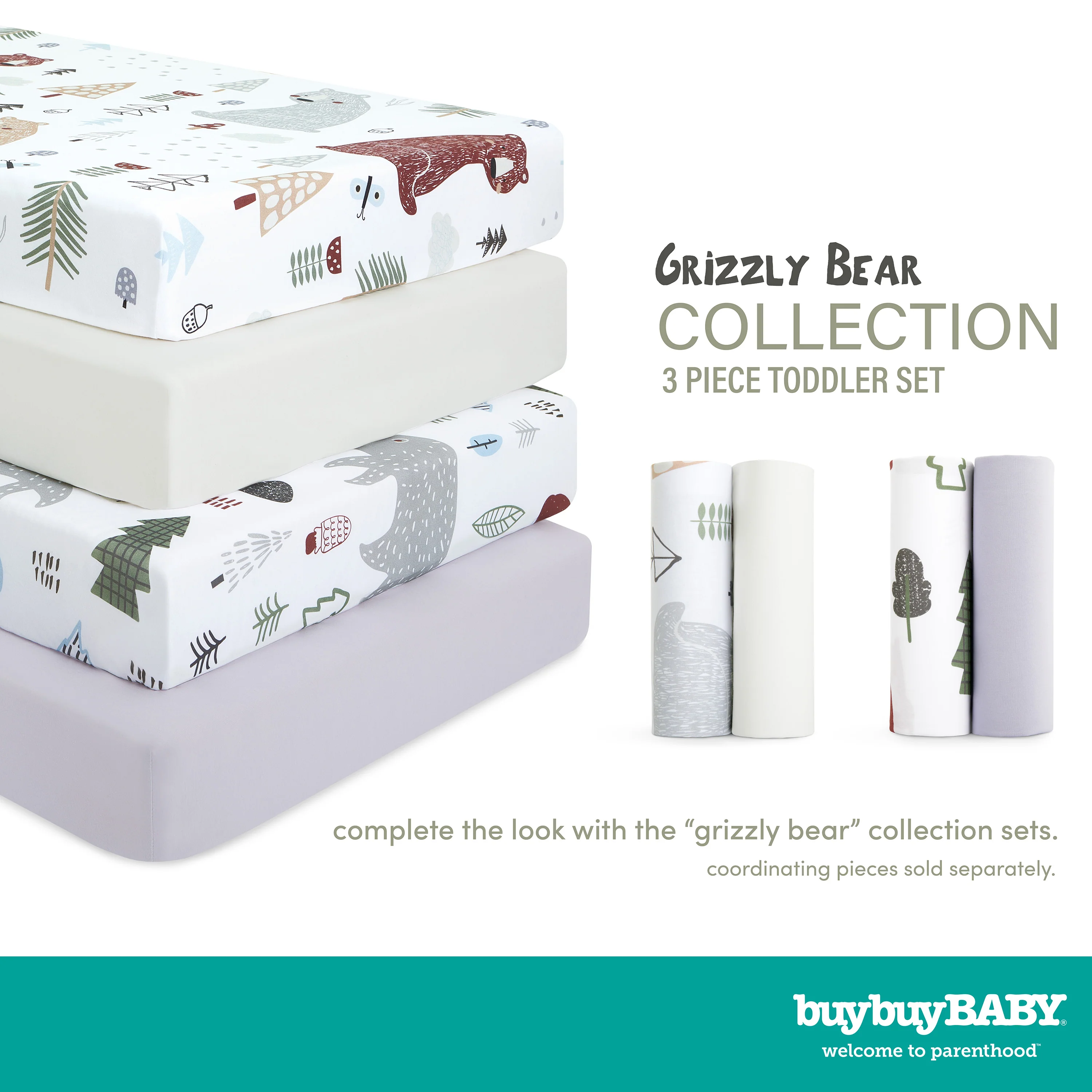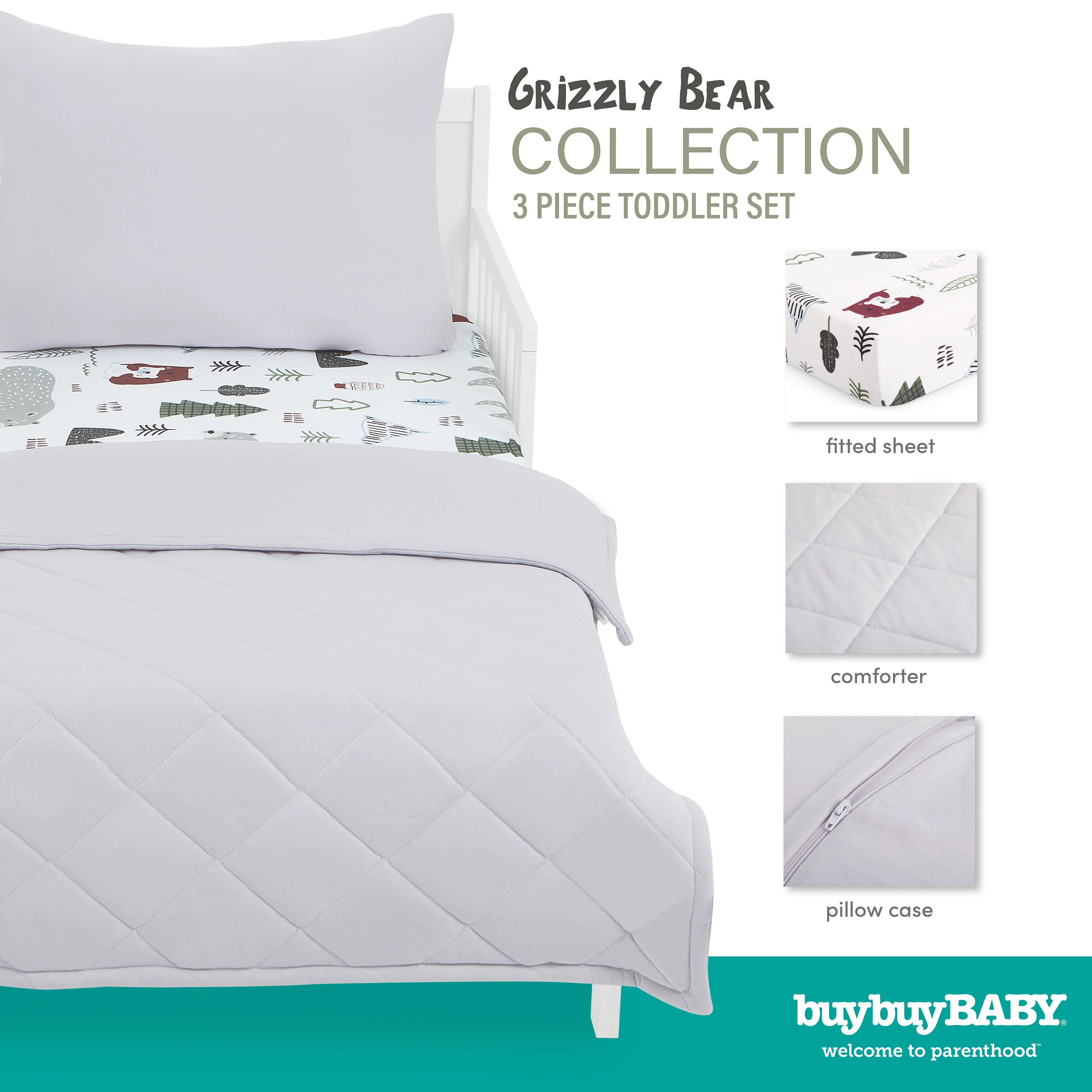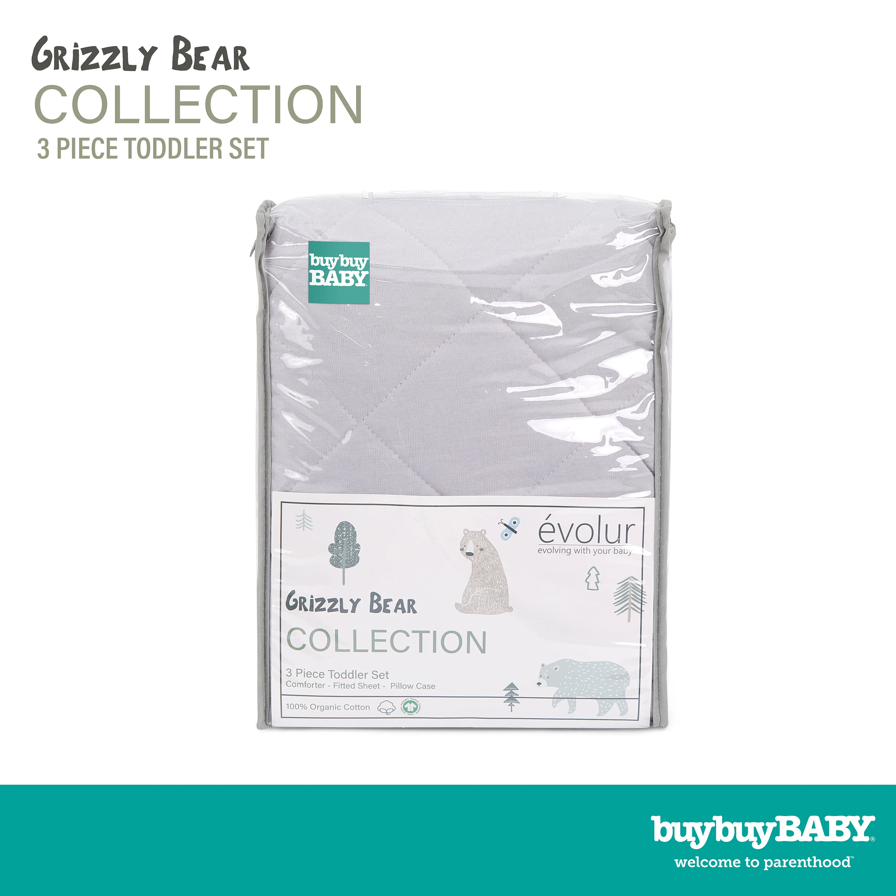 - TODDLER BFF: Transition your toddler to a fun big kid bed with the buybuy BABY by Evolur Grizzly Bear 3 Piece Toddler Set. This set includes a comforter, fitted sheet & a pillowcase with a zipper for added safety.