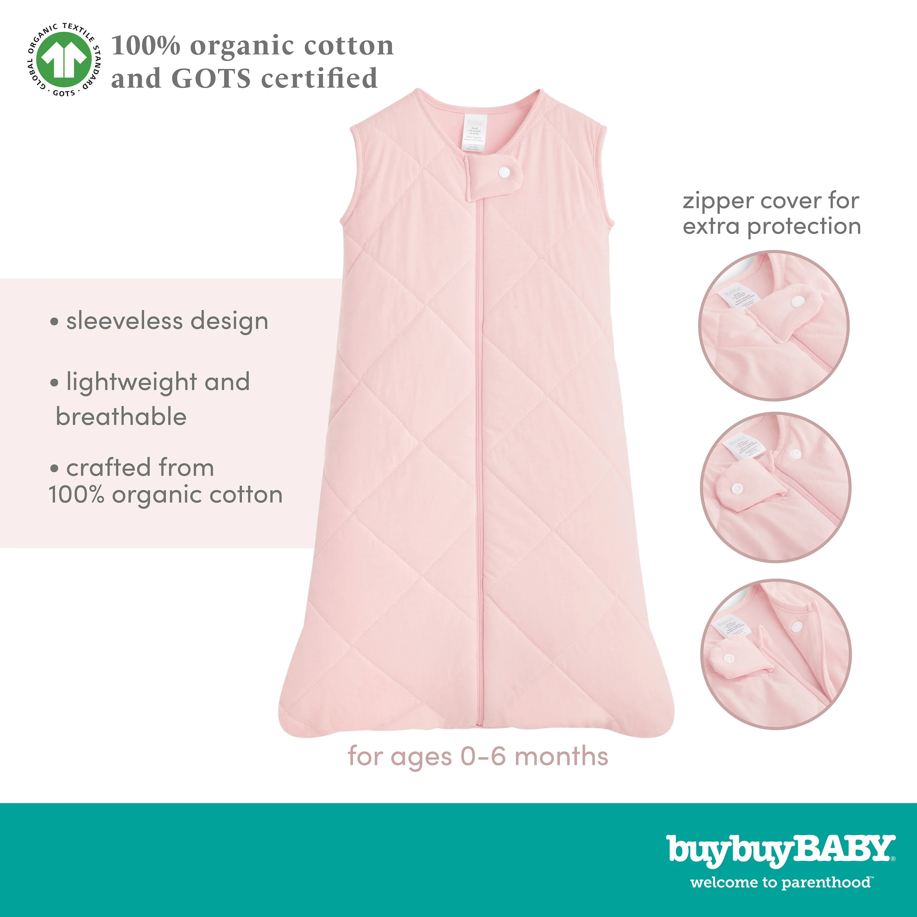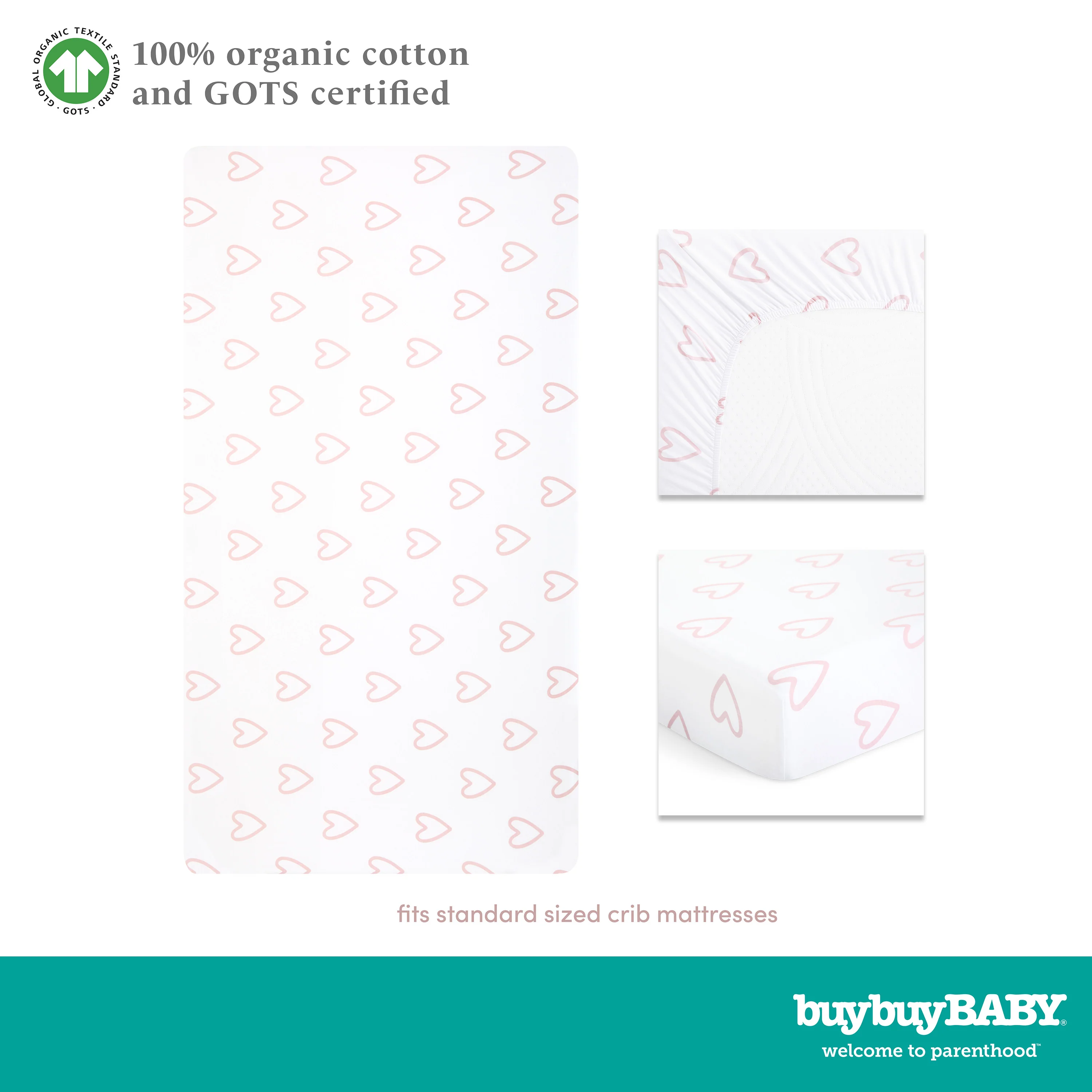 The buybuy BABY by Evolur I Heart You 3 Piece Crib Set includes a sleep bag, fitted sheet, and crib skirt. The sleep sack replaces a traditional comforter, promoting safe sleep practices to reduce the risk of SIDS. Crafted from 100% organic cotton, GOTS certified & packaged with zero-waste, this crib set is a must-have. Fill your space with love - available in adorable heart prints in baby pink.
