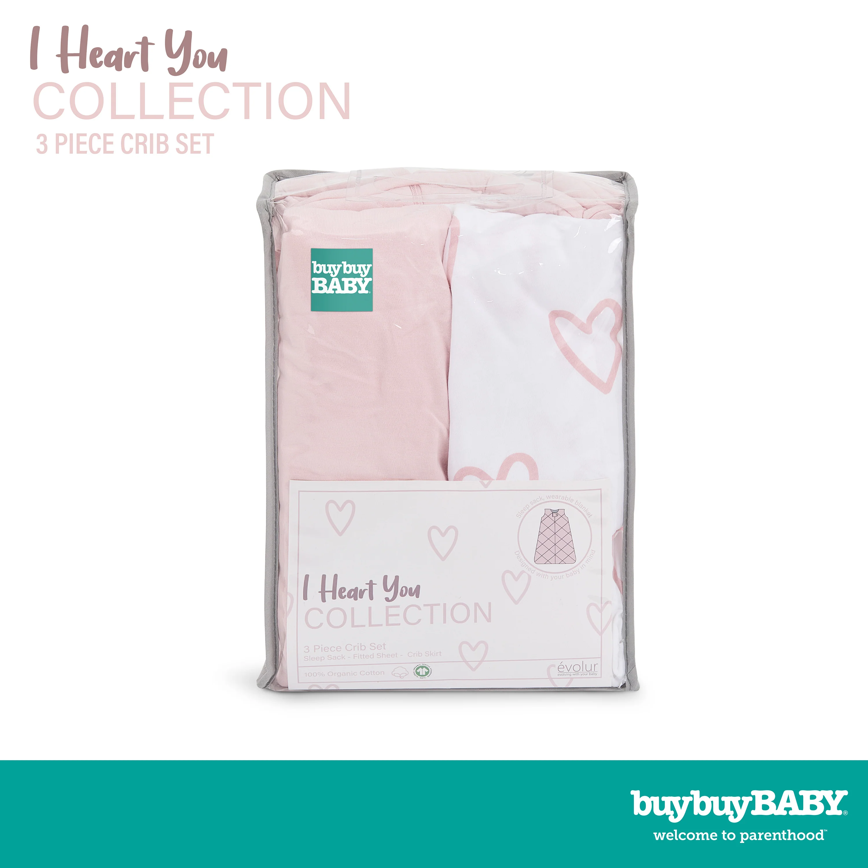 - DREAMY SLEEP SPACE: The buybuy BABY by Evolur I Heart You 3 Piece Crib Set includes a sleep bag, fitted sheet, and crib skirt. The sleep sack replaces a traditional comforter, promoting safe sleep practices to reduce the risk of SIDS