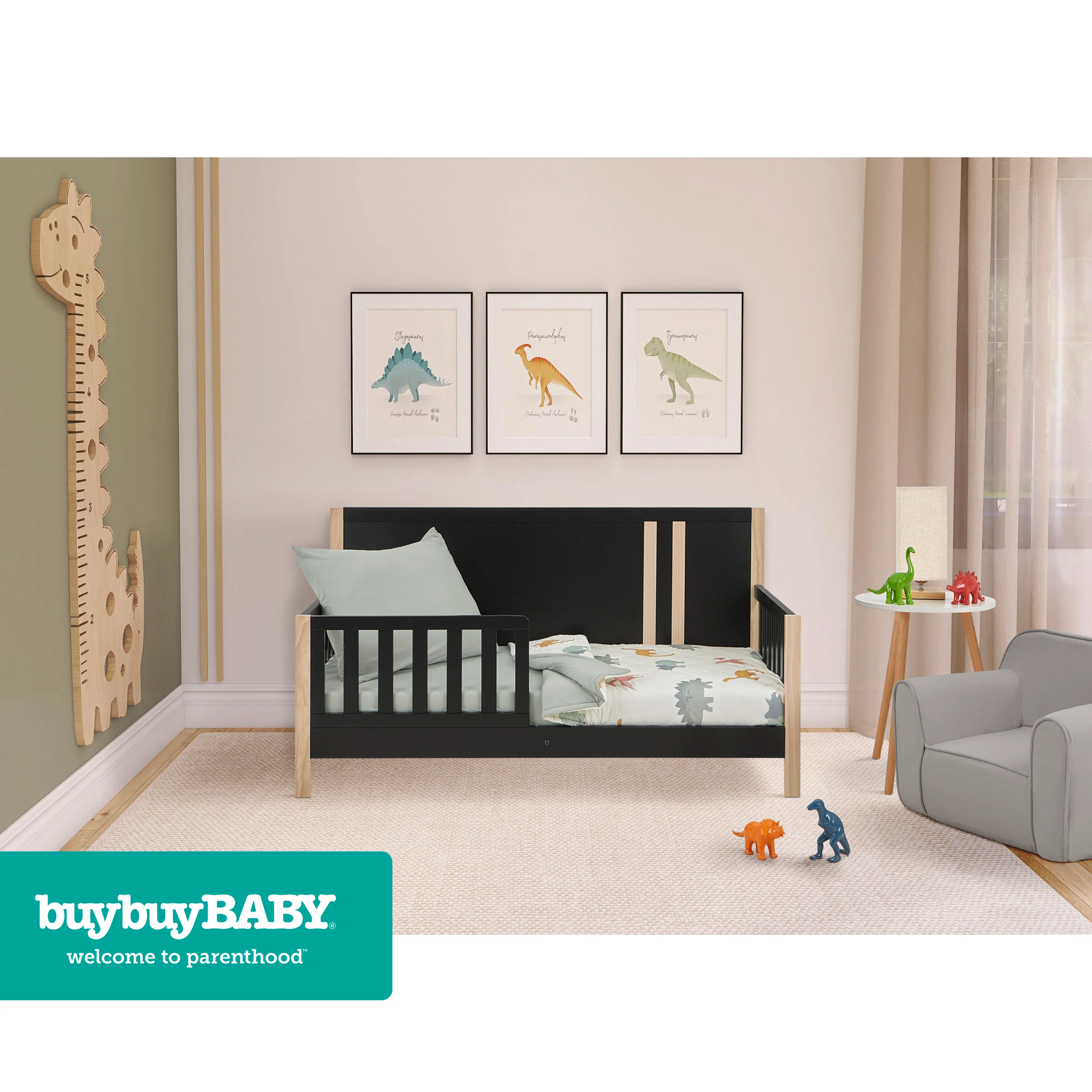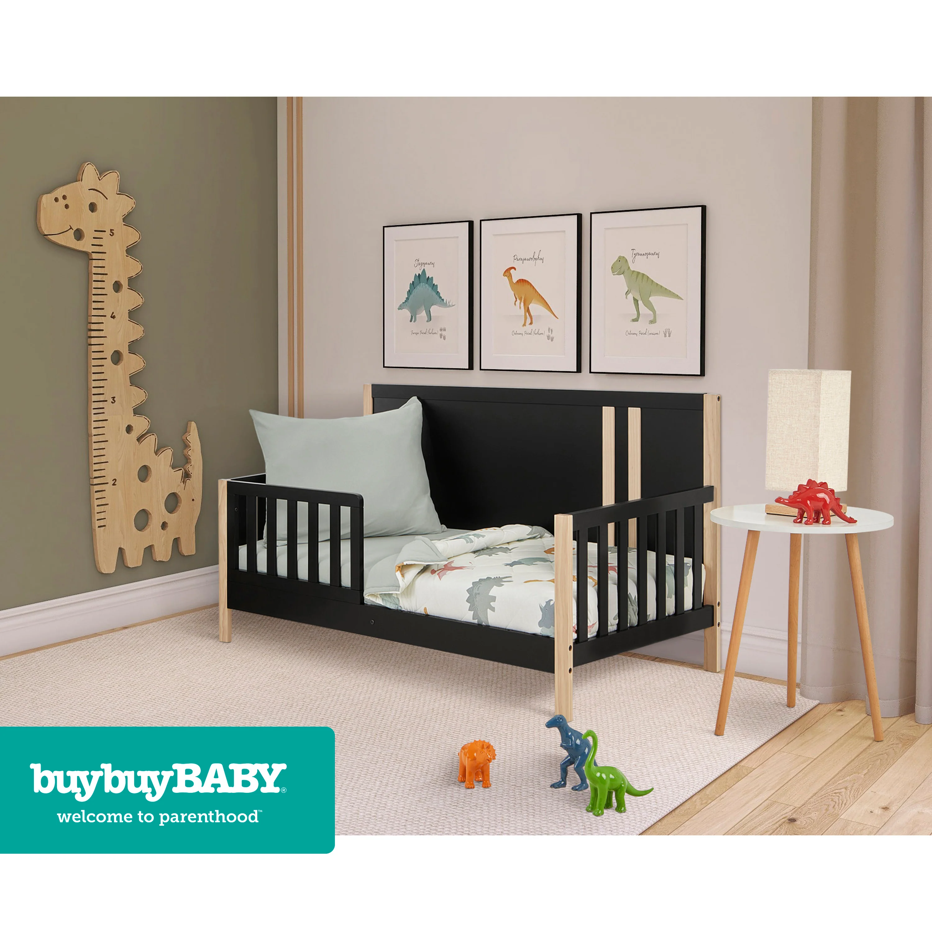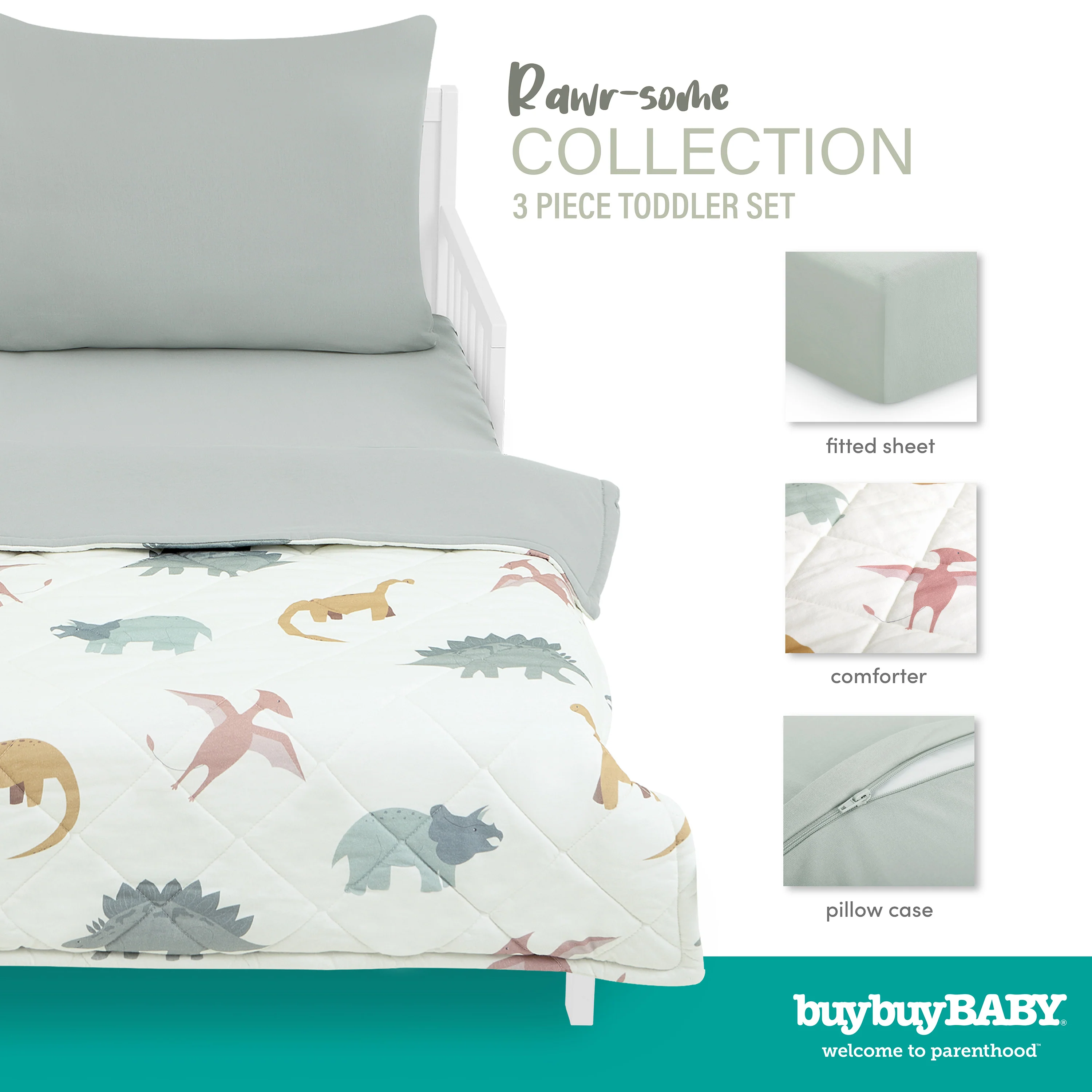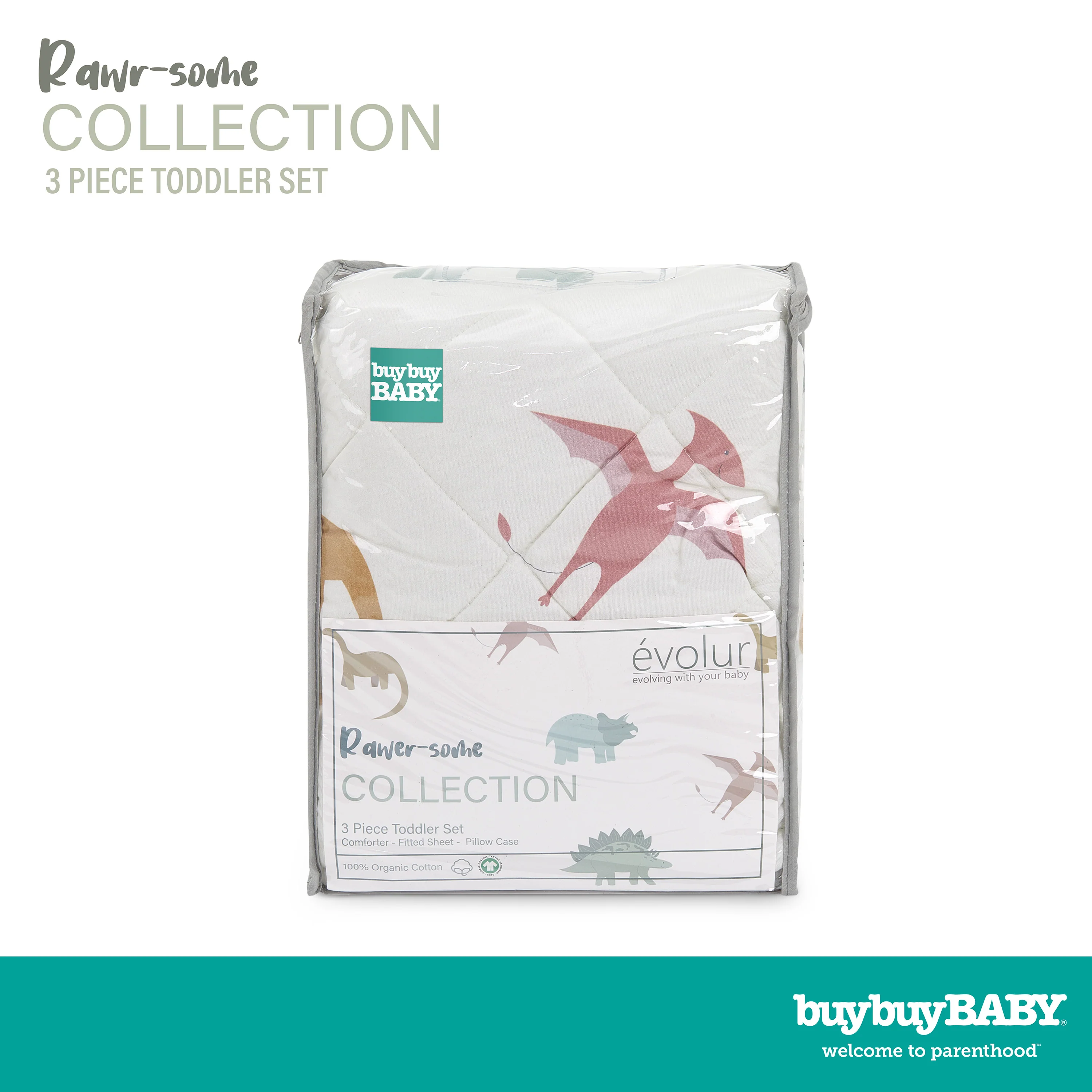 - TODDLER BFF: Transition your toddler to their big kid bed with the buybuy BABY by Evolur Rawr Some 3 Piece Toddler Set. This set includes a soft pillowcase with a zipper for added safety, a cozy comforter, and a fitted sheet.