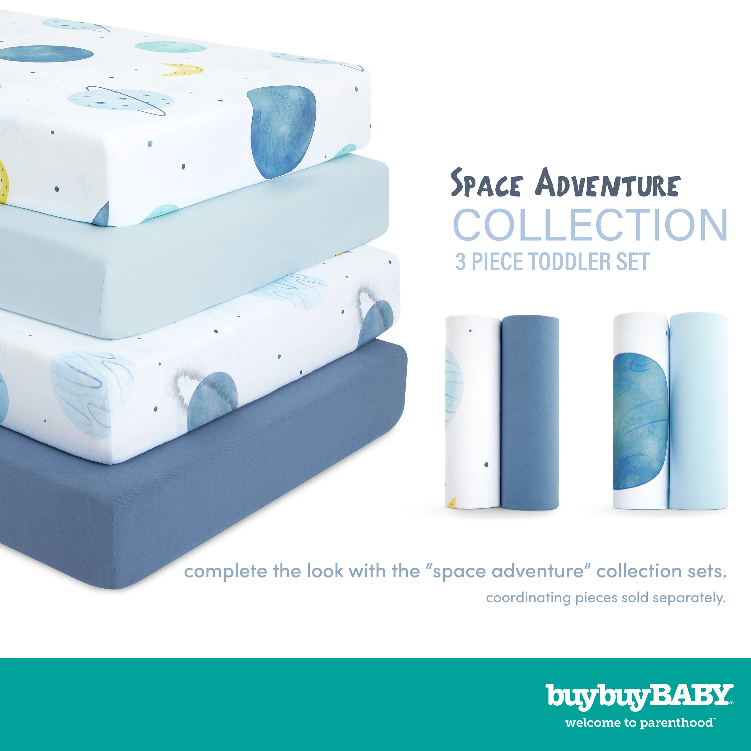 - TODDLER BFF: Transition your toddler to a big kid bed with buybuy BABY by Evolur Space Adventure 3 Piece Toddler Set. This set includes a pillowcase designed with a zipper for added safety, a comforter, and fitted sheet.
