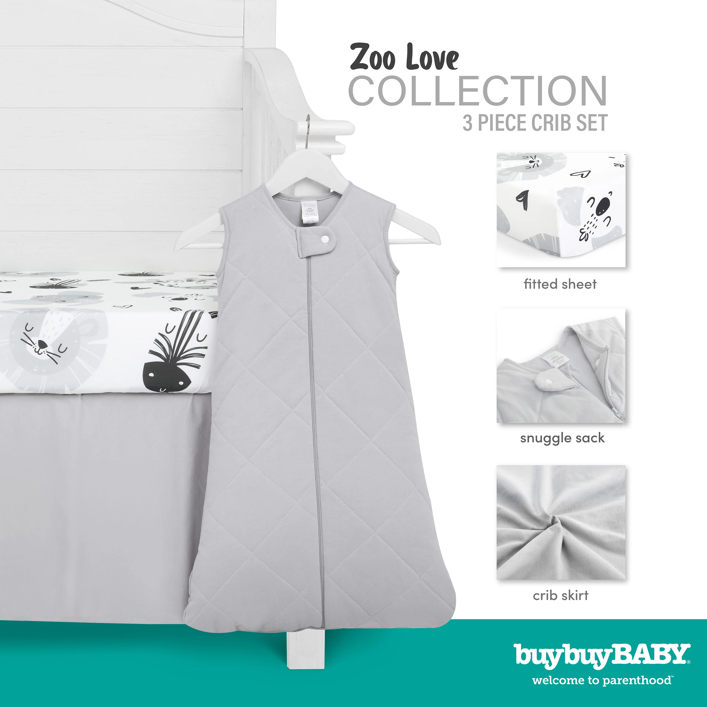 Create a wild and adventurous nursery with the buybuy BABY by Evolur Zoo Love 3 Piece Crib Set. This set includes a sleep bag, fitted sheet, and crib skirt. The sleep sack replaces a traditional comforter, promoting safe sleep practices to reduce the risk of SIDS. Crafted from 100% organic cotton and GOTS certified, these bedding essentials ensure a cozy sleep environment for your little cub. Embracing fun, this set features playful animal prints in glacier grey.