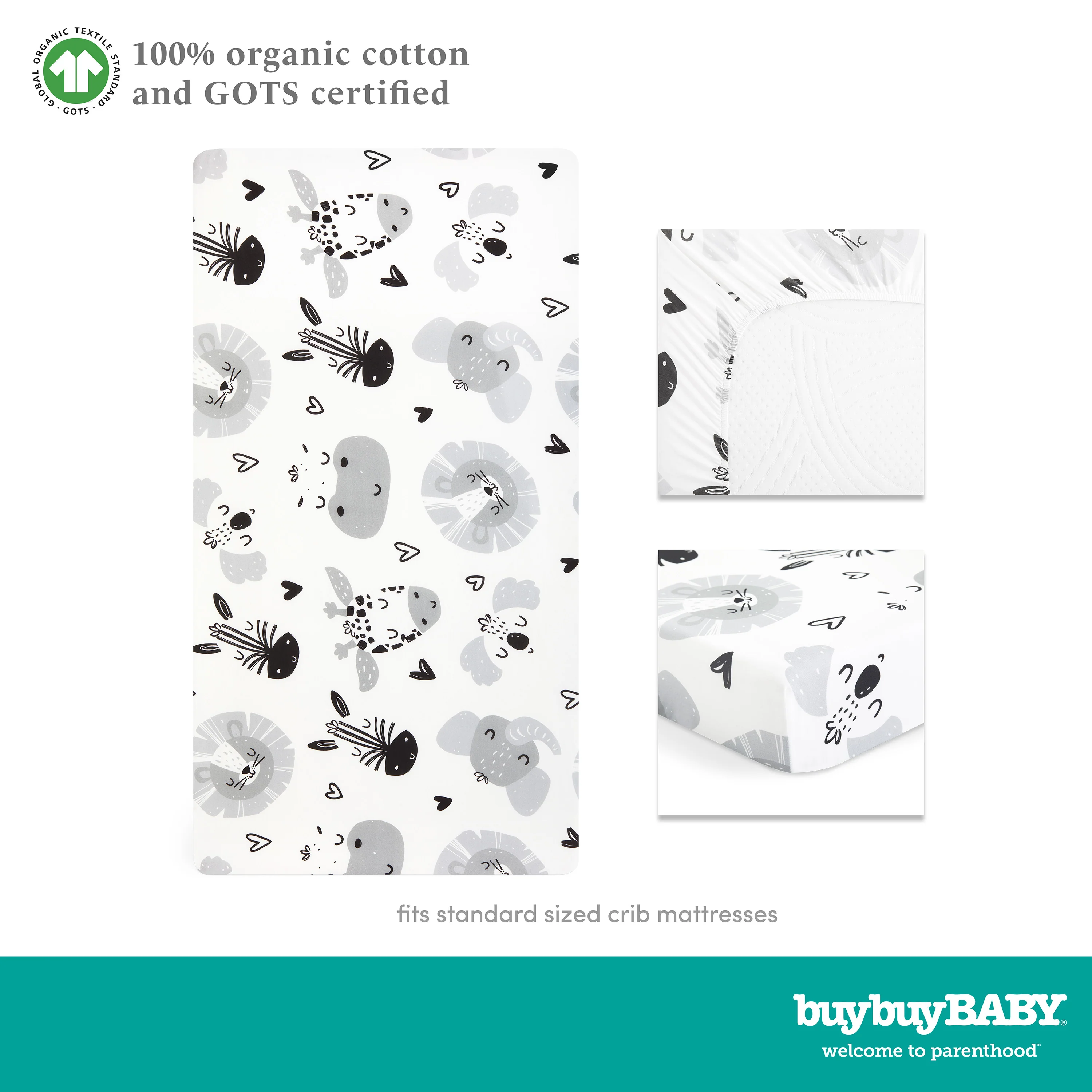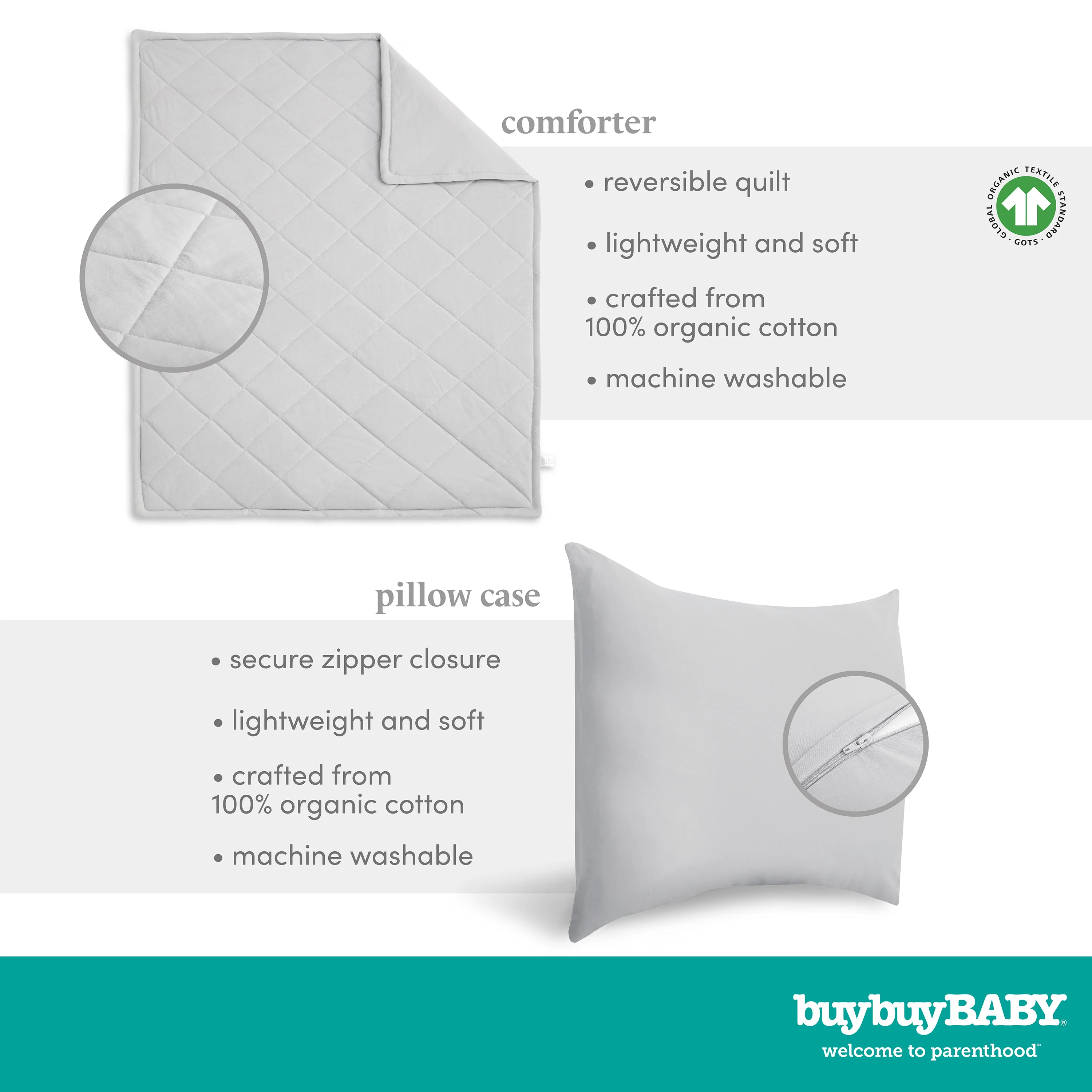 Transition your toddler to a fun big kid bed with the buybuy BABY by Evolur Zoo Love 3 Piece Toddler Set. This set includes a comforter, fitted sheet & a pillowcase with a zipper for added safety. Crafted from 100% organic cotton and GOTS certified, these bedding essentials ensure a cozy sleep environment for your little cub. Embracing fun, this set features playful animal prints in glacier grey.