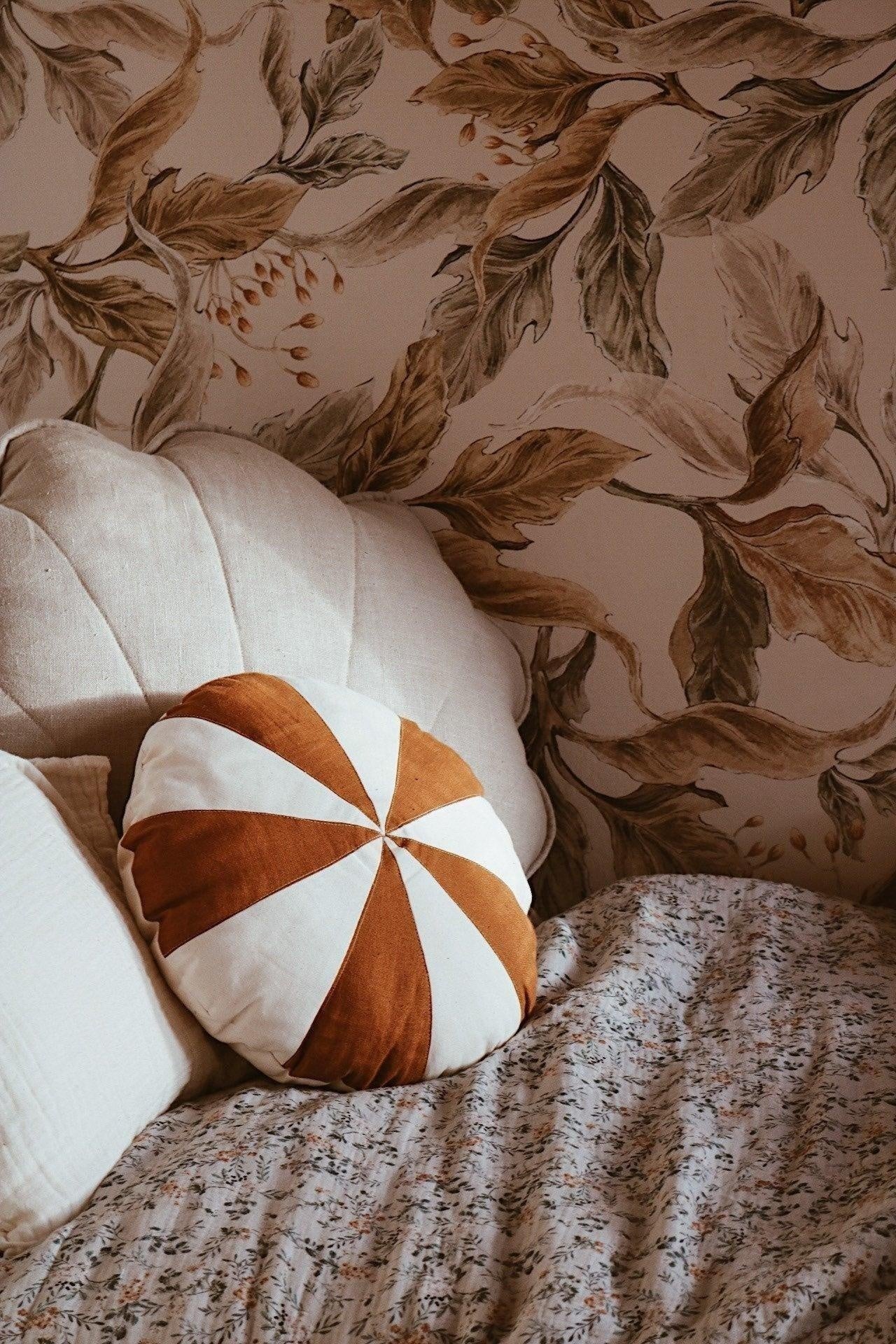This candy-pattern patchwork cushion is sewn from high-quality caramel-and-cream-colored linen and cotton.