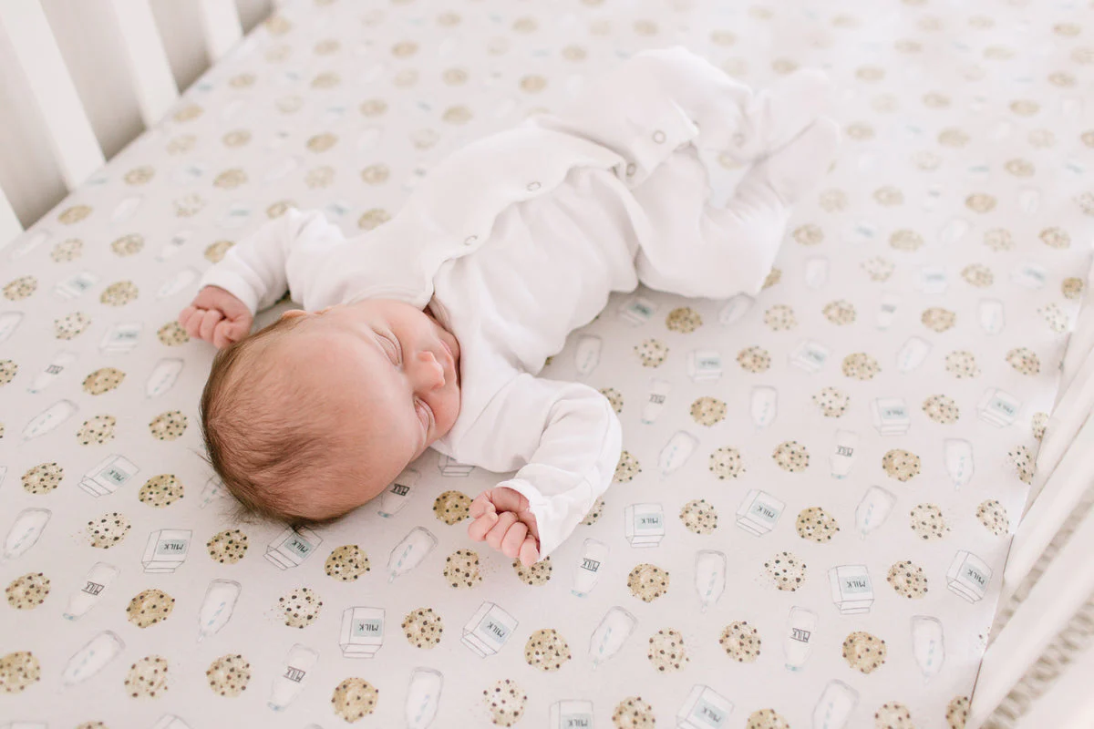 This luxurious Chip Fitted Crib Sheet from Copper Pearl will create a soft spot for your little one to dream. It is elasticized all around for a snug fit on standard-size mattresses along with a fun milk and cookies print to match your nursery decor.