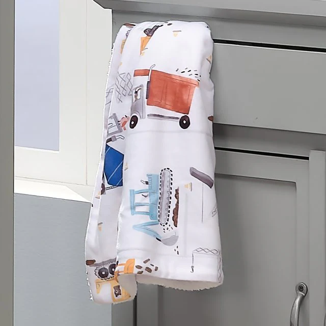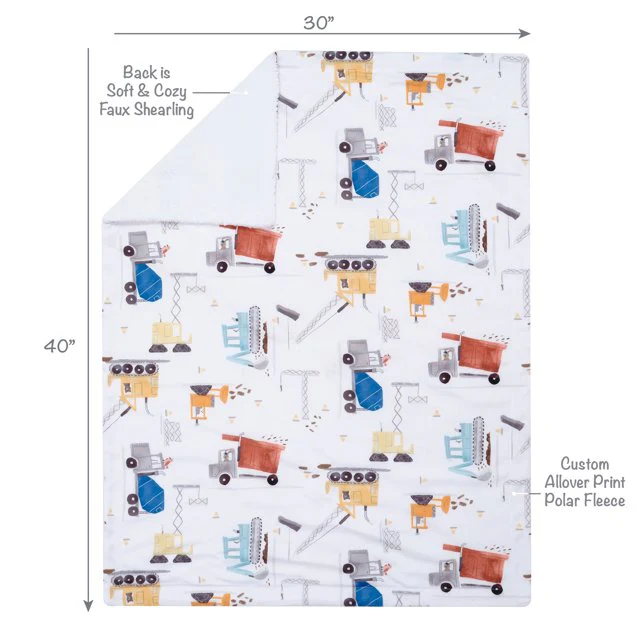 Wrap your little one in comfort with this soft and cozy baby blanket. The front is polar fleece material featuring colorful watercolor construction vehicles and the back is a warm and cozy white faux shearling. It is sized at 30” X 40” making it a perfect sized stroller blanket. This blanket makes a great baby shower gift or welcome home baby gift.