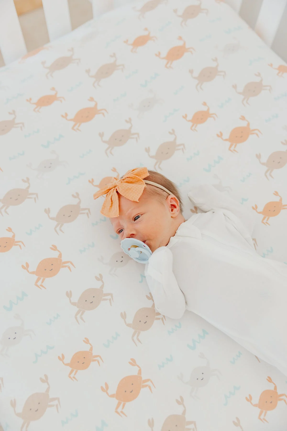 This luxurious Tide Premium fitted Crib Sheet from Copper Pearl will create a soft spot for your little one to dream. It is elasticized all around for a snug fit on standard-size mattresses along with a whimsical crab print to match your nursery decor.