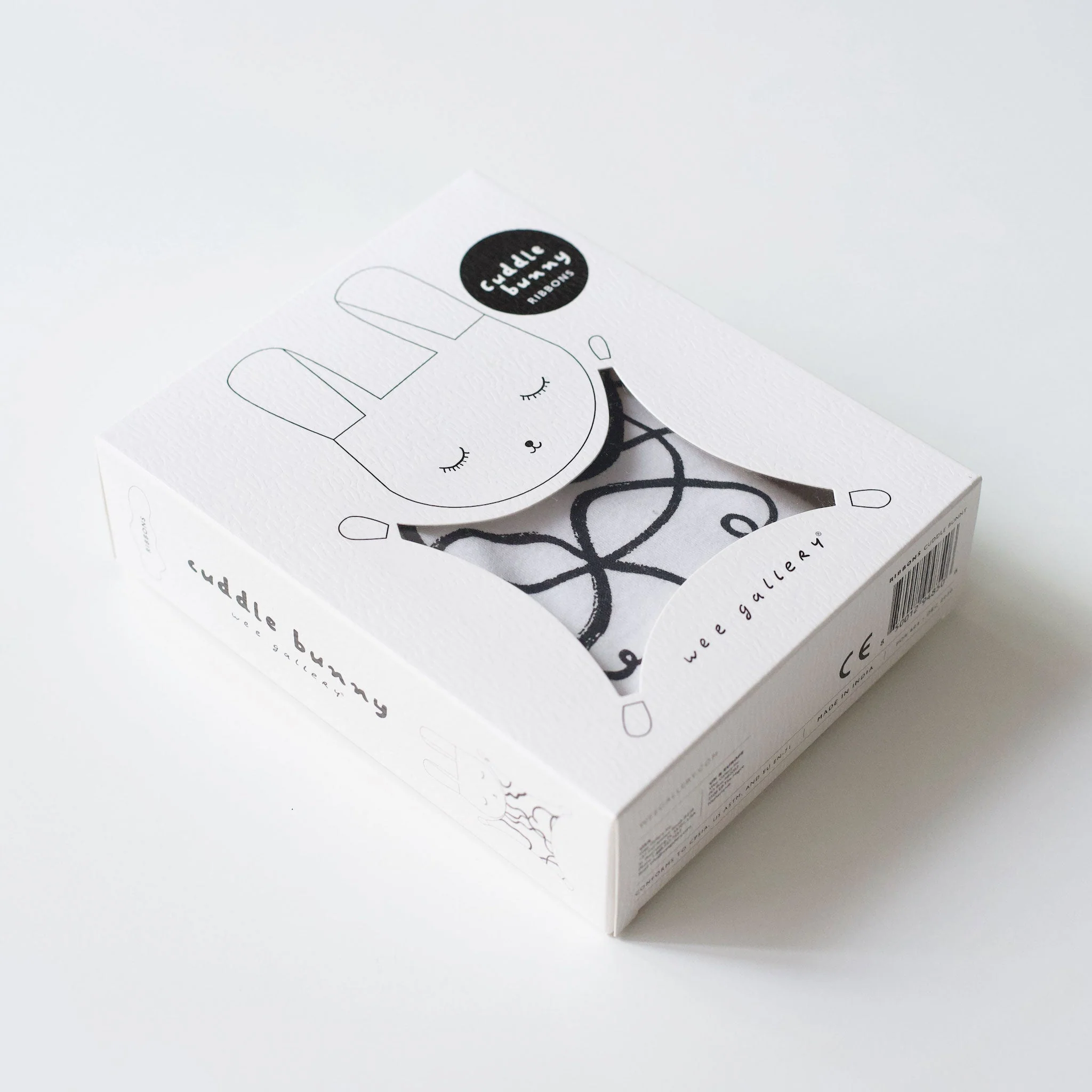 This sweet bunny is made for cuddling and soothing. Its high contrast patterns, taggy feet, and soft sherpa make it easy for baby to love right from day one. Our Cuddle Bunny is made of a 100% organic cotton shell using ethical manufacturing practices. Ribbons Cuddle Bunny can be your baby's sleepy time friend, used to comfort and cuddle anytime, or anywhere the need arises. The bold patterns are are visually stimulating and the textured body and embroidered bunny face provide varied tactile experiences as your baby grows from birth to eighteen months.