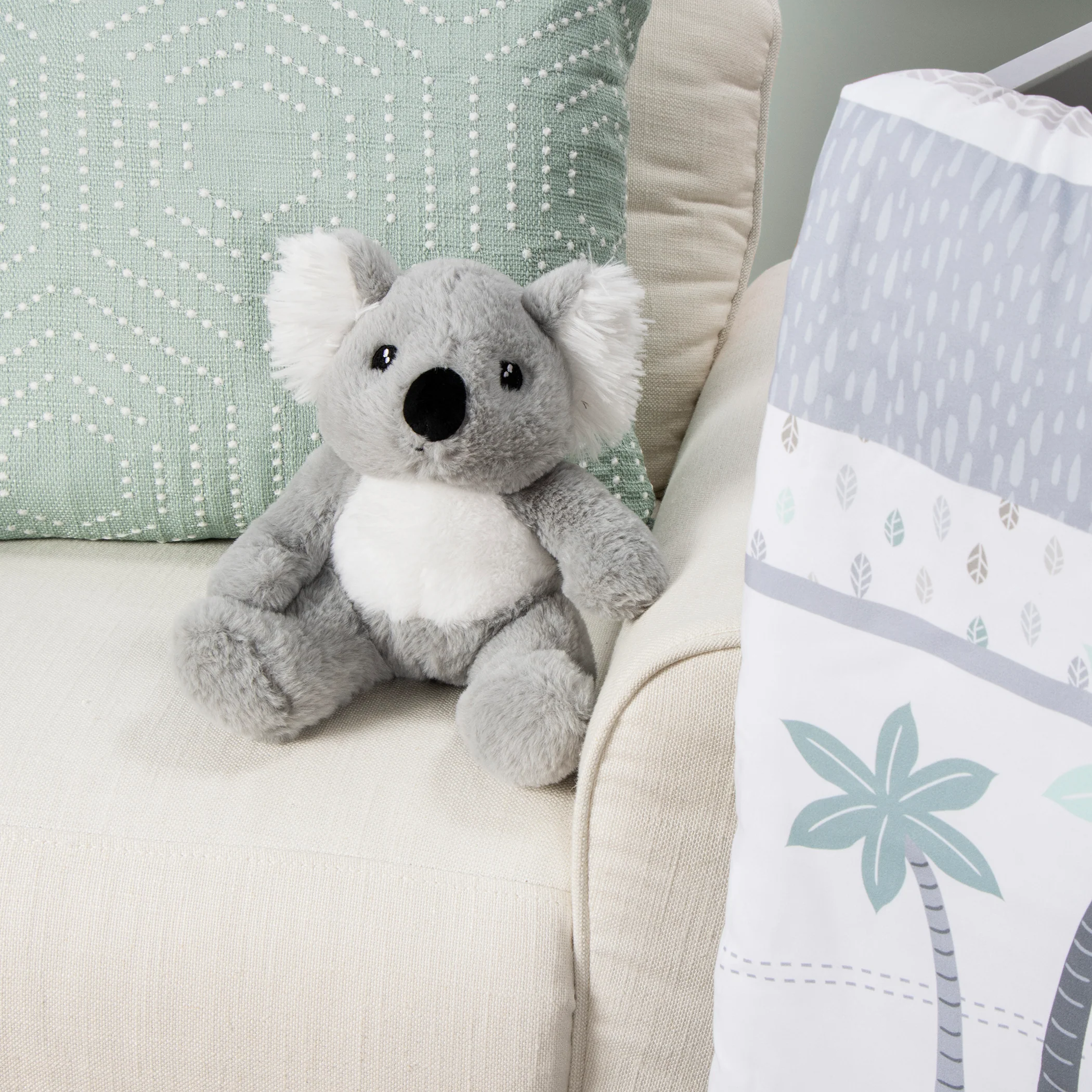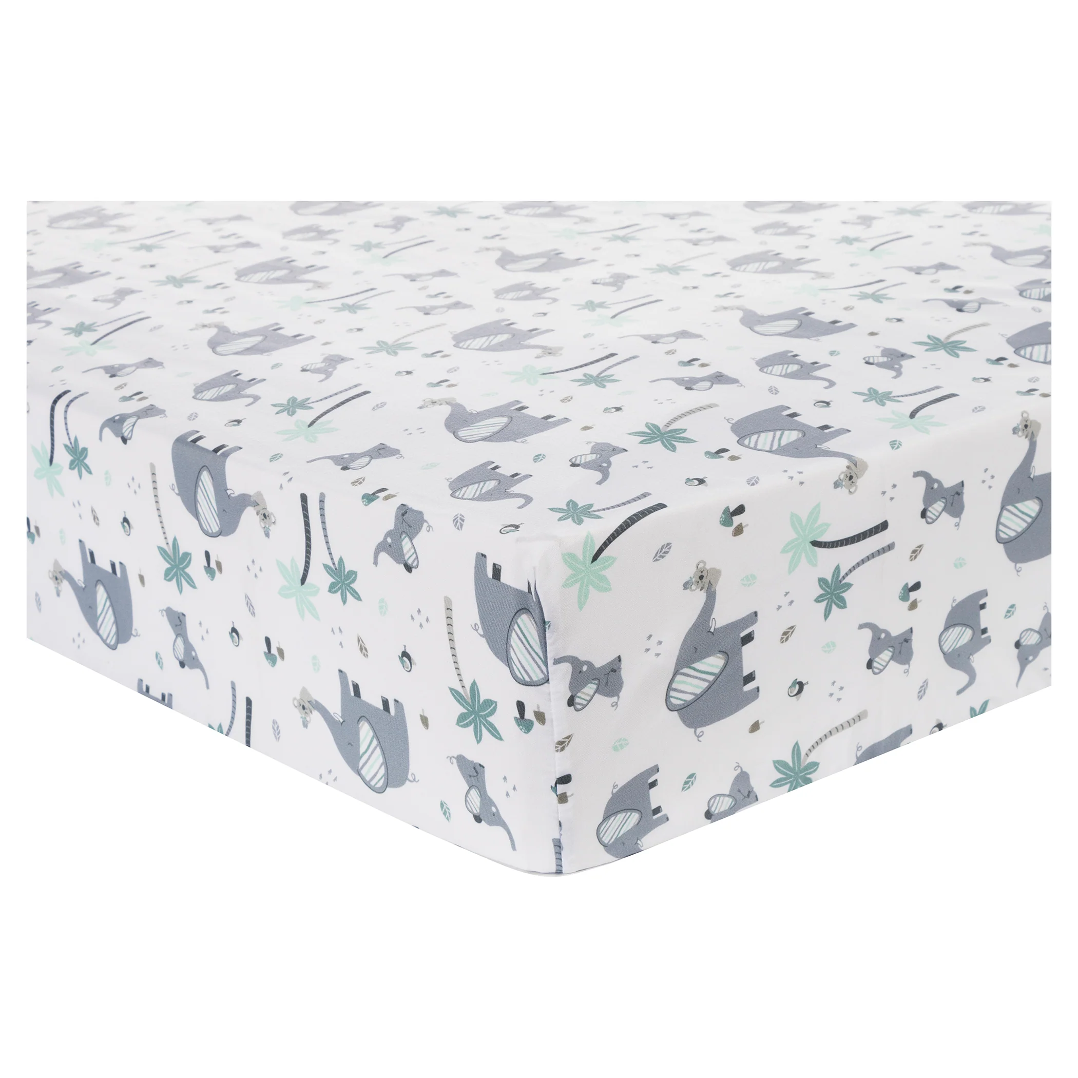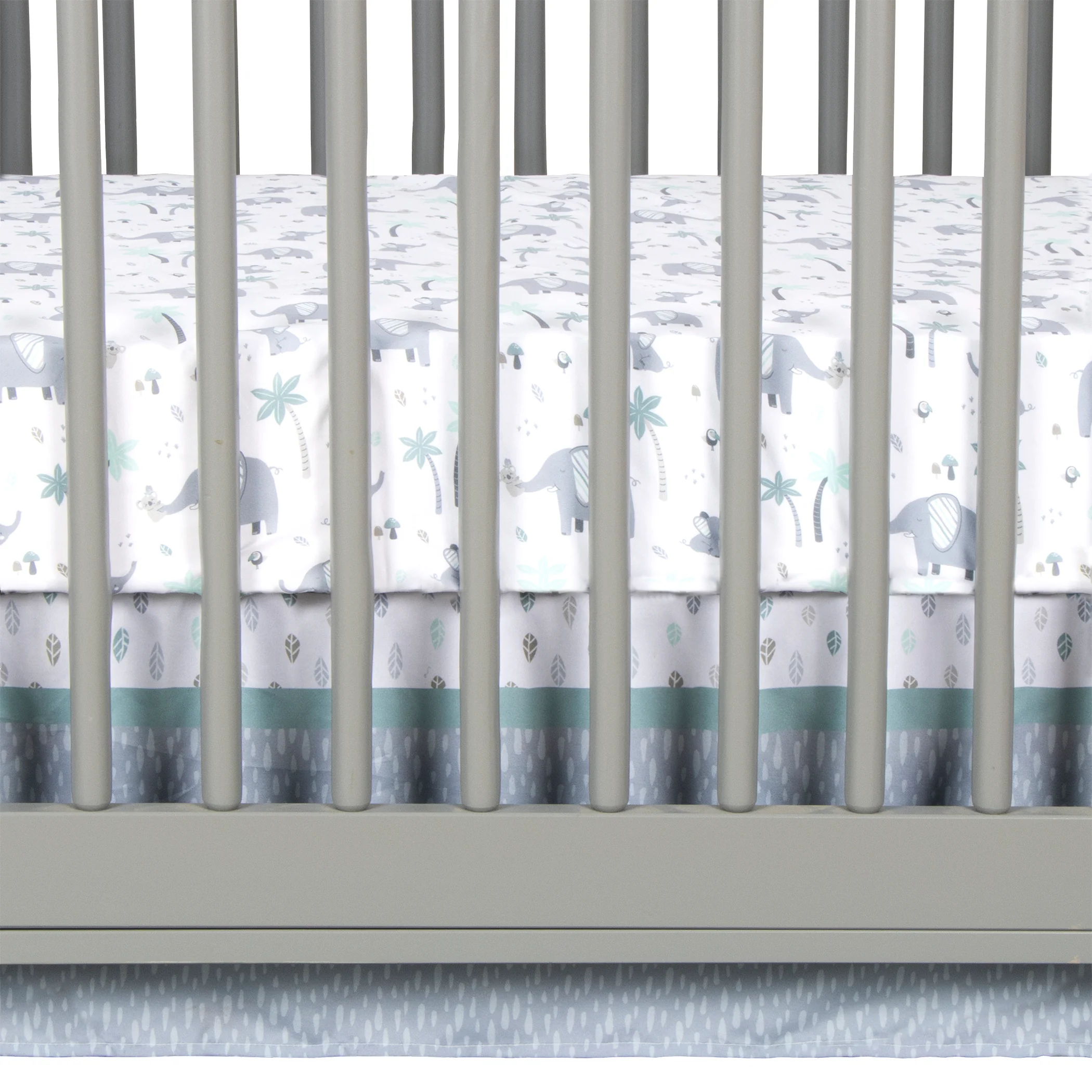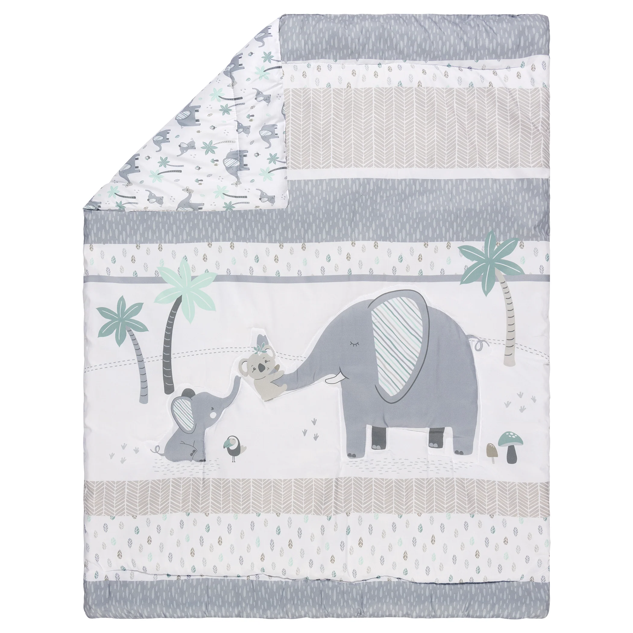 Let your little one explore the tropical safari with the Ellie and Friends 4 Piece Crib Bedding Collection from Sammy & Lou. This collection features Ellie the elephant, her baby and their koala friend exploring the tropics. The balance of gray and a soft blue palette with pops of taupe make this bedding set perfect for a gender-neutral nursery! The nursery quilt is a great 2-in-1 option and can be used as a blanket or a playmat for tummy time. Coordinating Ellie and Friends 4 Piece Crib Bedding and accessories by Sammy & Lou are sold separately. Please adhere to JPMA's Safe Infant Bedding Practices.