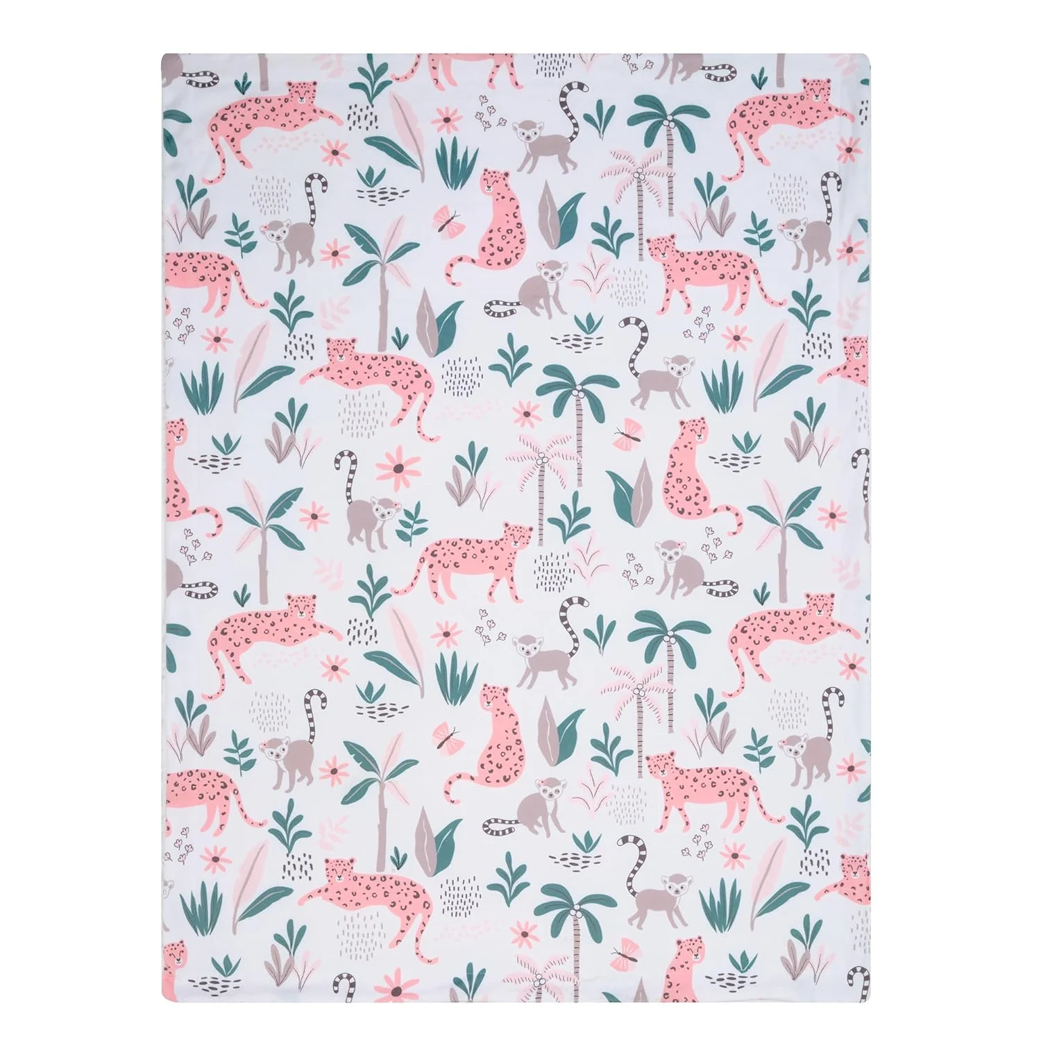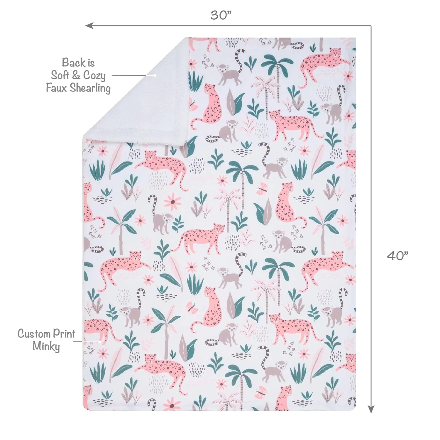 This minky front, faux shearling back fleece jungle baby blanket will wrap your little one in total luxury. There are peachy pink leopards in various positions, lemurs with long curly tails, palm trees, bushes, plants, butterflies, and flowers on clean white ground. Reverses to a soft and cozy white faux shearling fleece. It is perfectly sized at 30” x 40” making it a great stroller blanket.