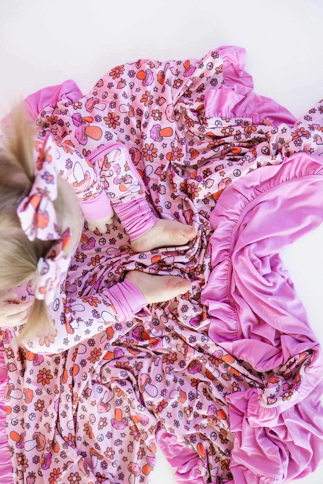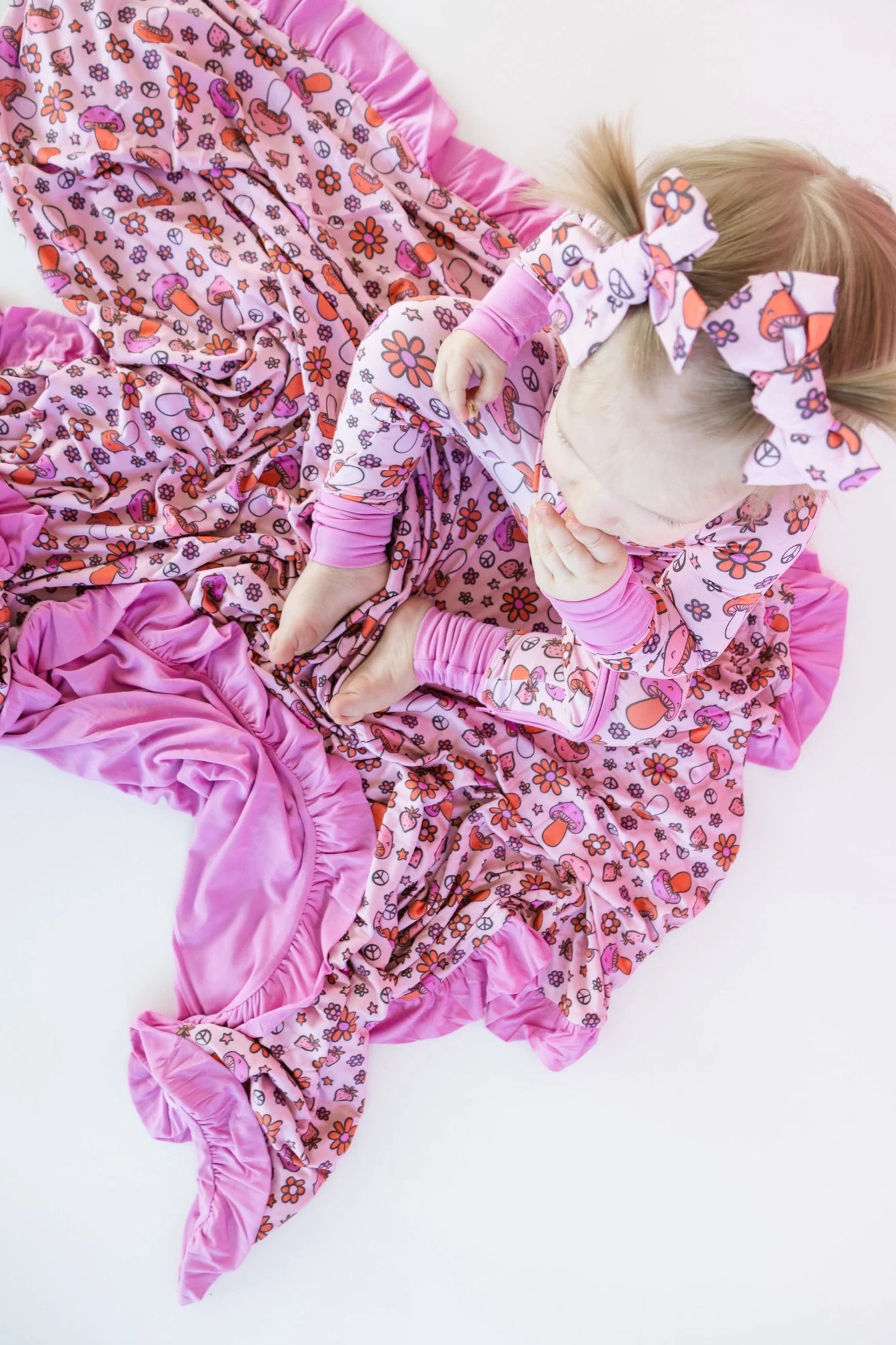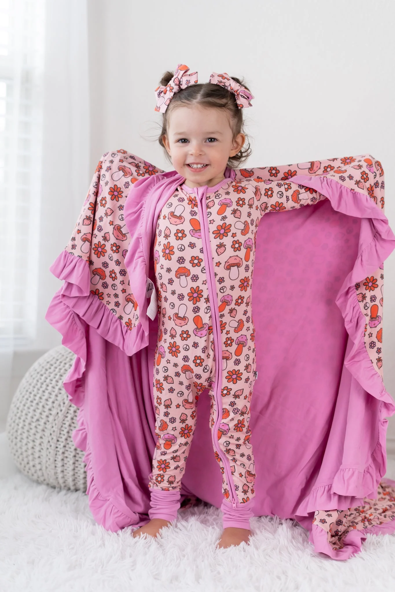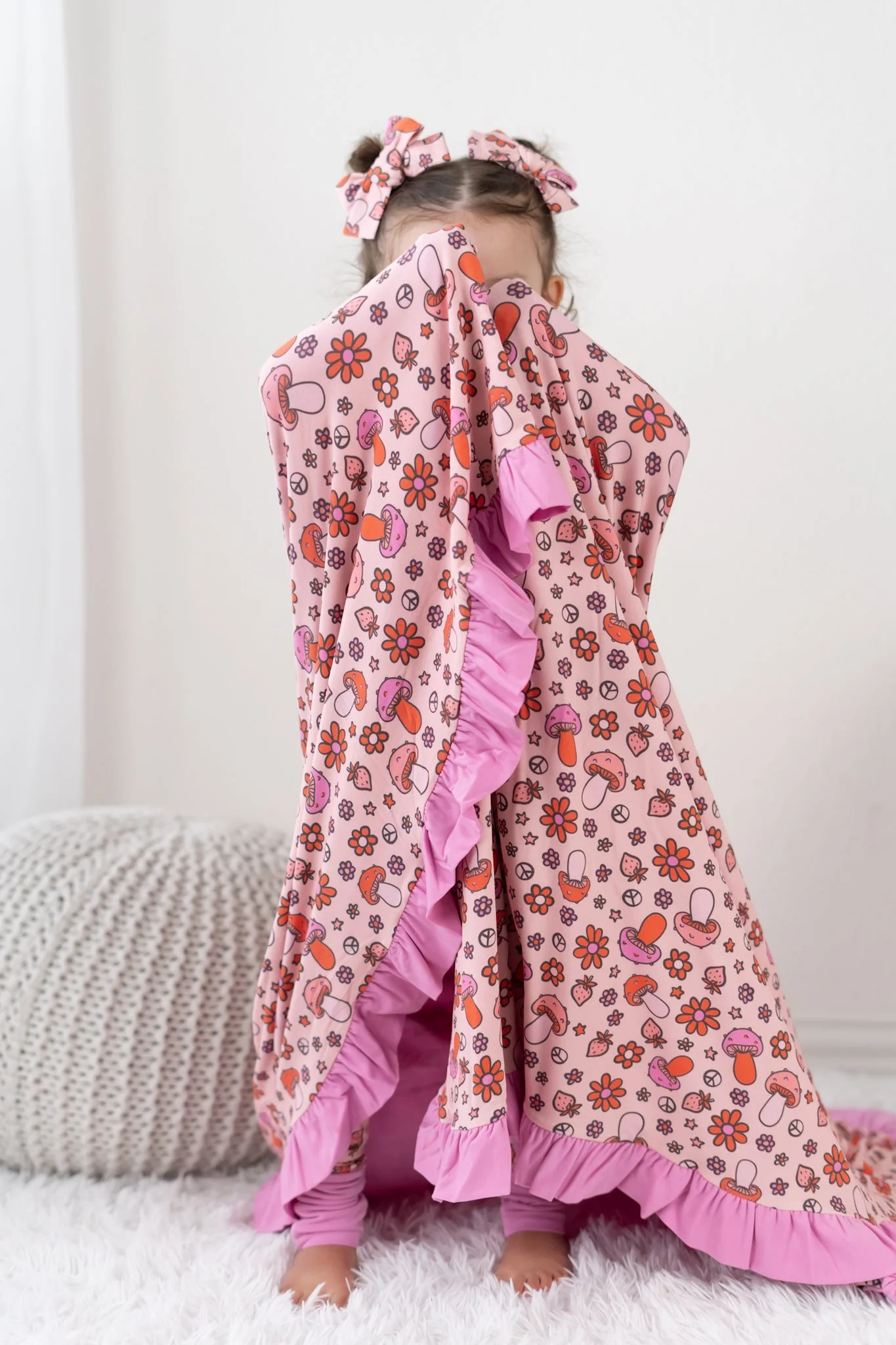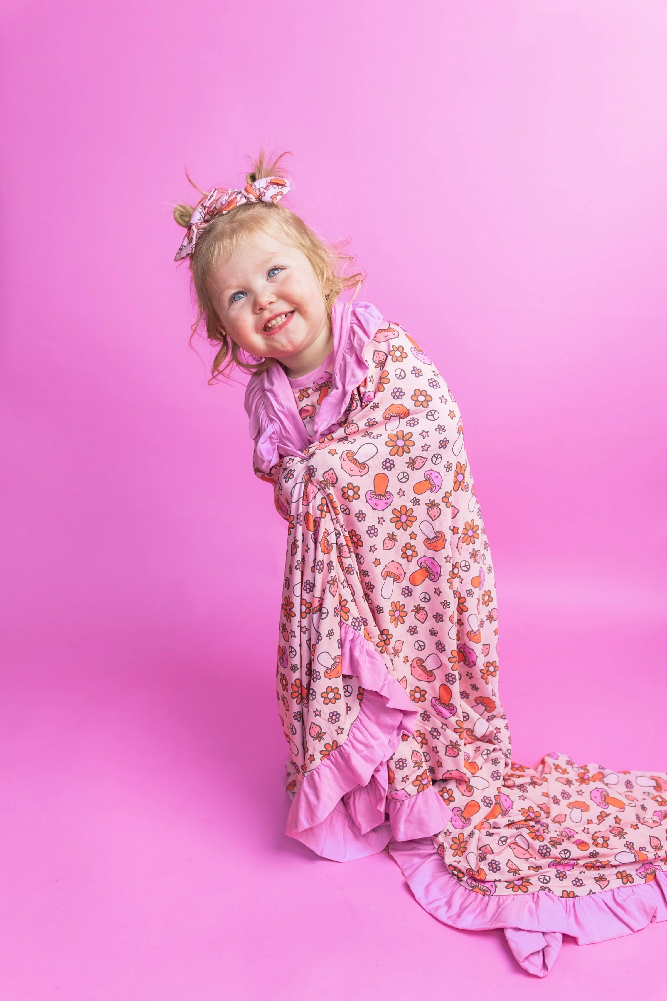 Get all warm and cozy with our Feelin' Mushy Dream Blanket. Made with soft bamboo material, this blanket features a fun mushroom print that'll add a cute touch to your room. Snuggle up and let the good vibes flow.