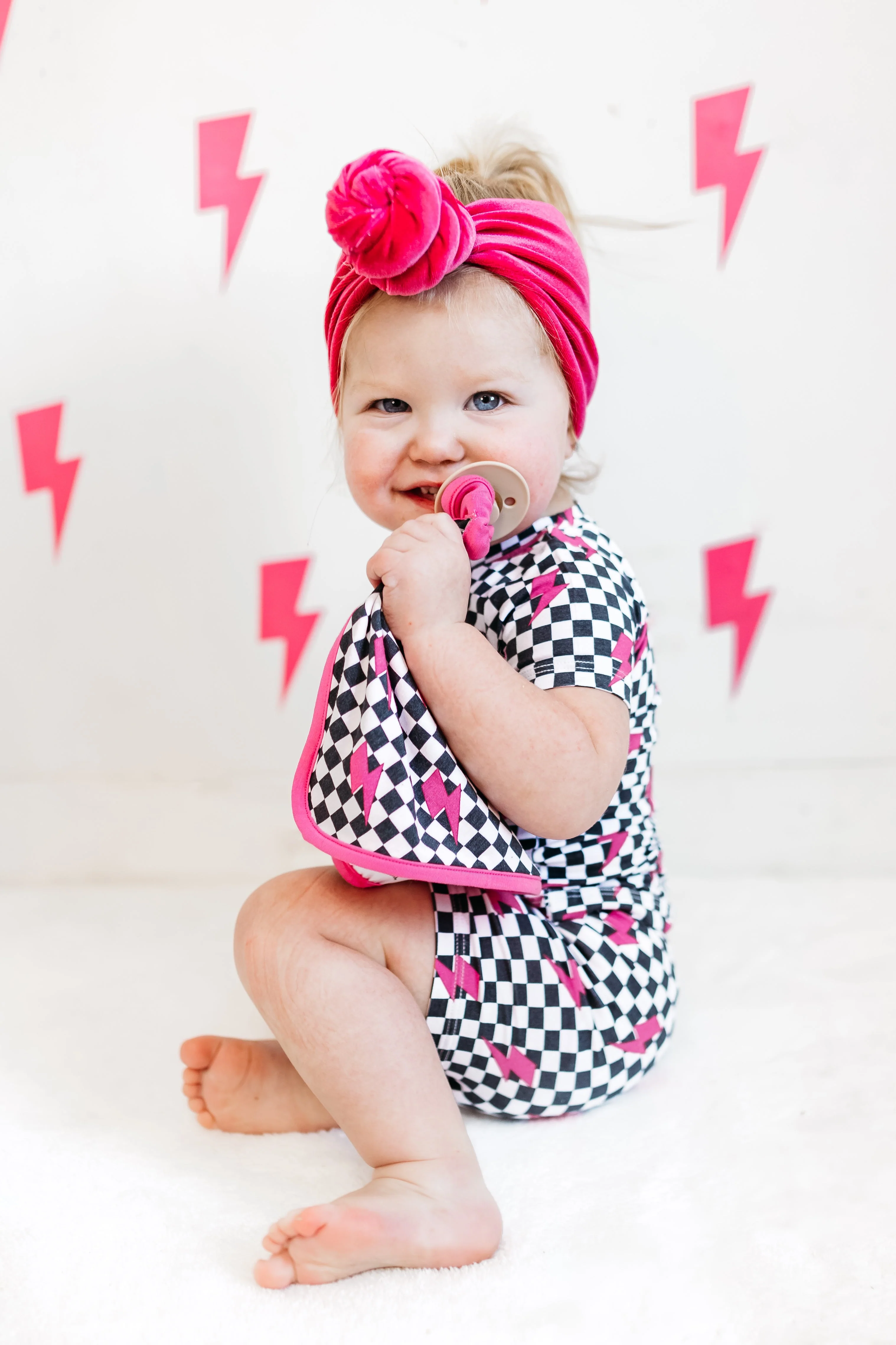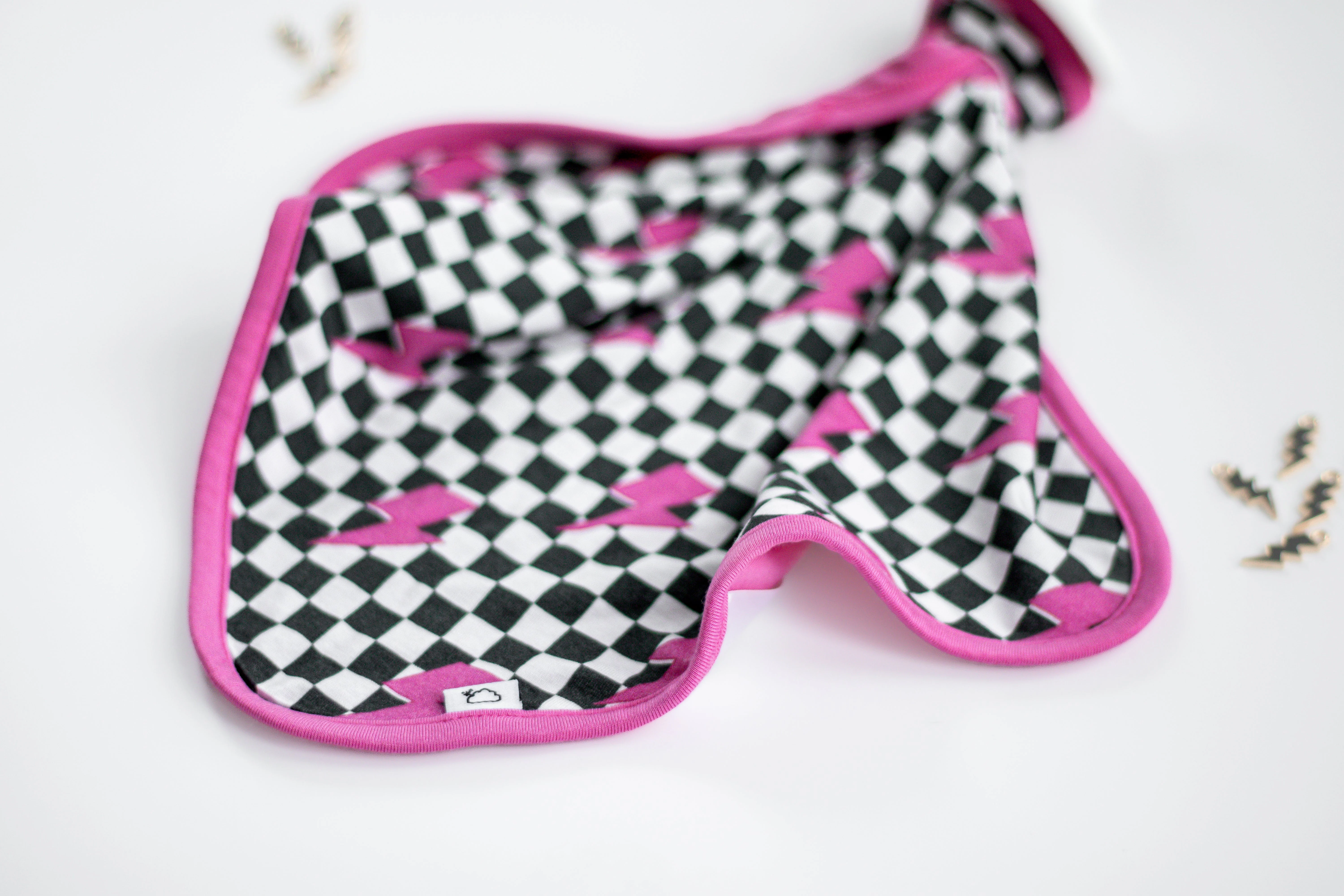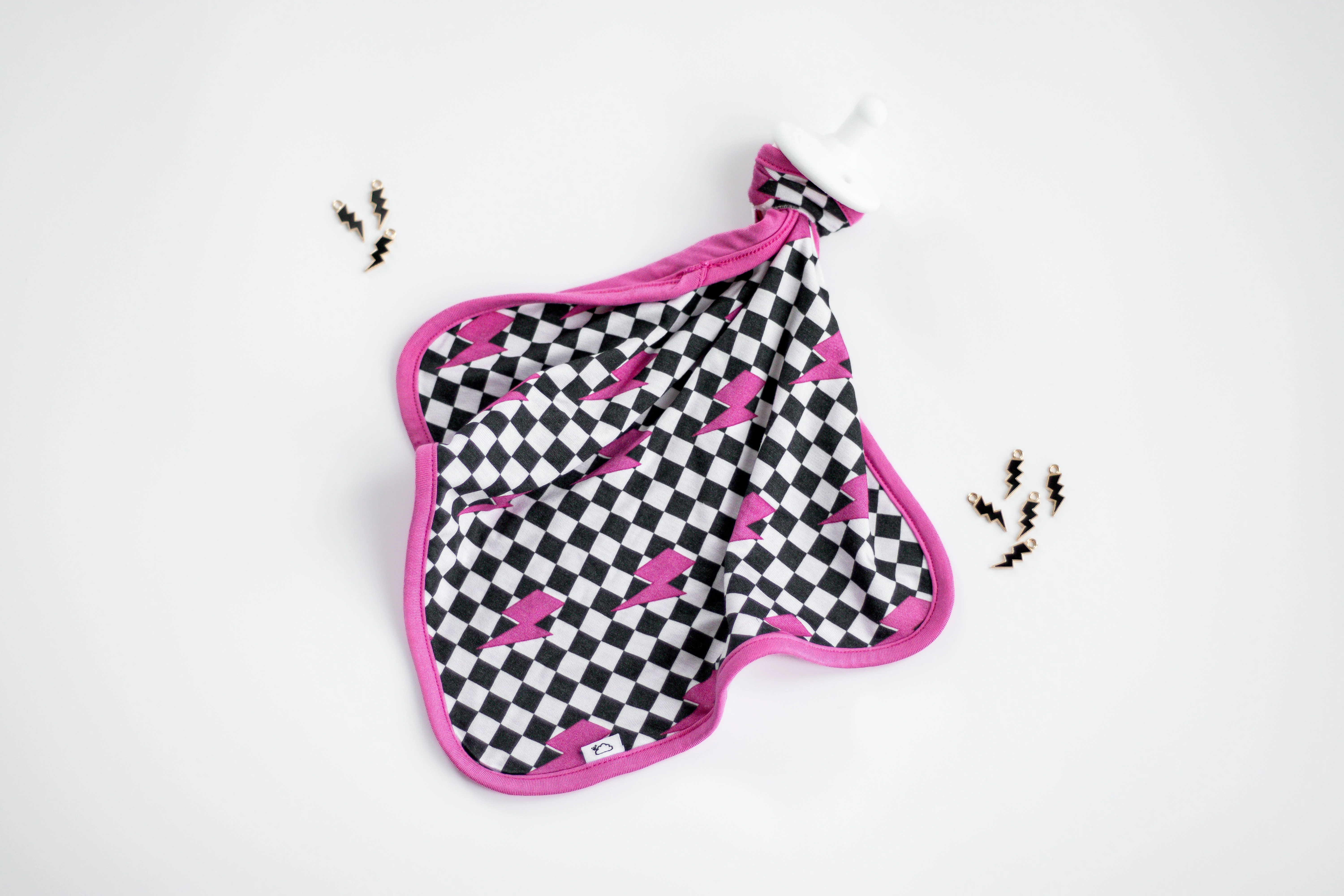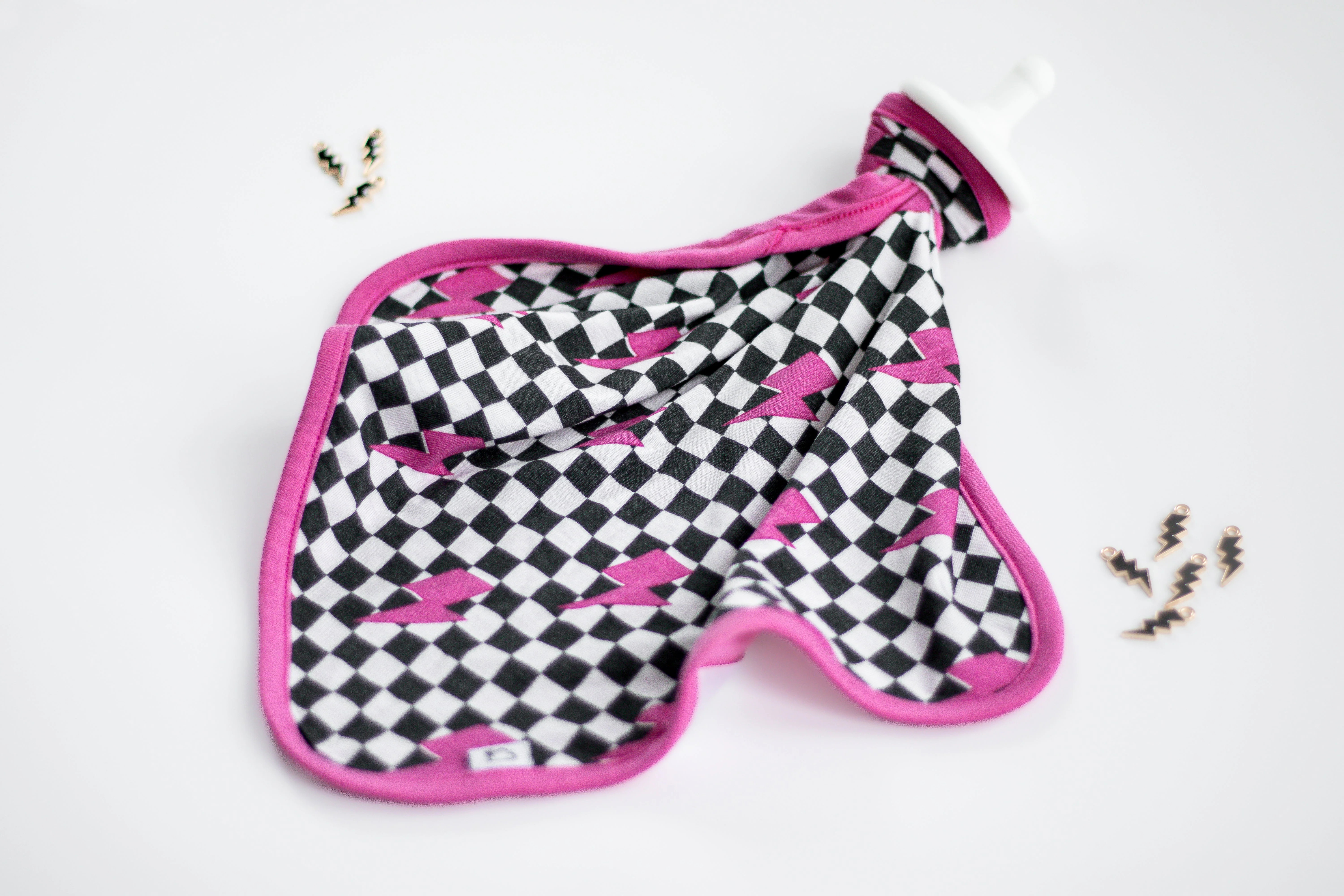 Be lightning in a bottle with our Fierce Checkzzz Dream Lovey! Made from bamboo material, this lovey doubles as a pacifier holder and features a fun pink lightning print. Super soft and cute, it's perfect for your little one's fierce adventures. (Bam!)