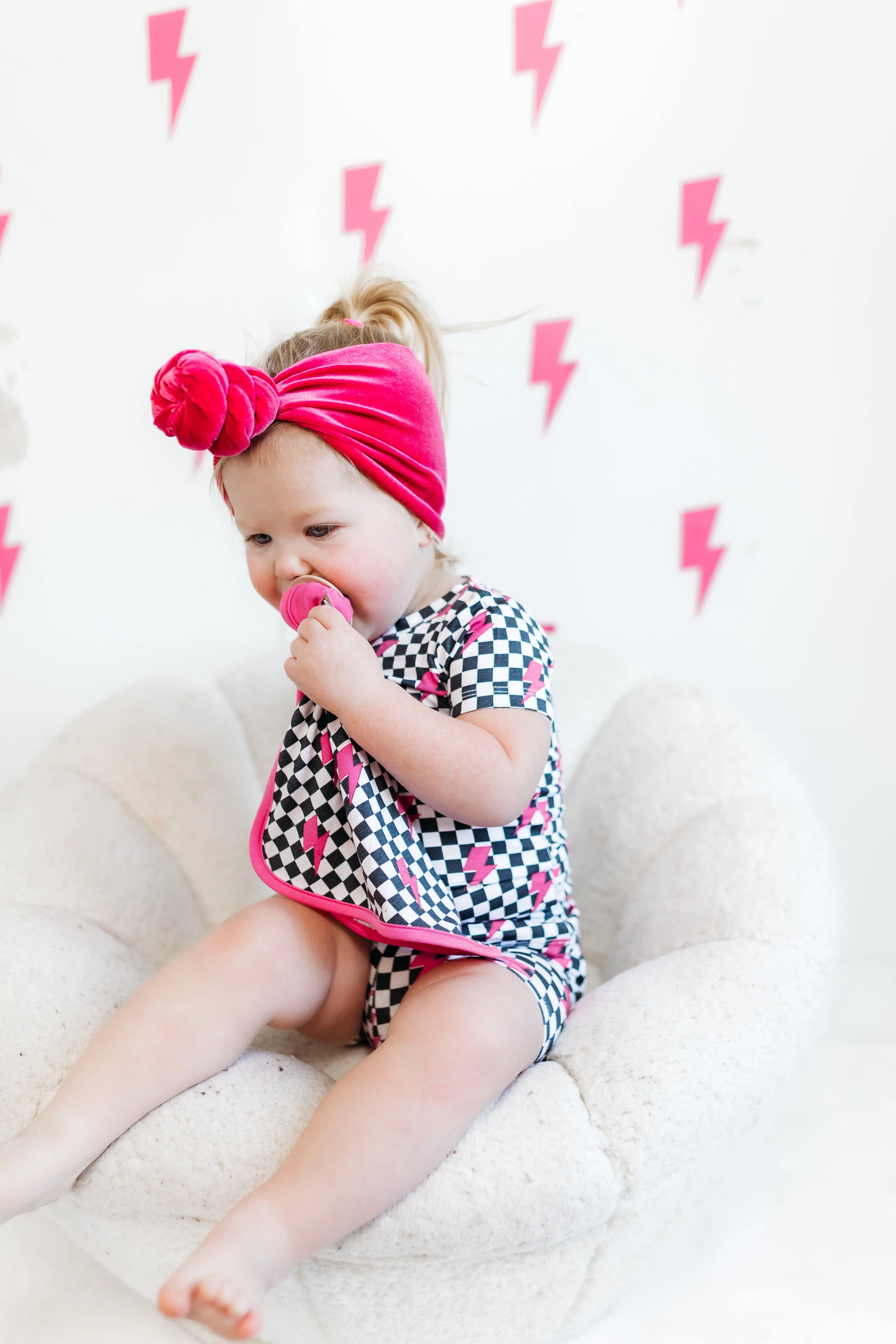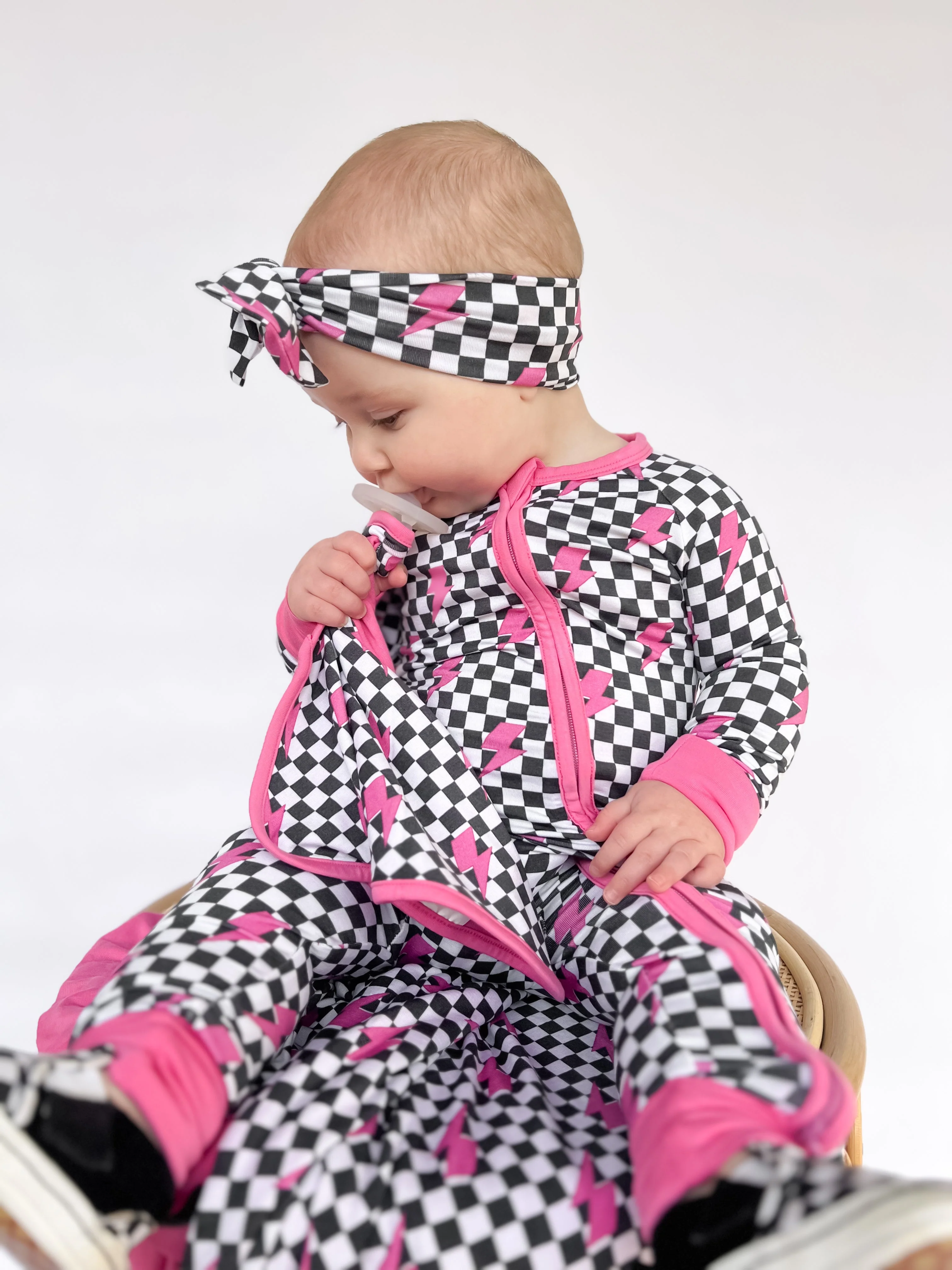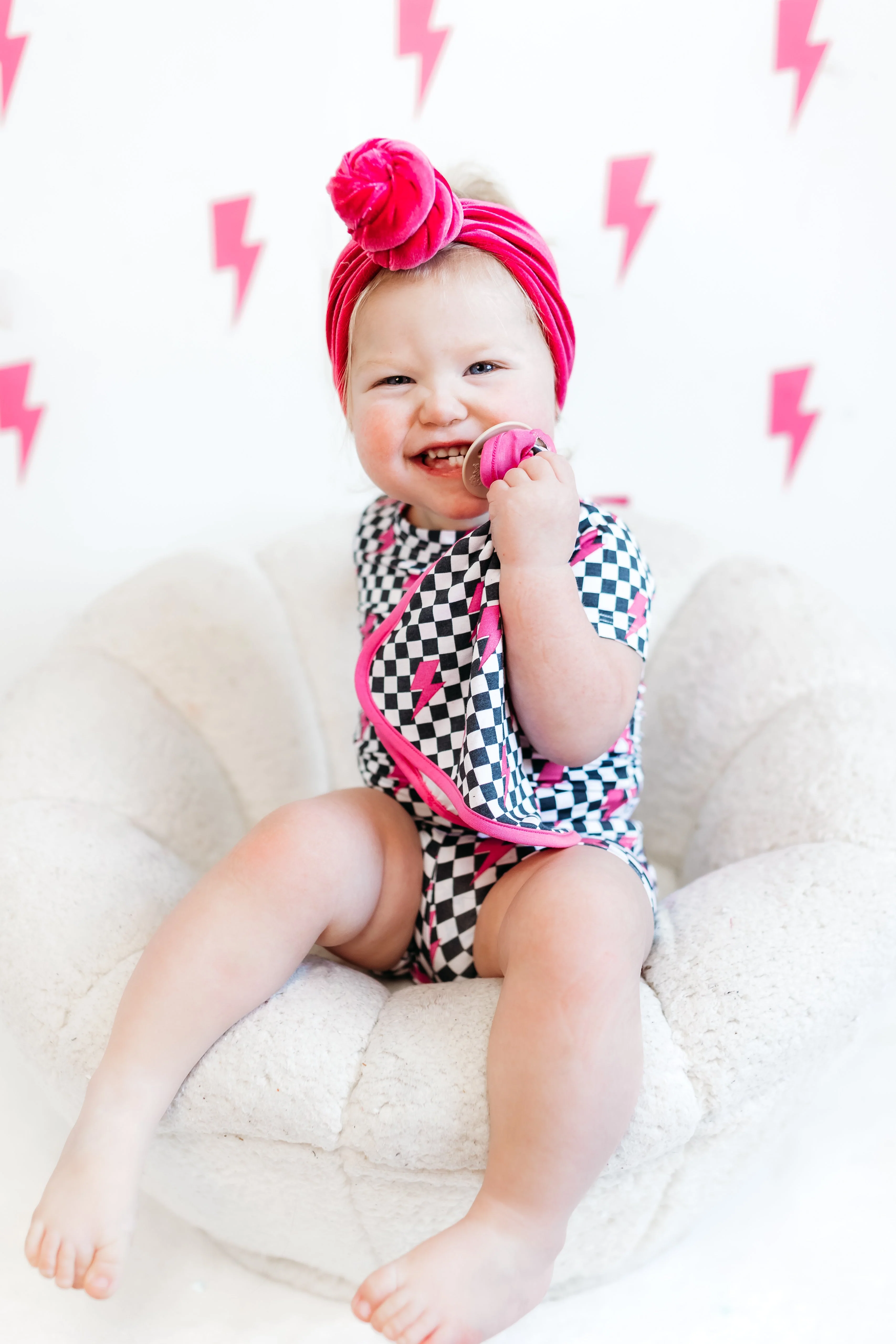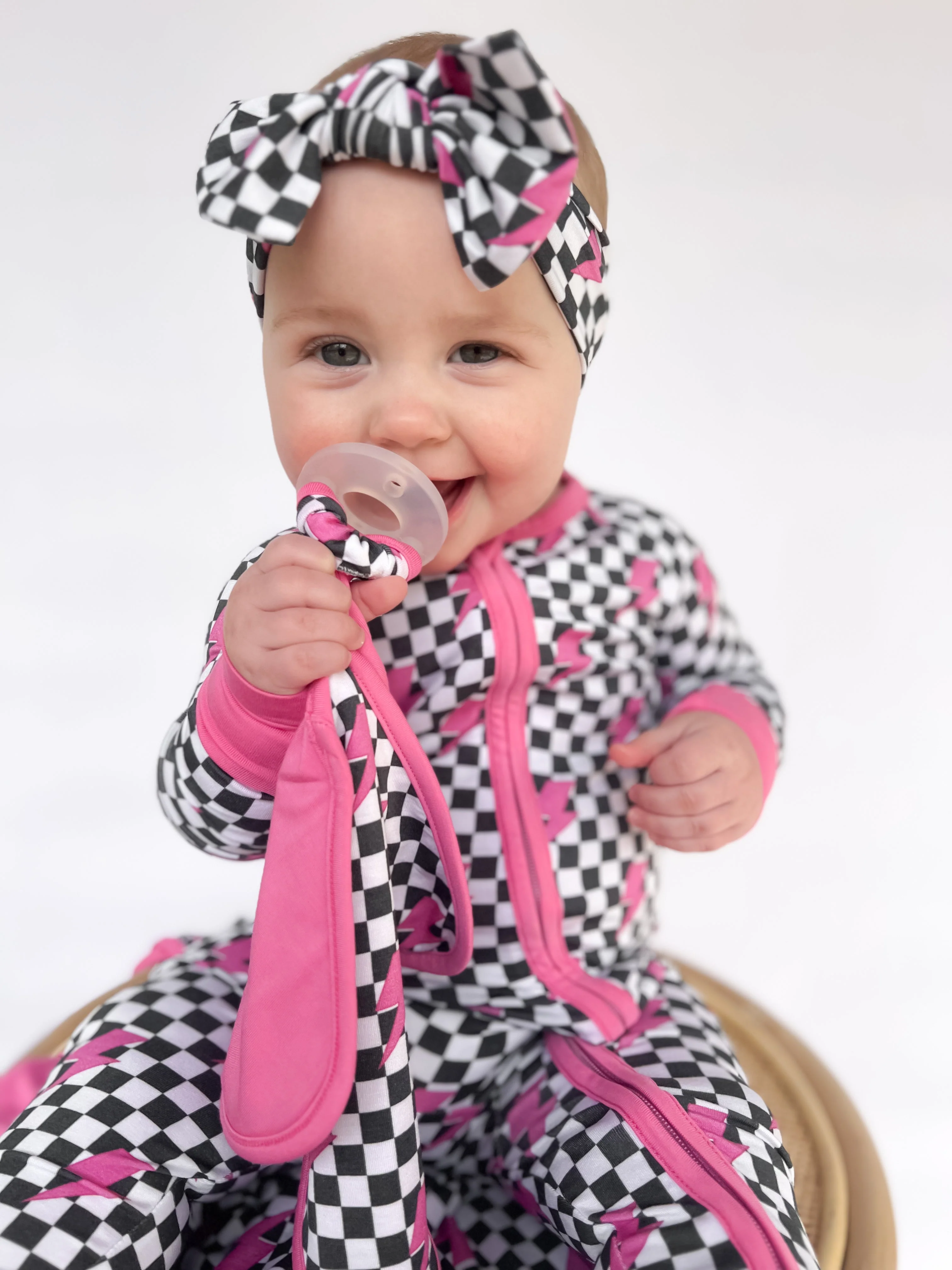 Be lightning in a bottle with our Fierce Checkzzz Dream Lovey! Made from bamboo material, this lovey doubles as a pacifier holder and features a fun pink lightning print. Super soft and cute, it's perfect for your little one's fierce adventures. (Bam!)