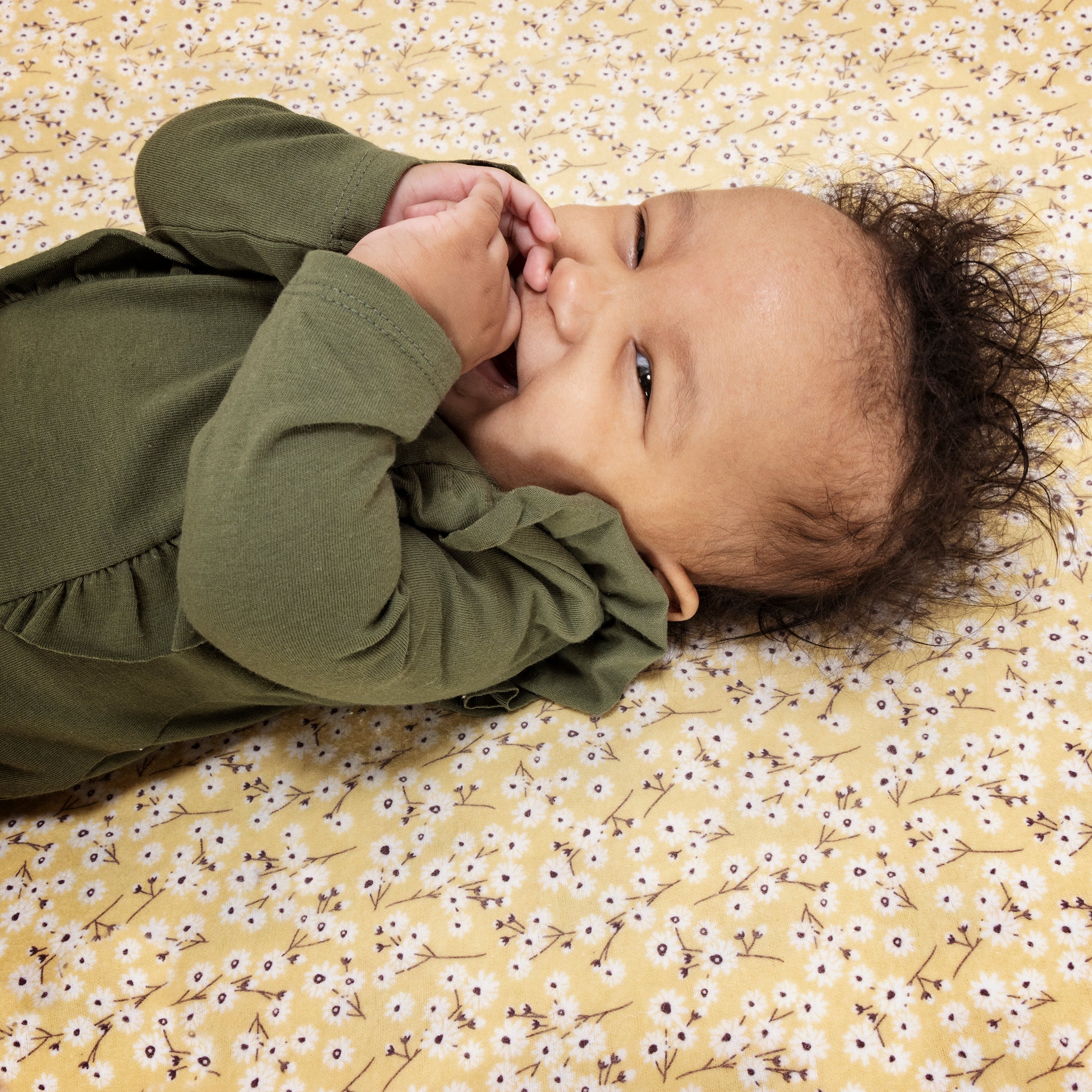 The Golden Daisies Deluxe Flannel Fitted Crib Sheet by Trend Lab is 100% brushed cotton and features a white daisy print, with eggplant purple leaves on a golden yellow background. Crib sheet fits a standard 28 in x 52 in crib mattress and features.
