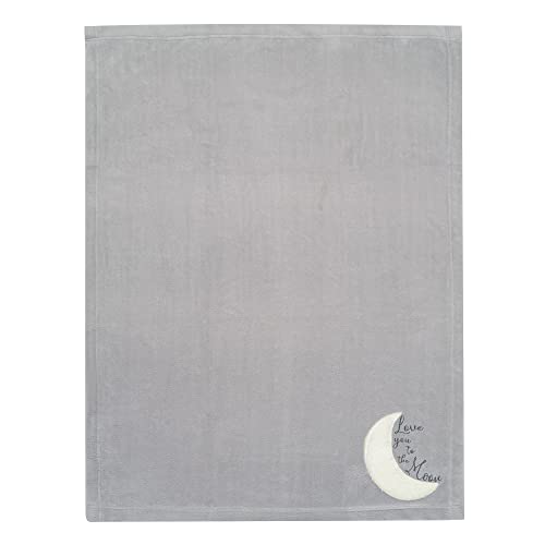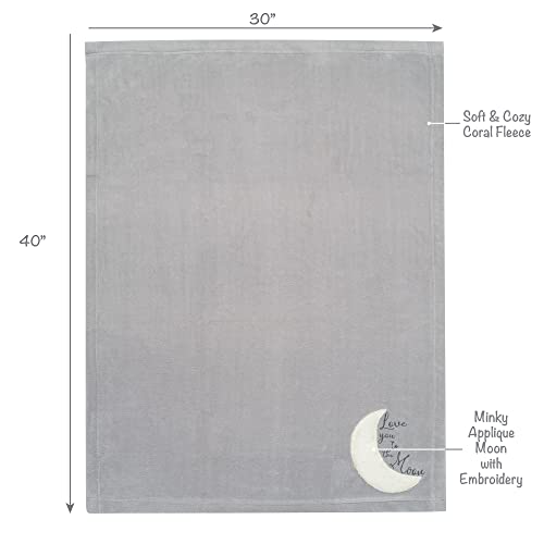Your little infant is sure to be warm and cozy in this soft fleece baby blanket. There is a 7” crescent moon appliqued in a fluffy white faux shearling. The words “Love you to the moon” are expertly embroidered in a gray script style. This blanket is perfectly sized at 30” X 40” and makes a great baby shower gift or welcome home baby gift.