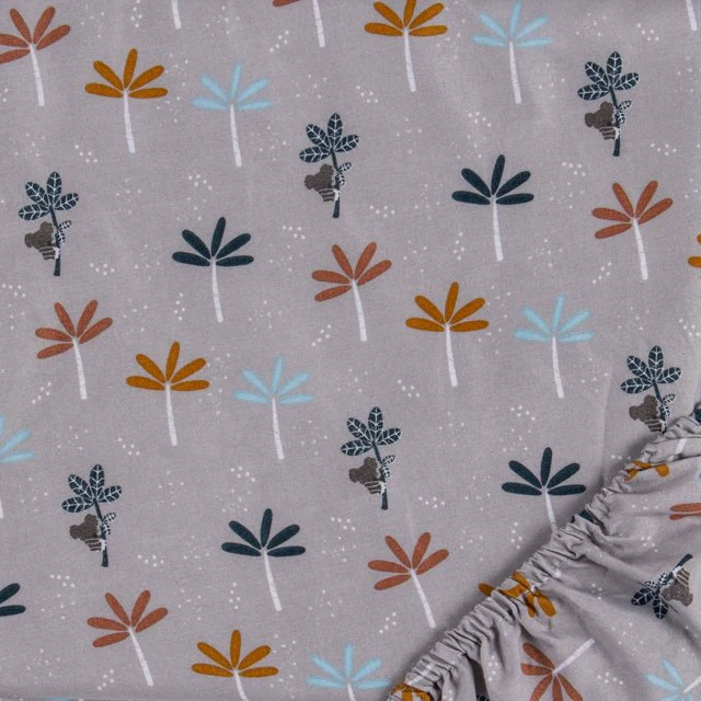 Tour the world with the Koala Palms 2-Pack Microfiber Fitted Crib Sheet Set by Sammy & Lou. This set of 2 wonderful soft crib sheets includes a scattered print featuring giraffes, koalas, lions, turtles, alligators, sun, leaves and palms in a sky blue, slate blue, subtle orange, salmon, blush, terracotta, dove Gray and natural Gray on white background. A coordinating sheet features koalas hanging on palm trees in sky blue, slate blue, subtle orange, salmon, and paloma Gray on a glacier Gray background. Crib sheets fit a standard 28 in x 52 in crib mattress with 8-inch-deep pockets and elastic surrounding the entire opening ensuring a more secure safer fit. Coordinating Koala & Friends bedding and accessories by Sammy & Lou are sold separately.