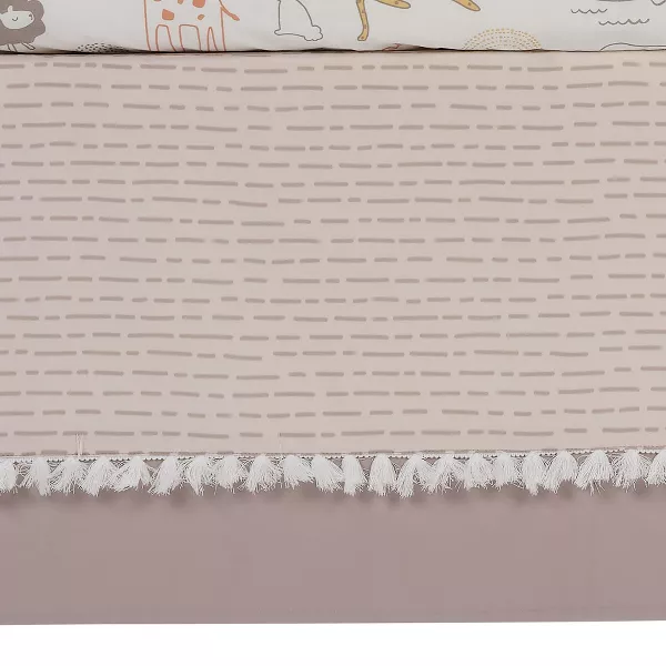 - Taupe dash print crib skirt with white tassel trim