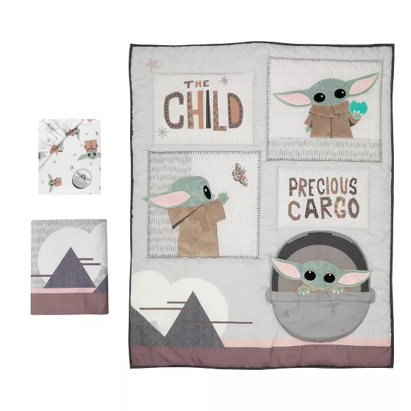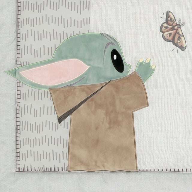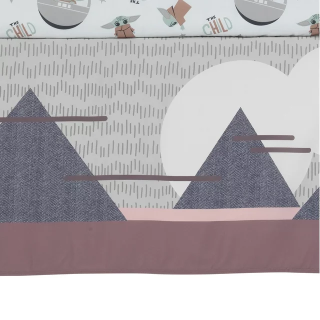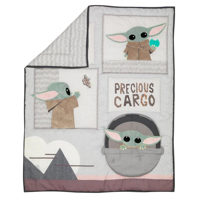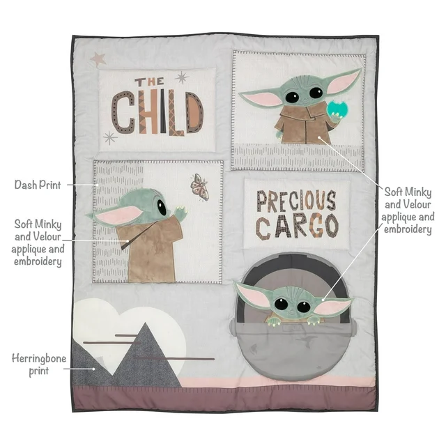 The Child aka Grogu and Baby Yoda is so cute and sweet even down to his tiny little feet. Your little padawan (Jedi-in-training) will love this amazing officially licensed Star Wars Mandalorian 3-piece nursery bedding collection which includes one quilt, one fitted crib sheet, and one crib skirt.