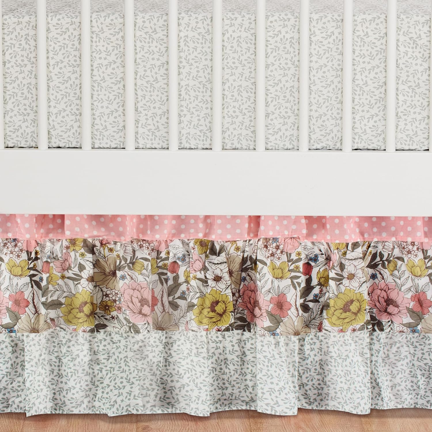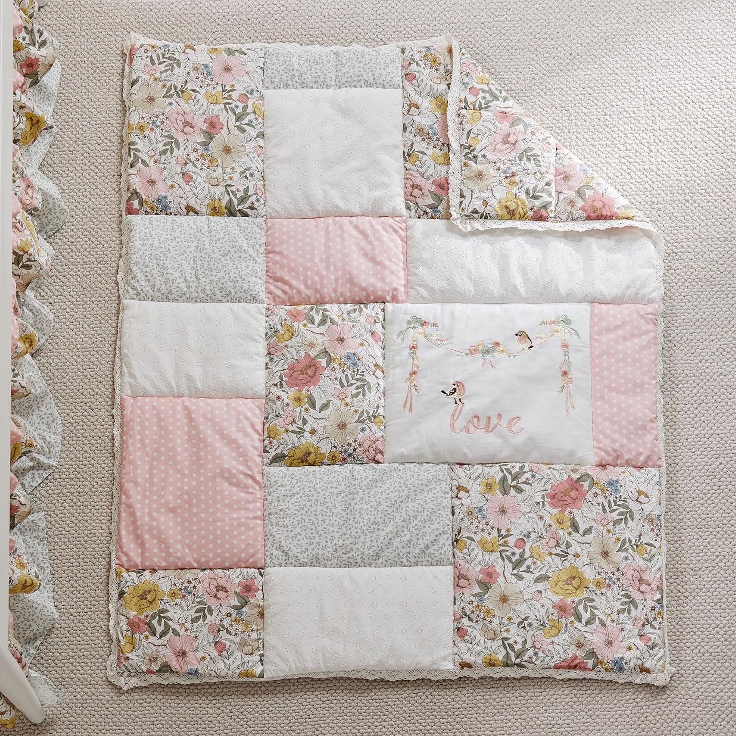 - ADORABLE FLORAL THEME: You will think you are a beautiful, magic garden with our adorable floral look. The fitted sheet is an array of colorful flowers on a white ground or switch it out with the one featuring mini grey leaf branches on a white ground. The quilt features beautiful, patched design with various fabric in eyelet and prints with lace all around. The bed skirt has three layers of beautiful ruffles in different fabrics, completing your floral nursery look.