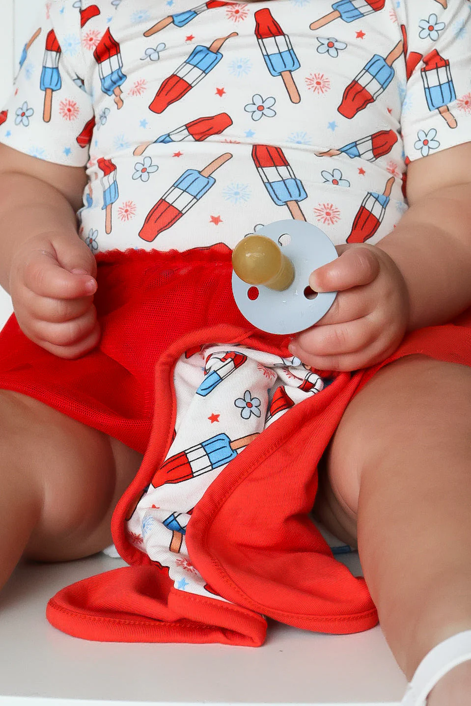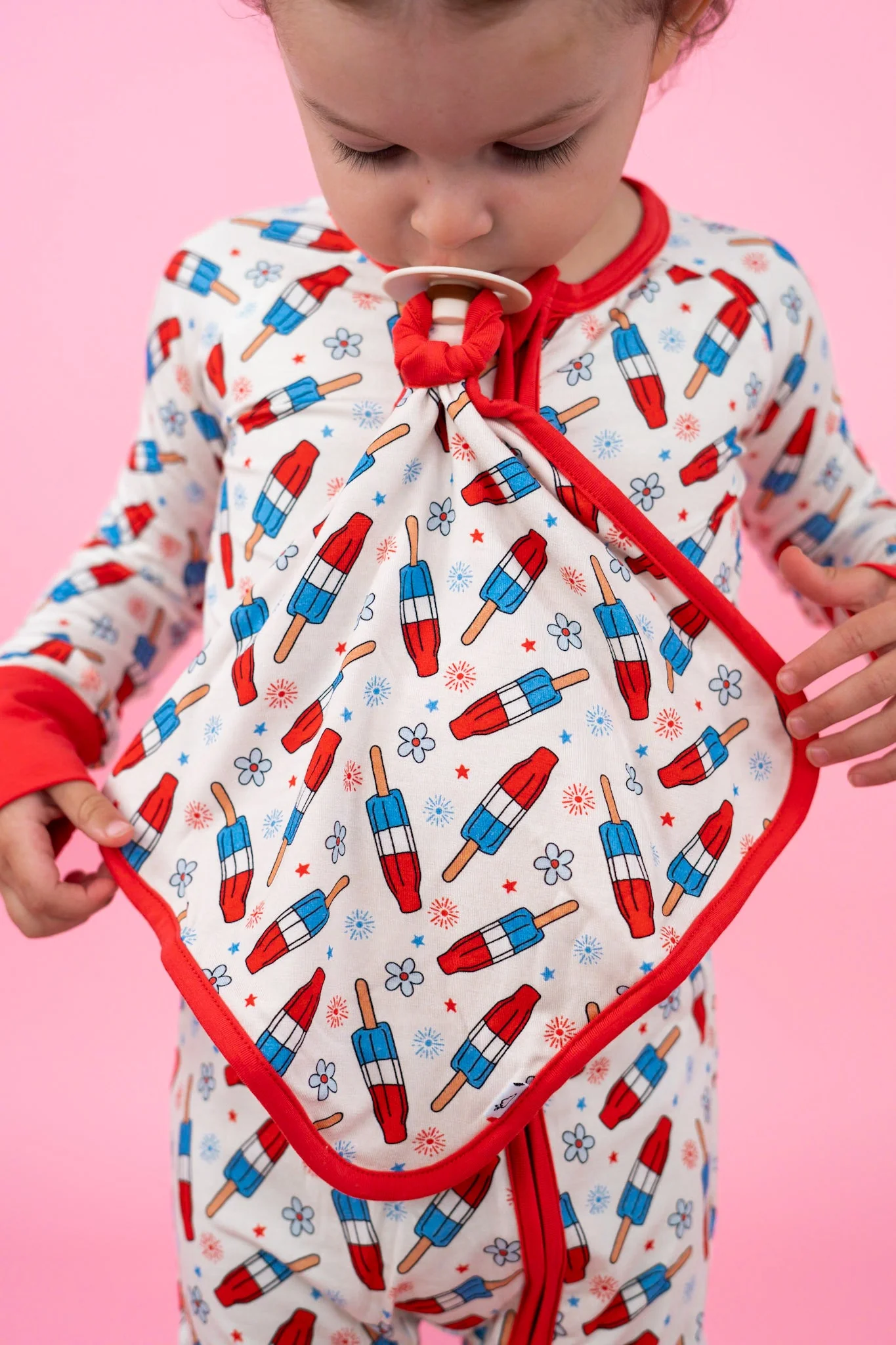 Get ready to ignite your little one's love for patriotism with our Little Miss Firecracker Dream Lovey! This multi-functional lovey not only serves as a pacifier holder, but also adds a fun touch with its soft, bamboo material and playful ice pop design. Perfect for July 4th celebrations!