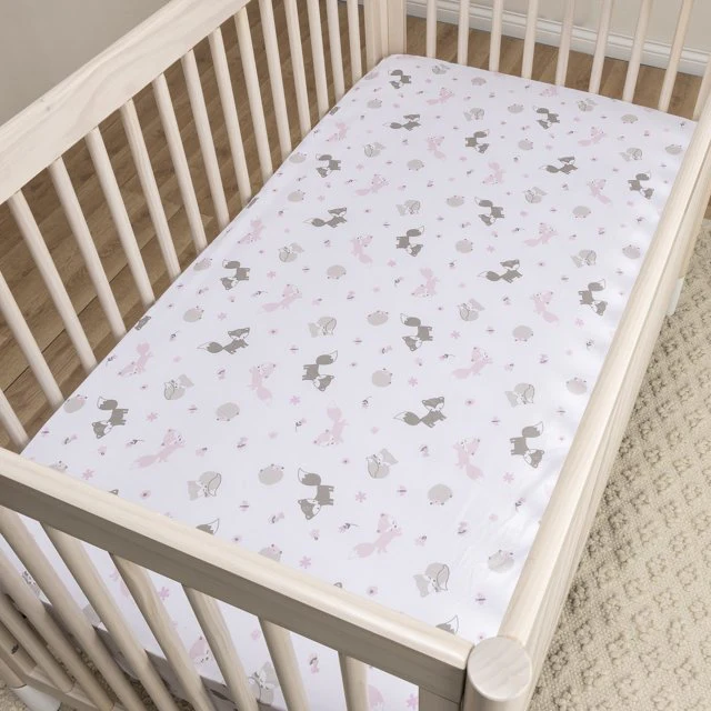 Feminine meets forestry with the Lots of Fox 2-Pack Microfiber Fitted Crib Sheet Set by Sammy and Lou. This set of 2 wonderful soft crib sheets includes a print featuring pink and gray foxes and a print featuring a floral leafy design. Coordinating Sammy and Lou bedding and accessories sold separately.