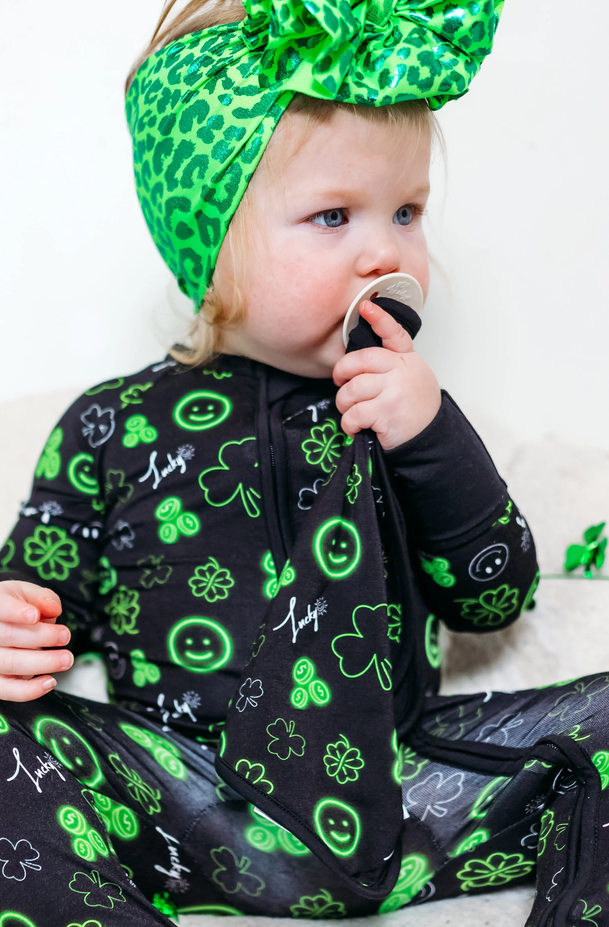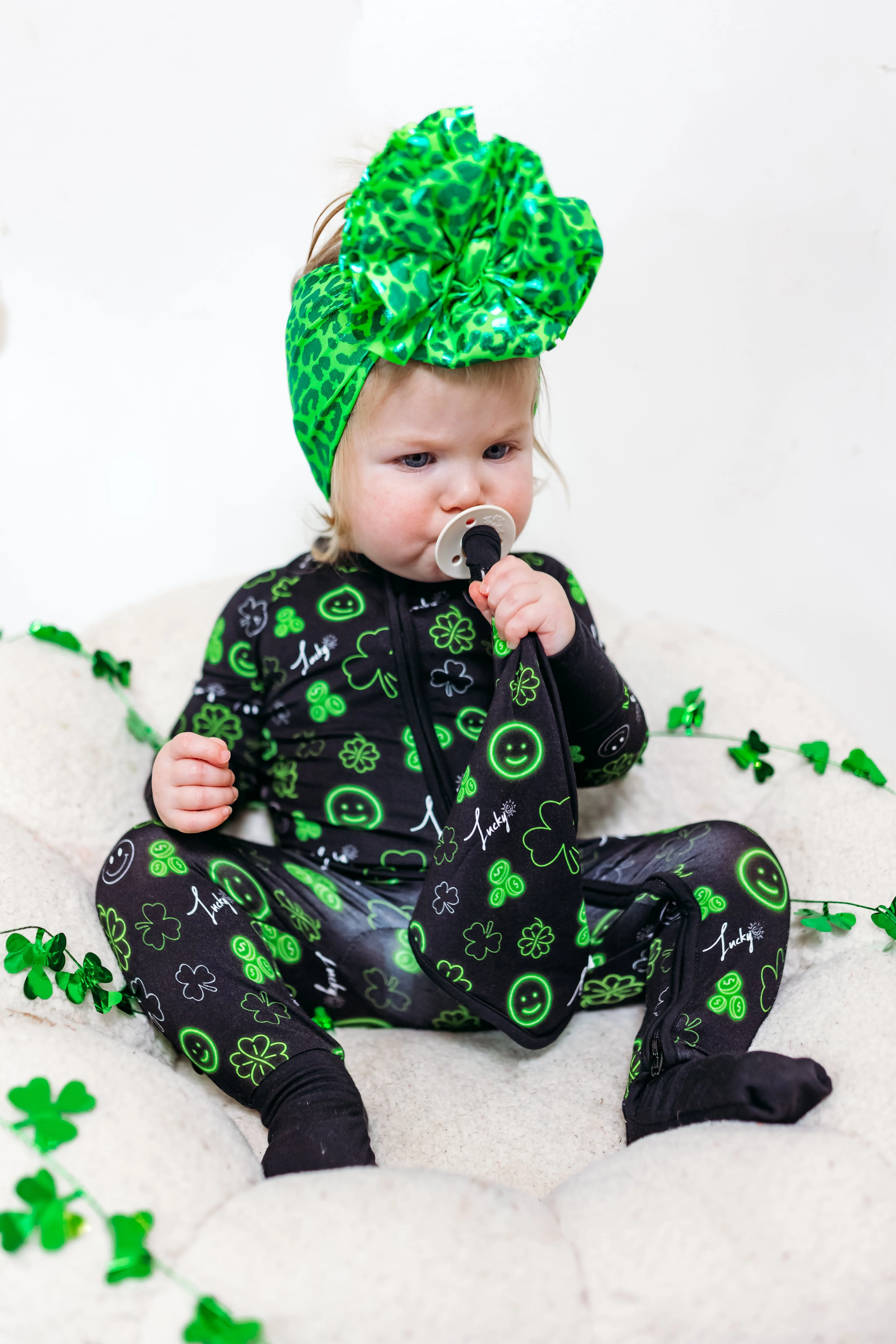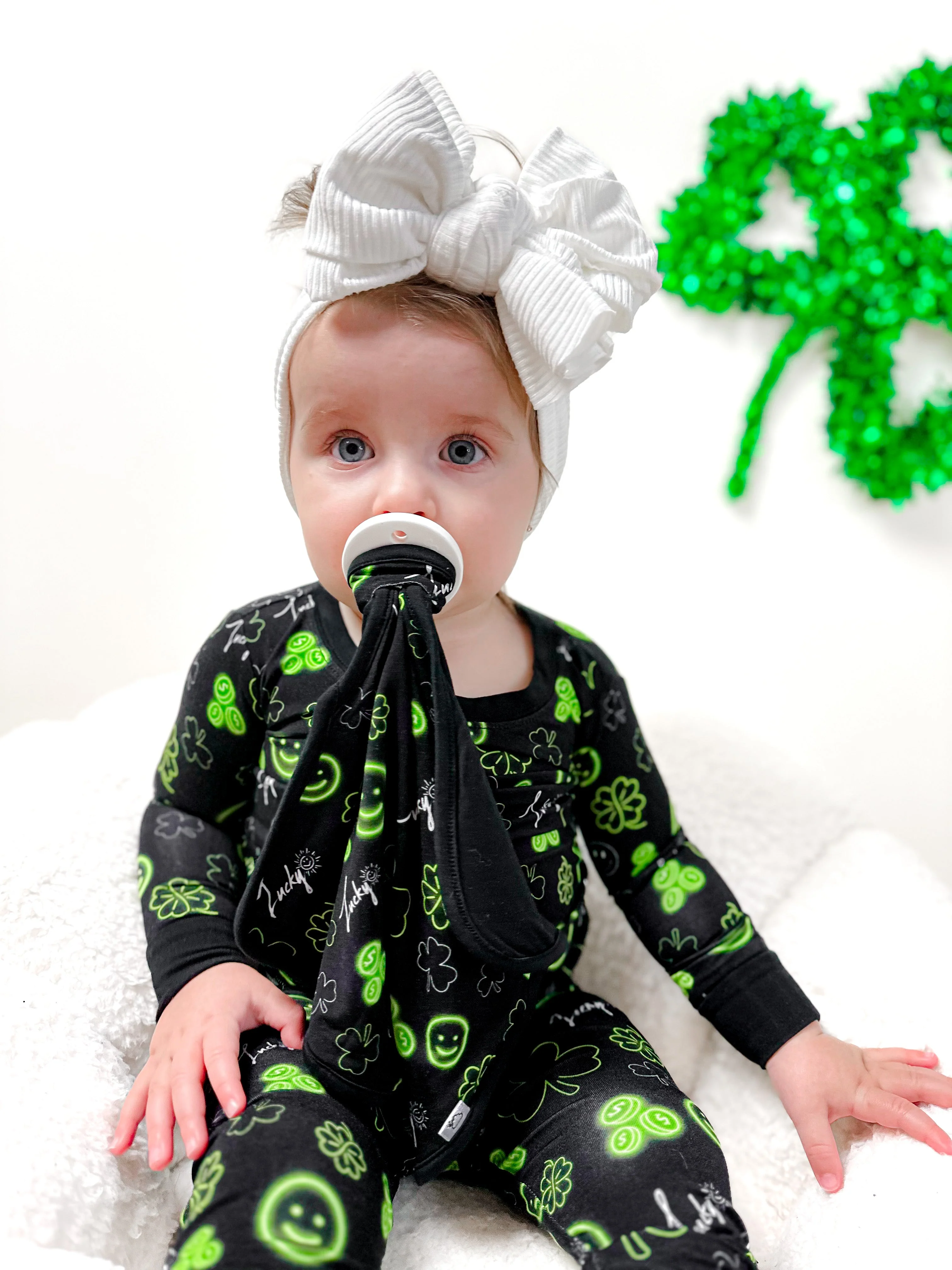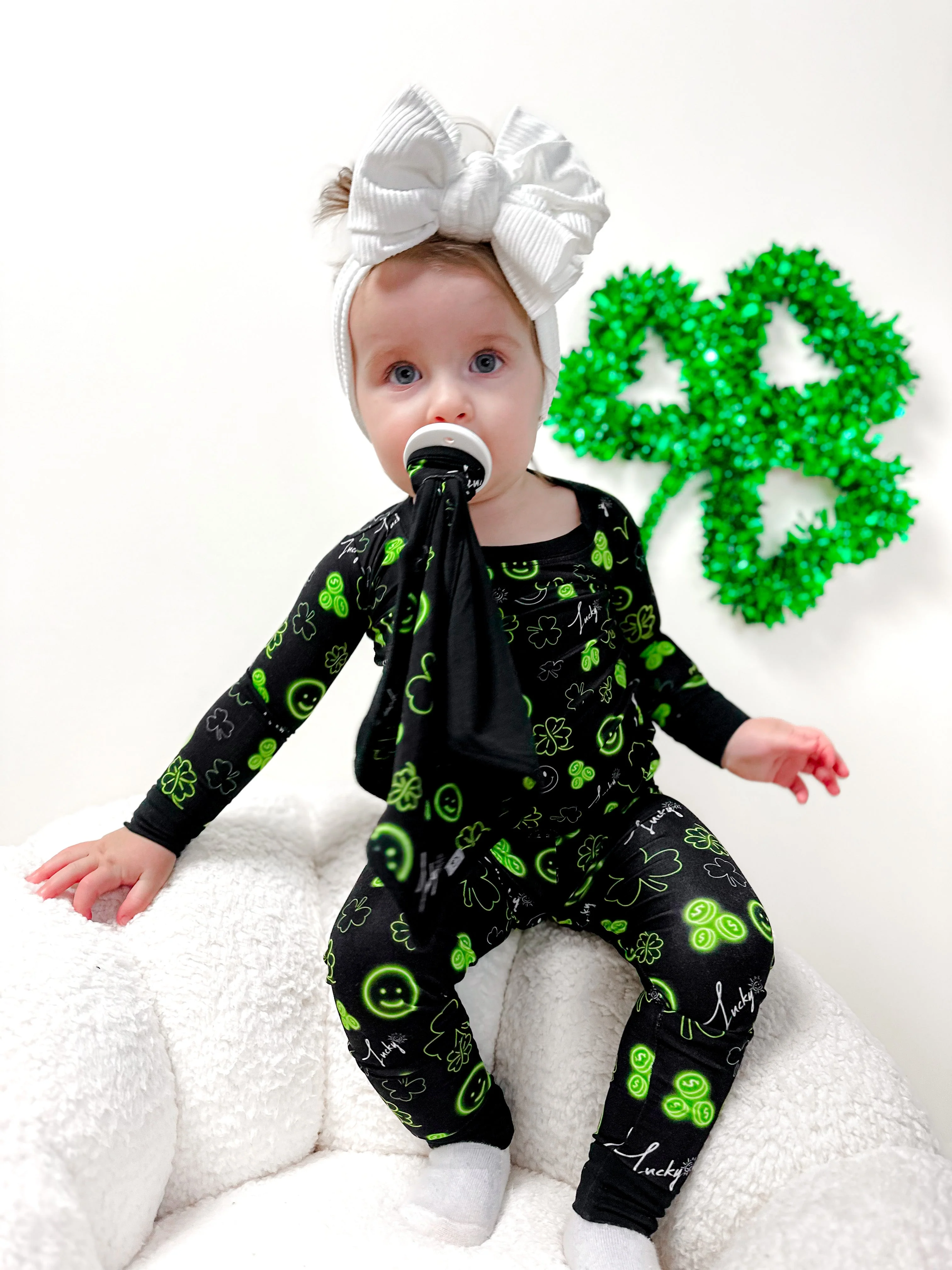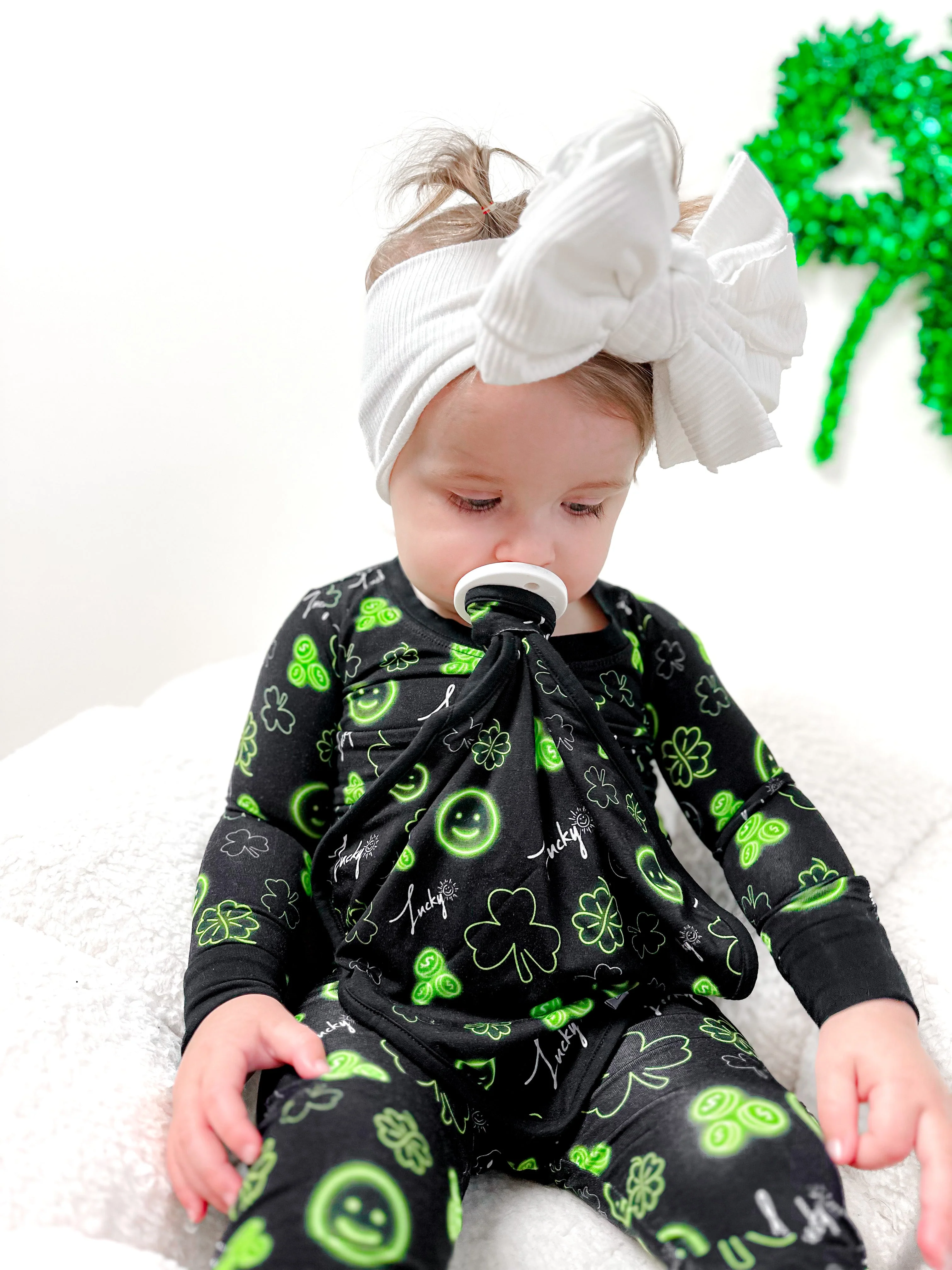 Bring some luck and love into your little one's life with our Lucky Vibes Dream Lovey. Made from bamboo material, this multipurpose lovey features a lucky shamrock print and can hold pacifiers and teething toys. Perfect for St. Patrick's Day and beyond!