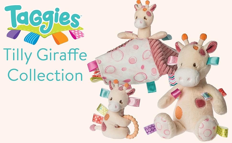 Tags that babies love to explore! Our Tilly Giraffe character blanket is a soft, huggable toy on top of an attached blanket that gives baby a lot to grab onto. Features a sweet giraffe attached to a 13 x 13-inch blanket adorned with interactive tags. With truly innovative attributes and small beginnings, Taggies has revolutionized and redefined how little ones feel secure and engaged in play. Taggies was born when a mom noticed her child's fascination with satin tags, and blossomed into a world of treasured products. Exploring Taggies textured tags can provide sensory stimulation that babies crave for development and have an amazing calming effect on little ones. Taggies Signature Collection is recognized as the premium line of wonderfully soft and soothing Taggies toys made by Mary Meyer.