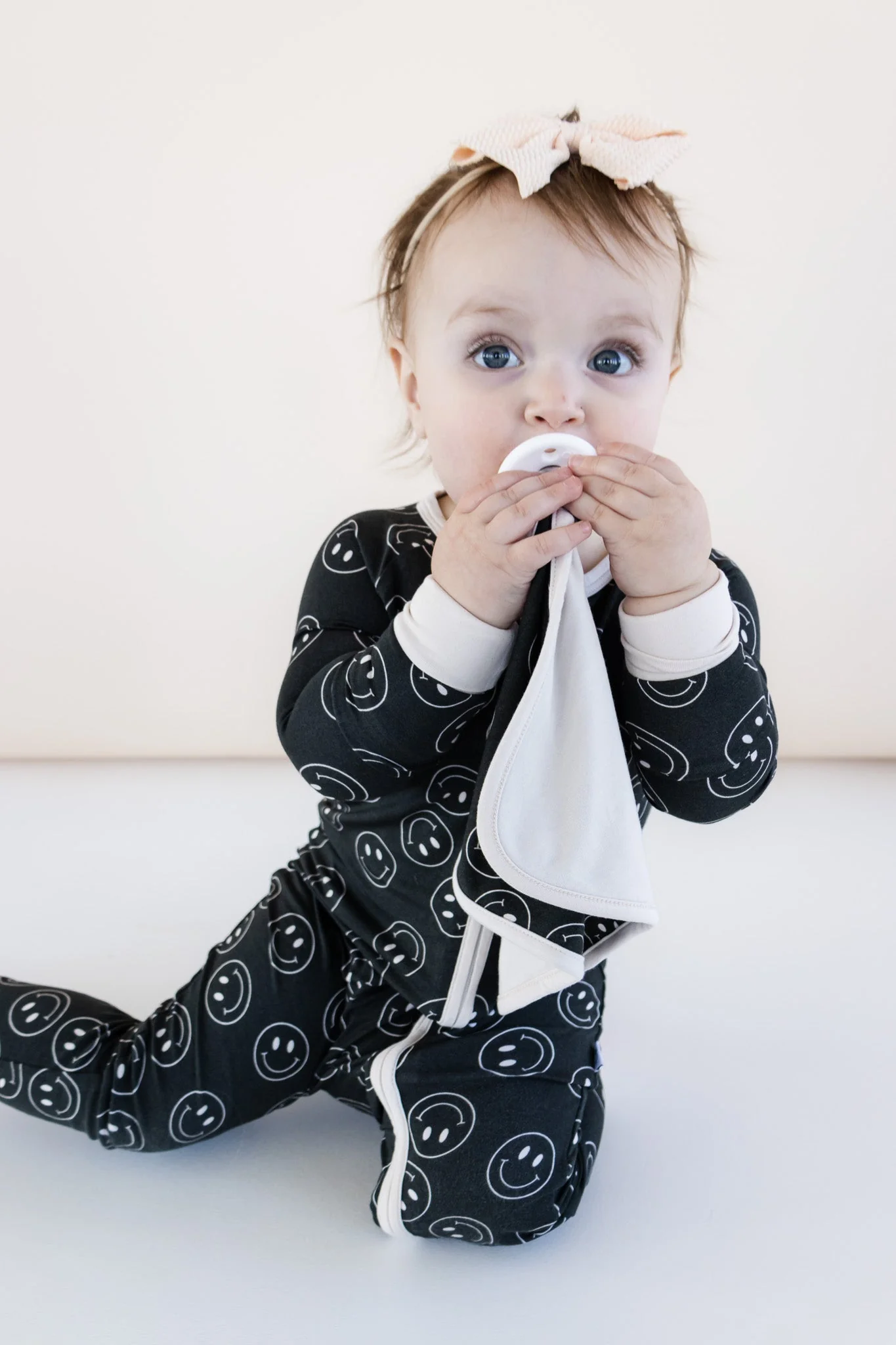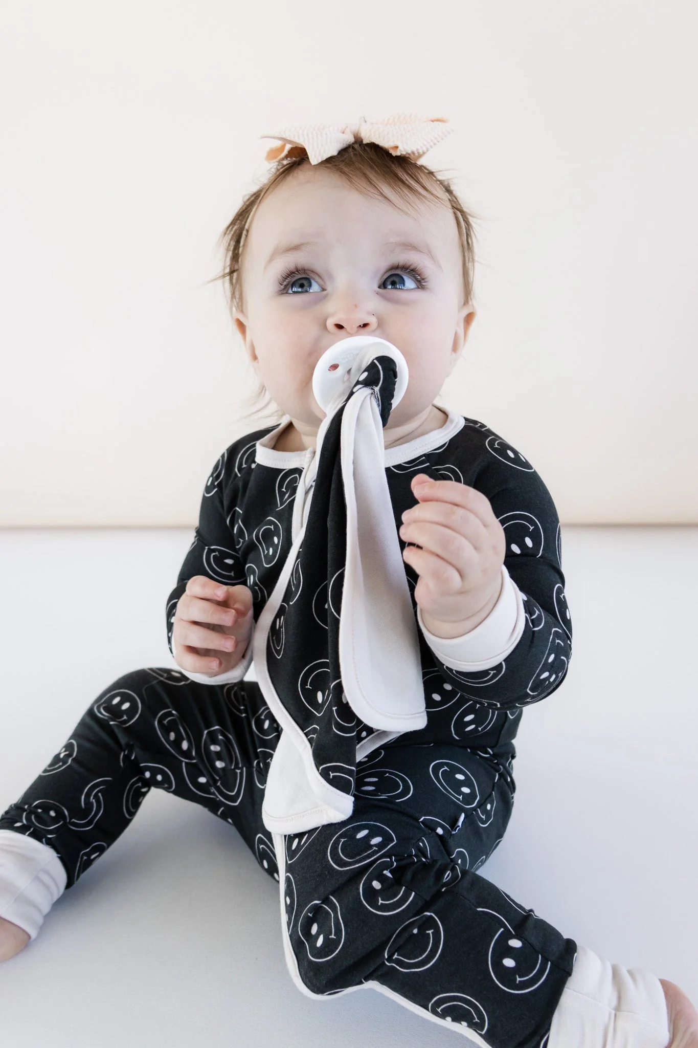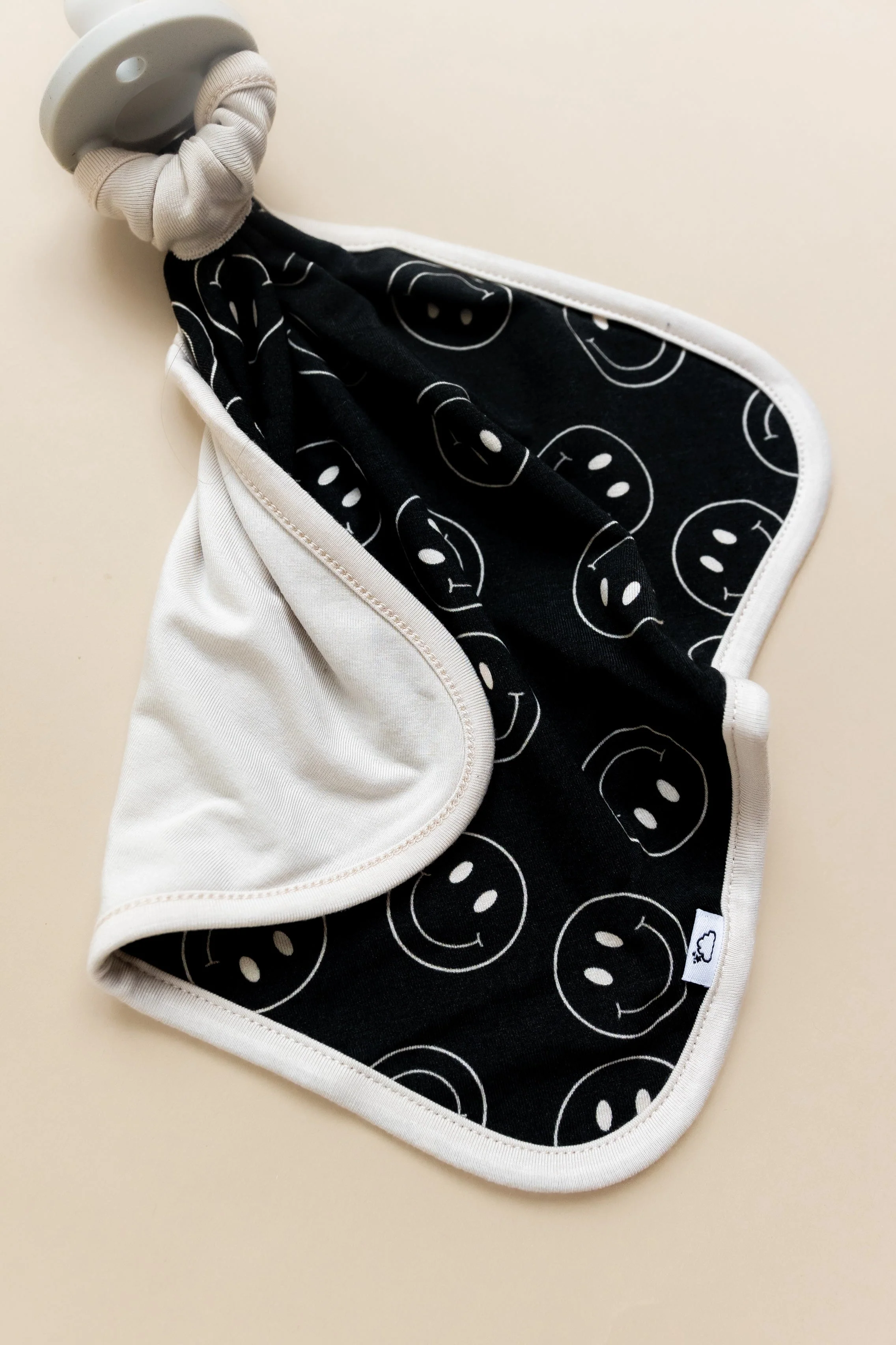 Keep your little one's pacifier close with the Midnight Smiles Dream Lovey! This adorable lovey features a smiley face and a pacifier holder, making it both functional and fun. Made from soft and sustainable bamboo material, your baby will love snuggling with this black-colored lovey. Sweet dreams guaranteed!