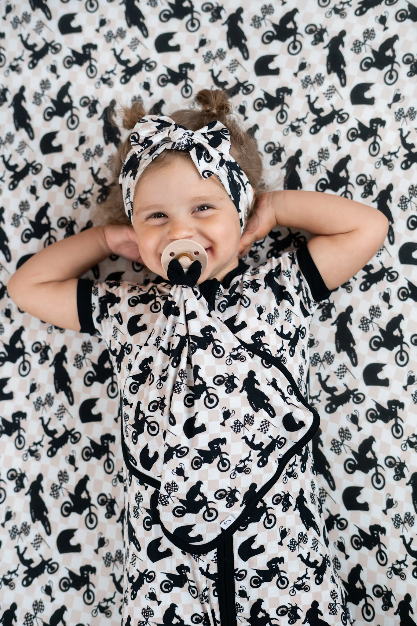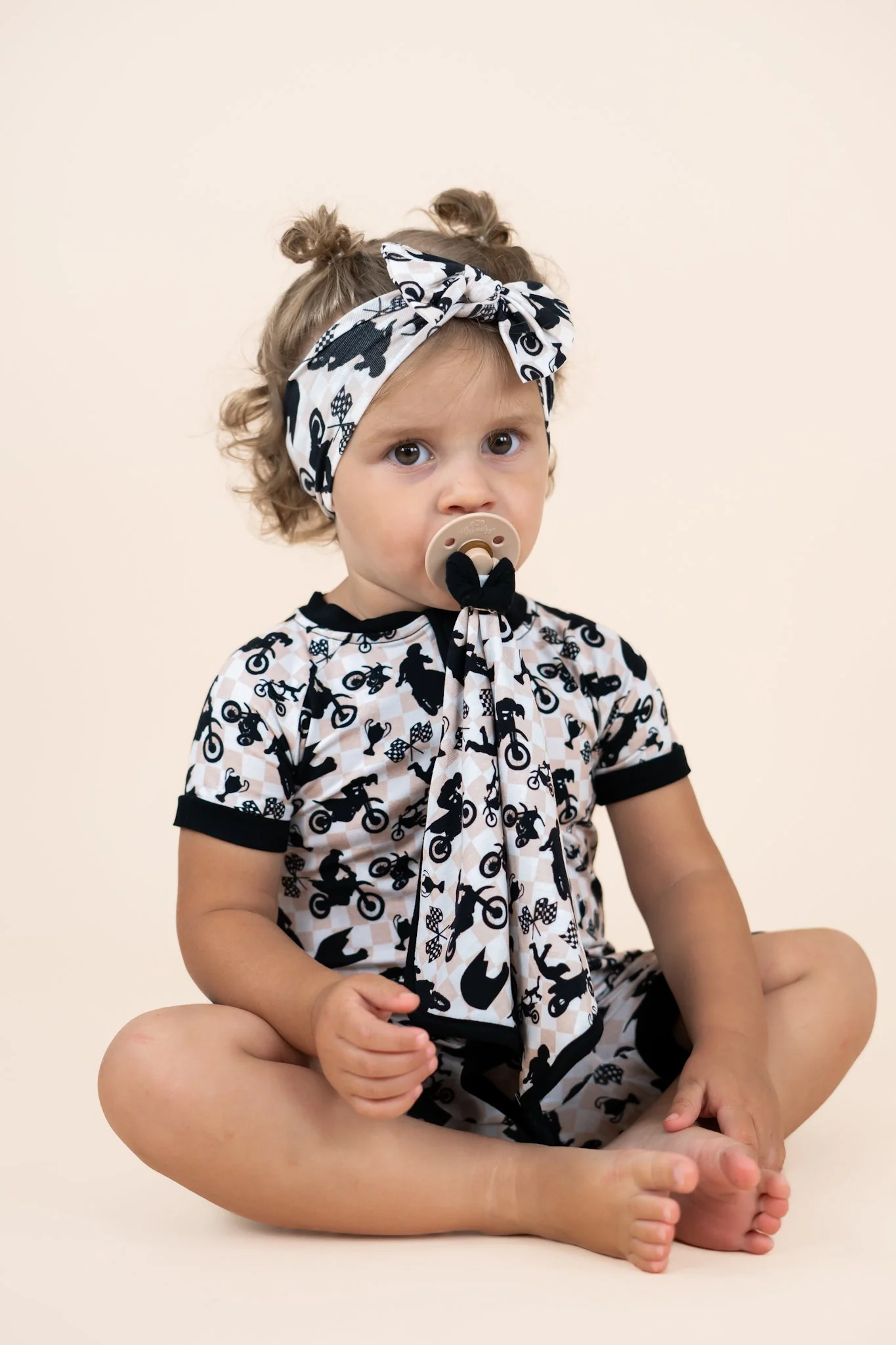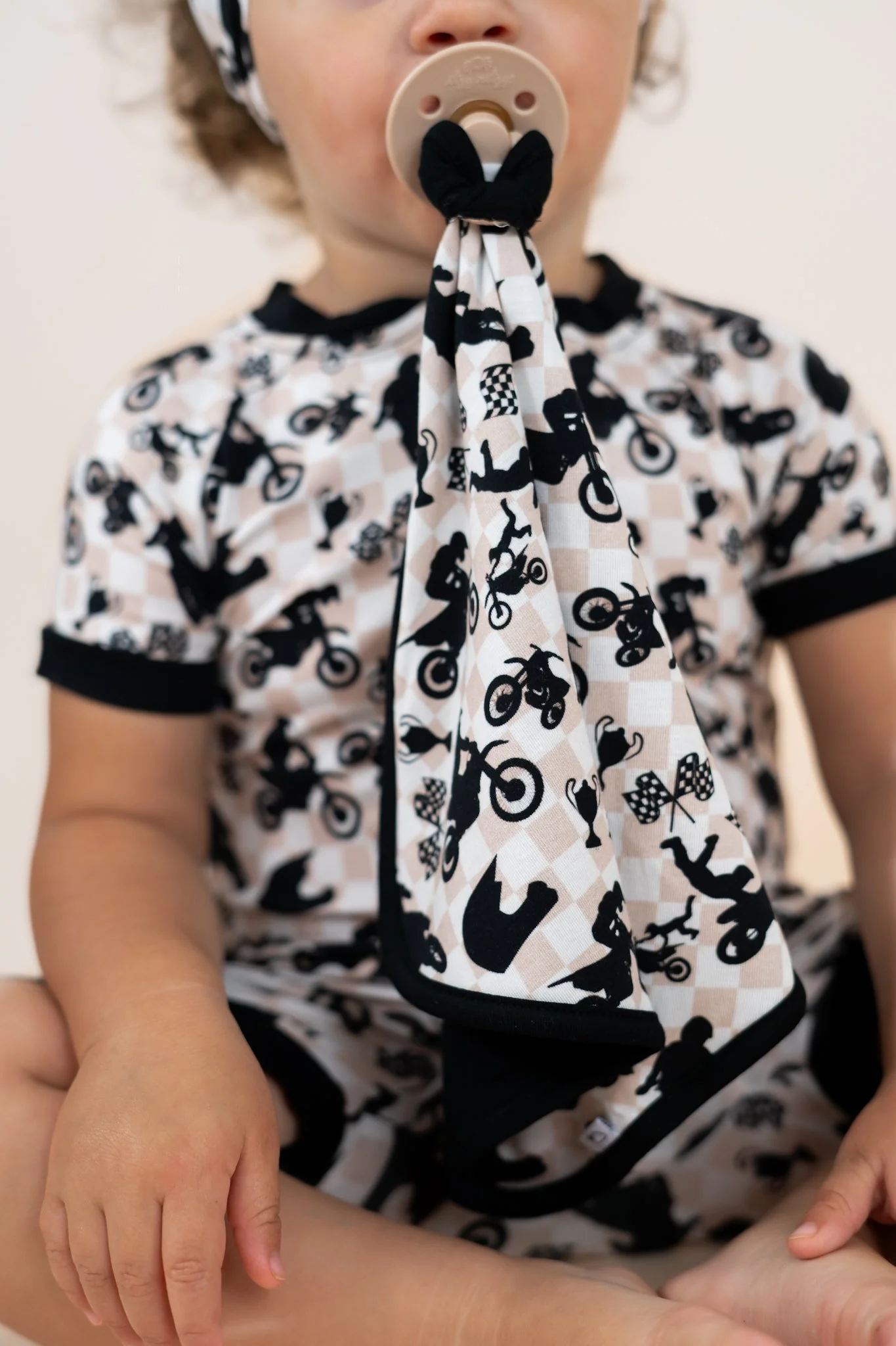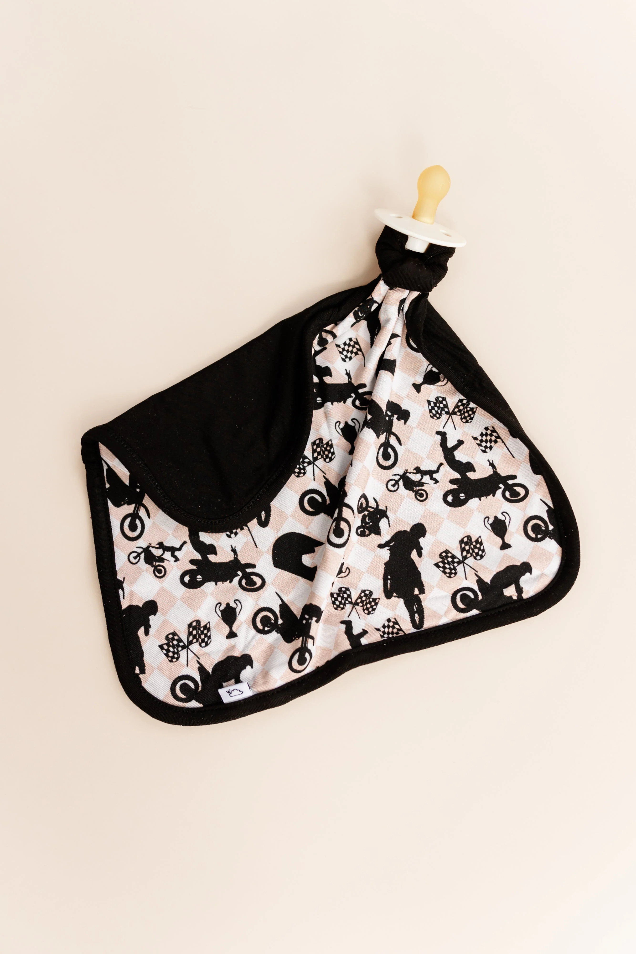 Rev up your little one's dreams with our Motocross Dream Lovey! This soft and stylish lovey doubles as a pacifier holder, featuring a motocross print perfect for your little racer. Made from bamboo material for ultimate comfort. Vroom Vroom!