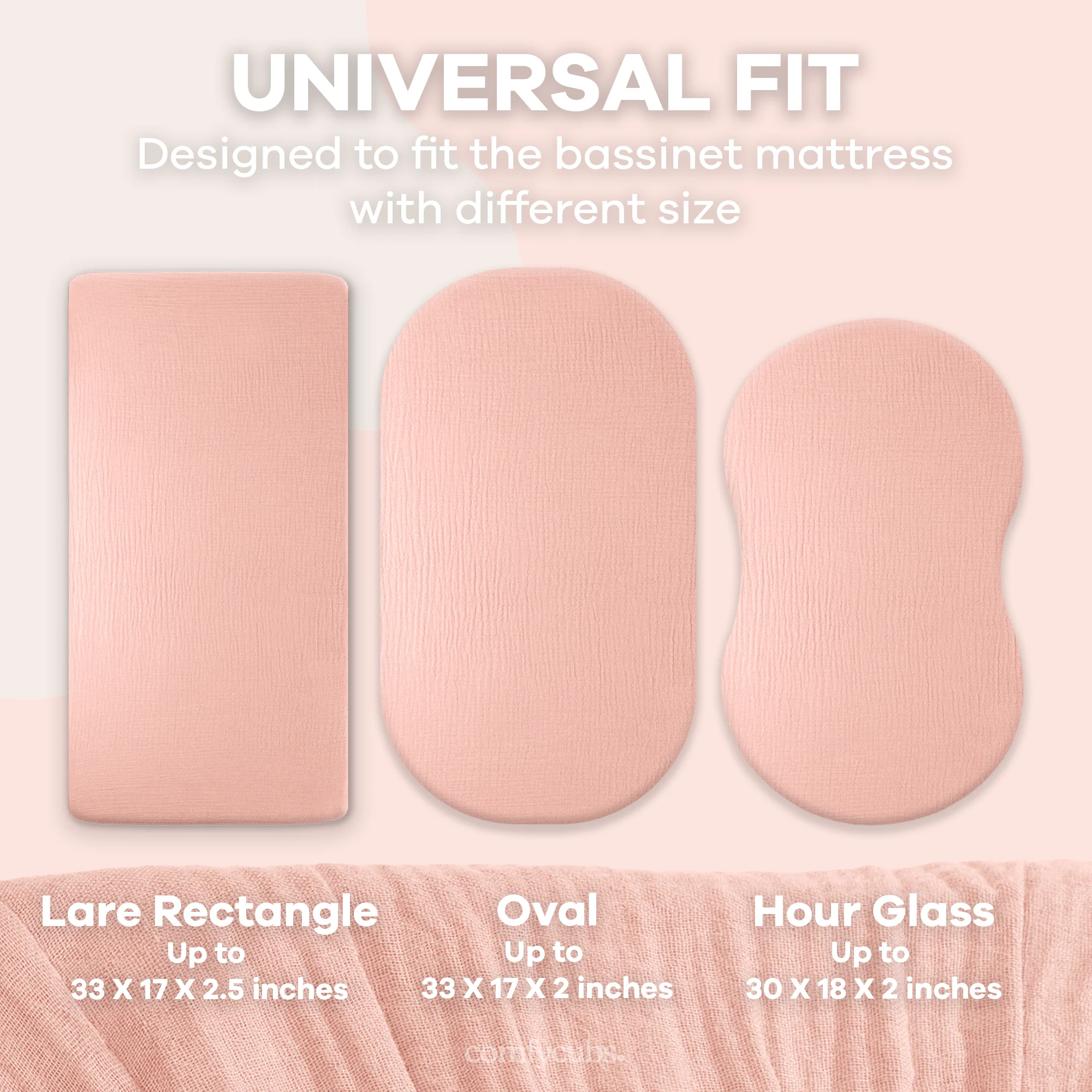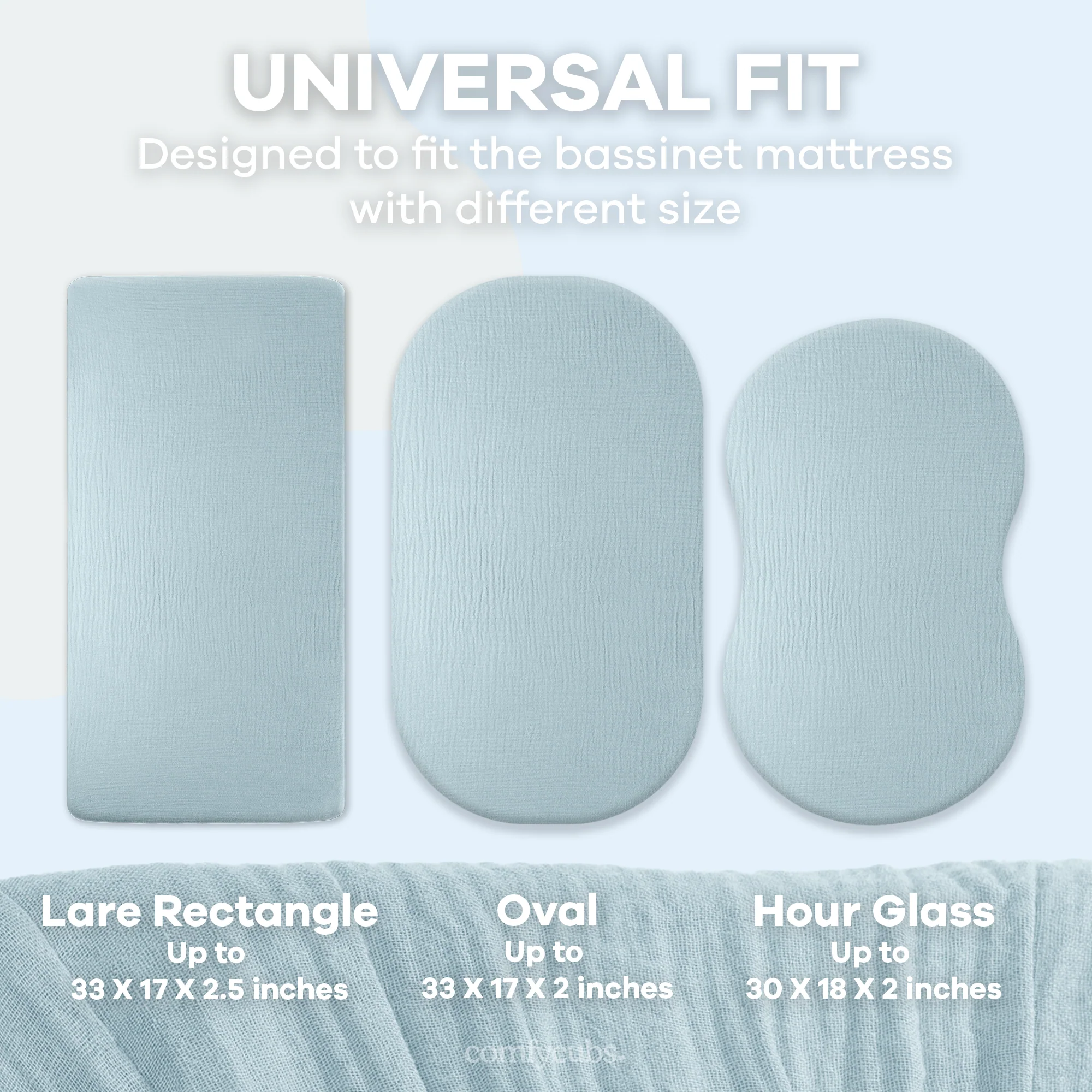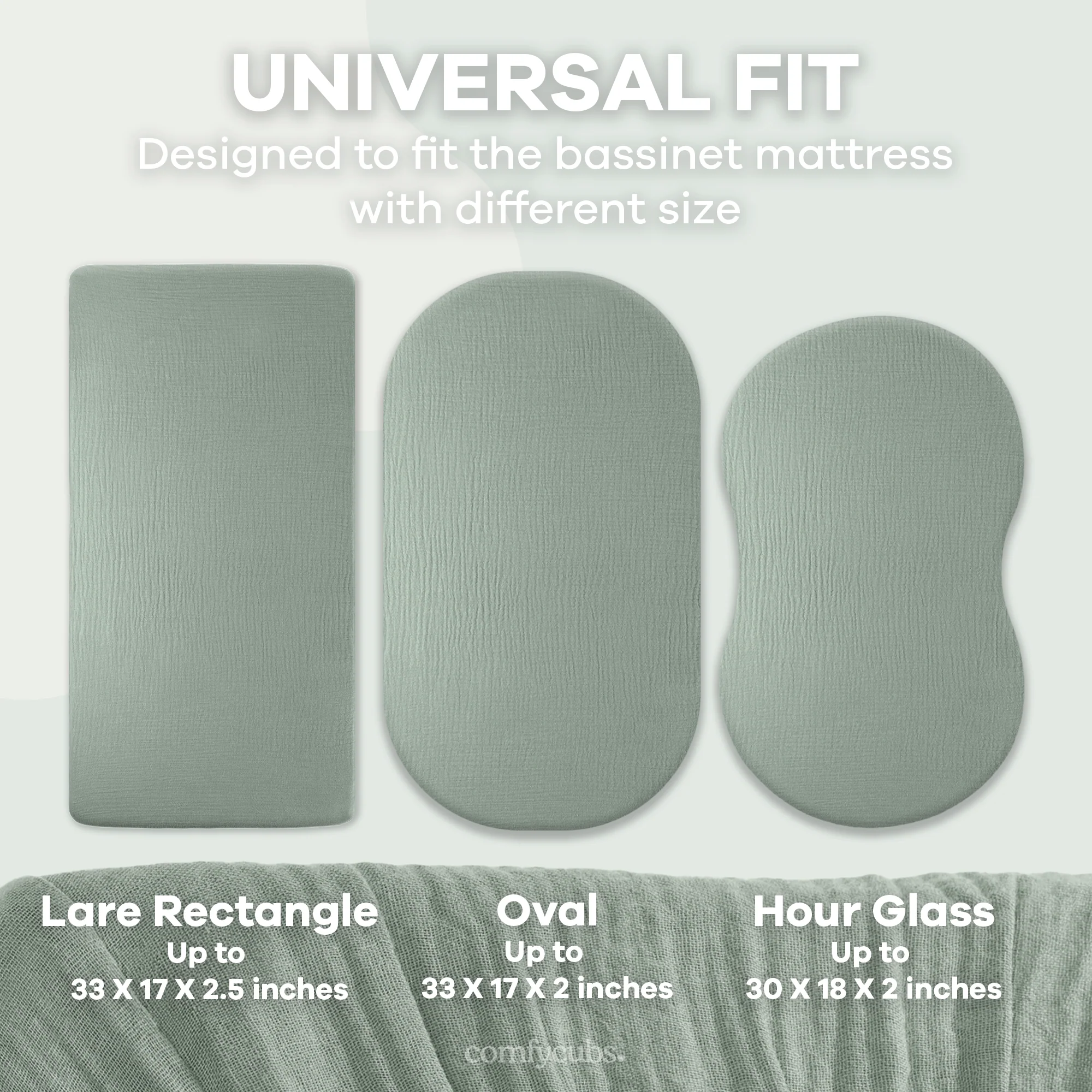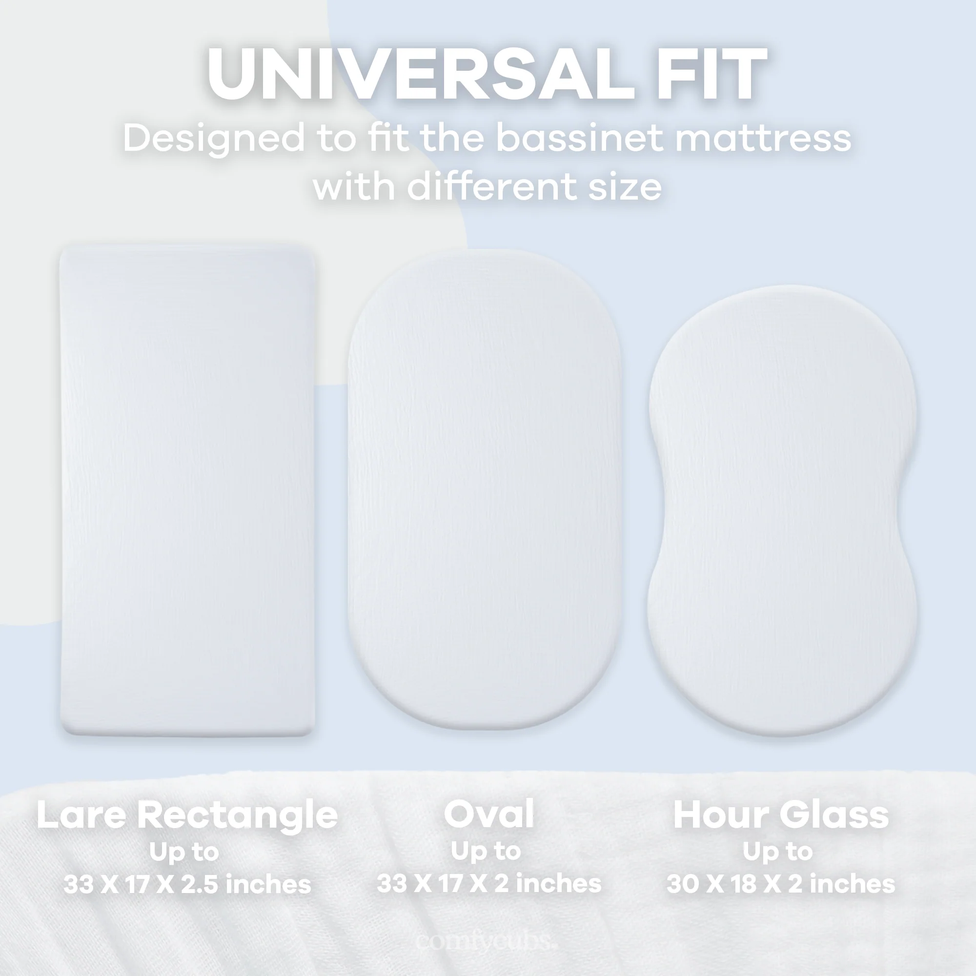 Universal Fit for All Bassinet Shapes: Uniquely designed for versatility, this sheet fits all bassinet mattress shapes, including large rectangle, oval, and hourglass configurations. The adaptable design guarantees a snug fit, making it suitable for a wide range of bassinet styles.