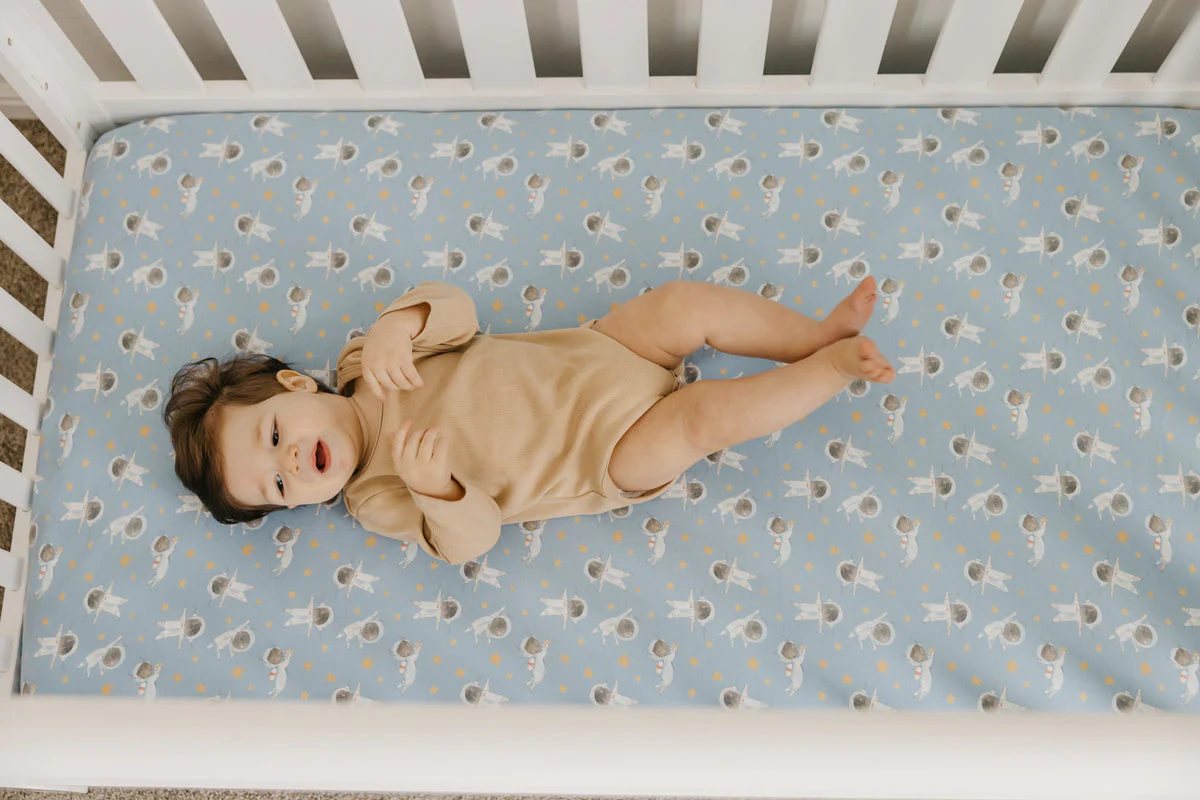 This luxurious Neil Premium fitted Crib Sheet from Copper Pearl will create a soft spot for your little one to dream. It is elasticized all around for a snug fit on standard-size mattresses along with a print to match your nursery decor.