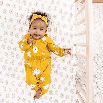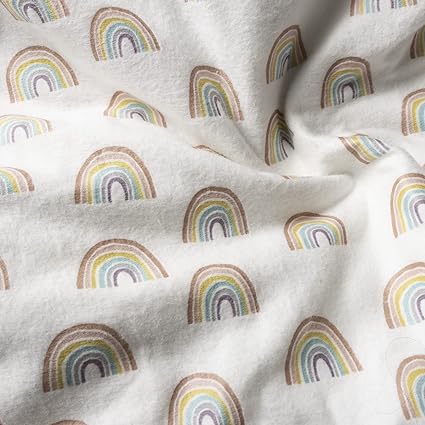 The Pastel Rainbow Deluxe Flannel Fitted Crib Sheet by Trend Lab is 100% brushed cotton and features a rainbow sketched print in peach, rose, golden yellow, blue haze, lilac, and dusty blue. Crib sheet fits a standard 28 in x 52 in crib mattress