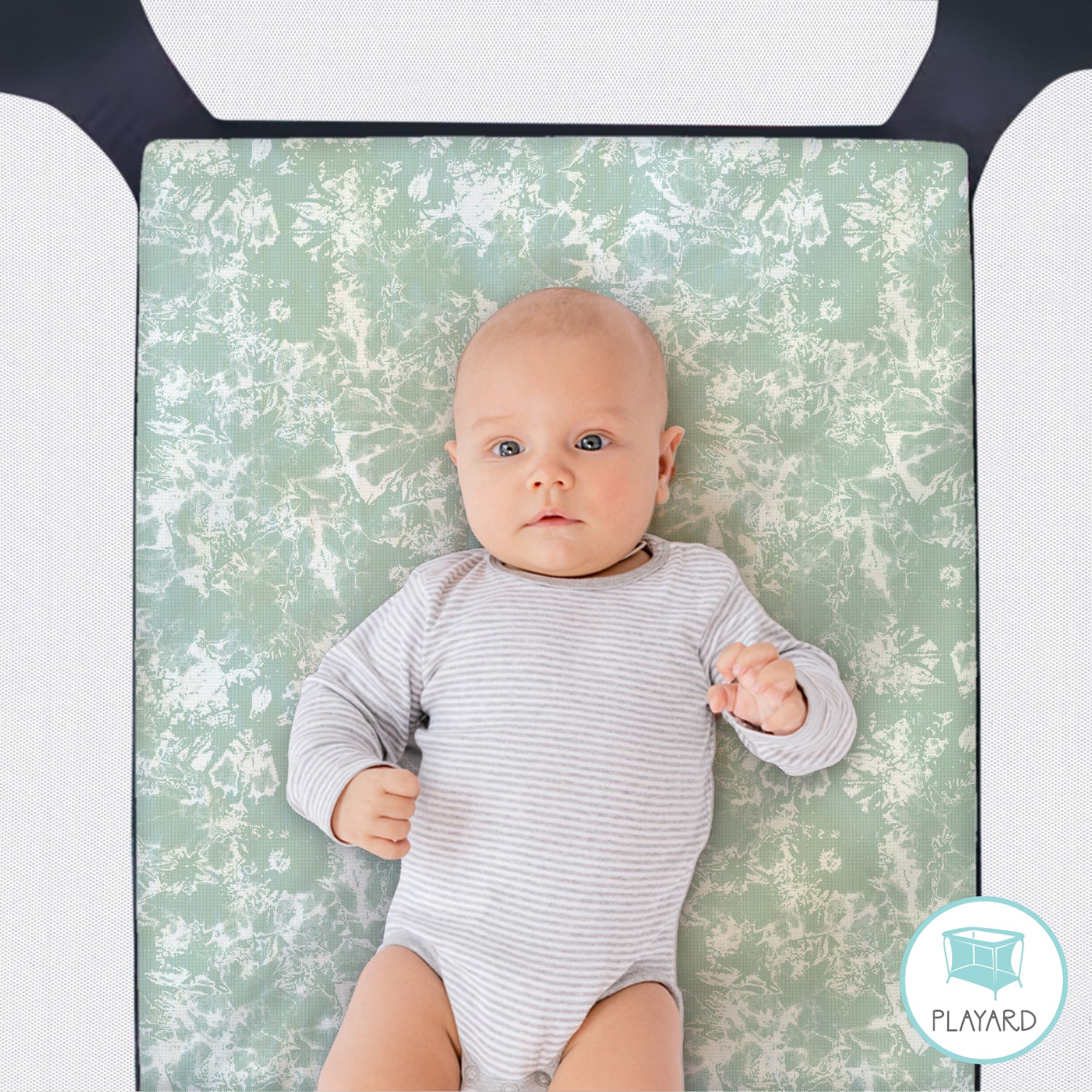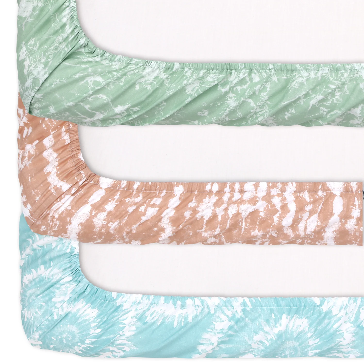 The Boho Tie Dye 3-Pack Playard Sheet Set by The Peanutshell features a trio of eye-catching designs. With three different color variations in light blue, sage green, and brown, you can mix and match these tie dye prints to create various bohemian looks for your little one's nursery. The soothing and modern three pack is printed on high quality and breathable fabric that fits most standard playards, cribs and pack-n-plays. Each sheet is thoughtfully designed to fit snuggly on most standard playard mattresses ensuring a secure and wrinkle-free fit with all-around elastic.