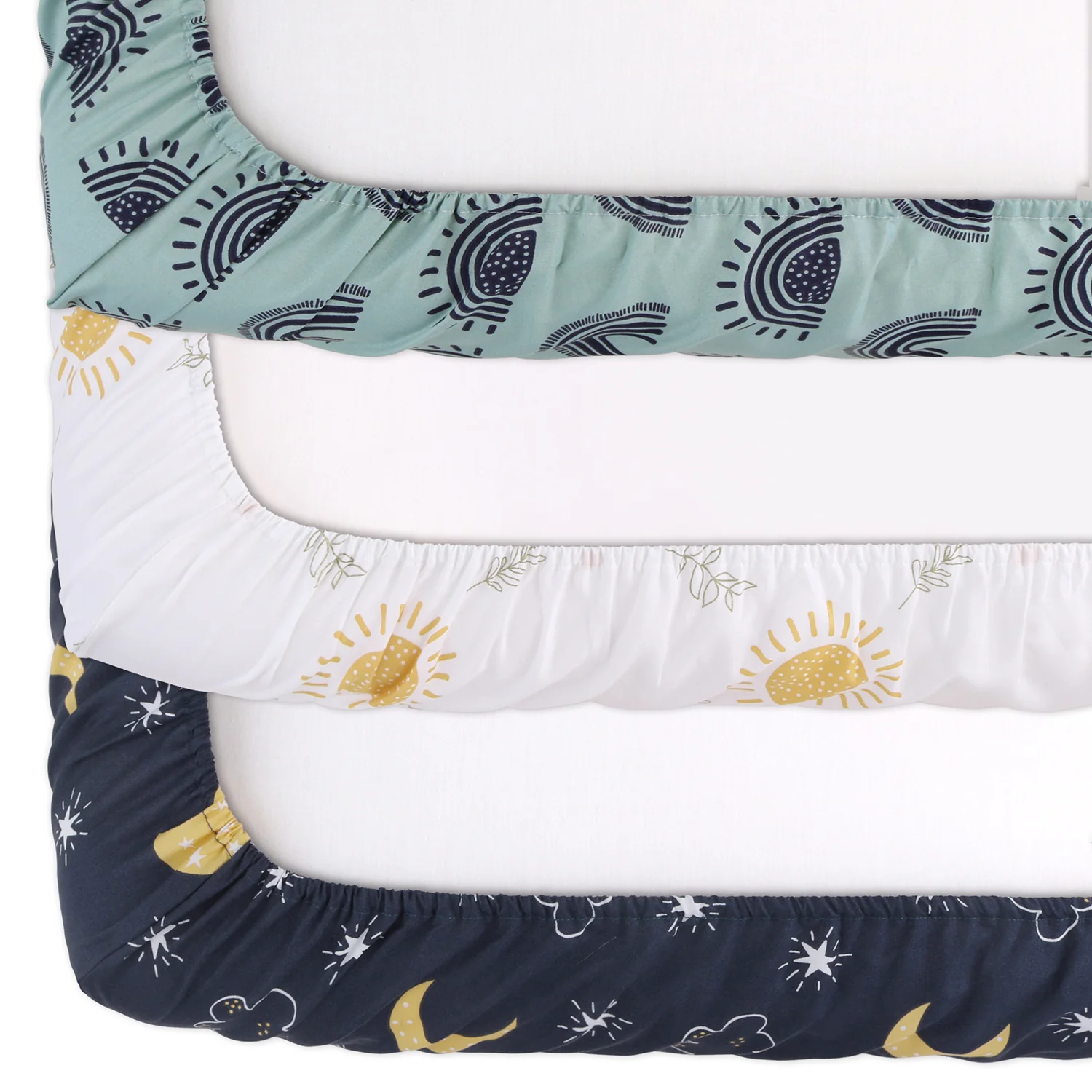 Illuminate your little one's nursery with the Day and Night 3-pack Playard Sheet Set by The Peanutshell. Our dreamy trio includes three fitted multipurpose sheets designed to fit a standard size playard, mini crib, or pack and play. Made from high-quality, breathable fabric, these adorable prints feature a celestial symphony of radiant suns, dreamy moons, and hand-drawn rainbows. The calming palette of navy, yellow and green provides an effortlessly cozy atmosphere. The snug and secure fit with all-around elastic ensures the ultimate comfort for baby. Designed to be fade resistant and machine washable for easy care.