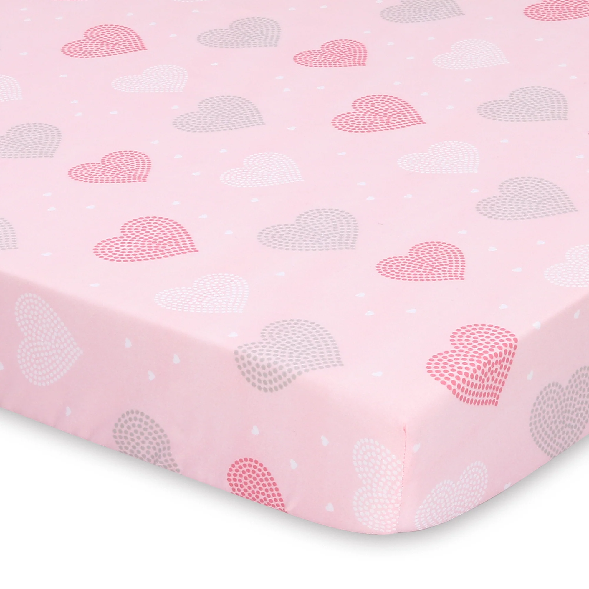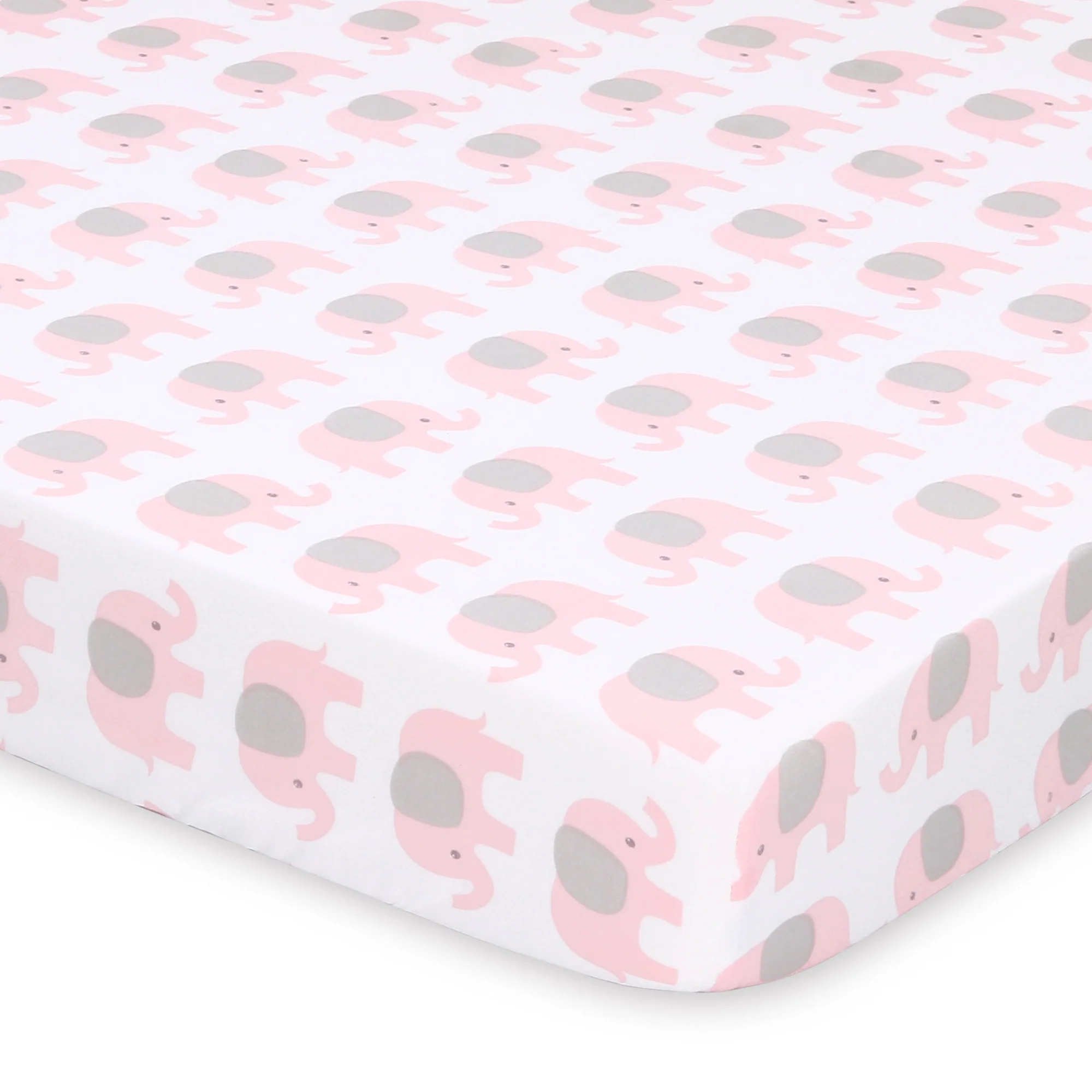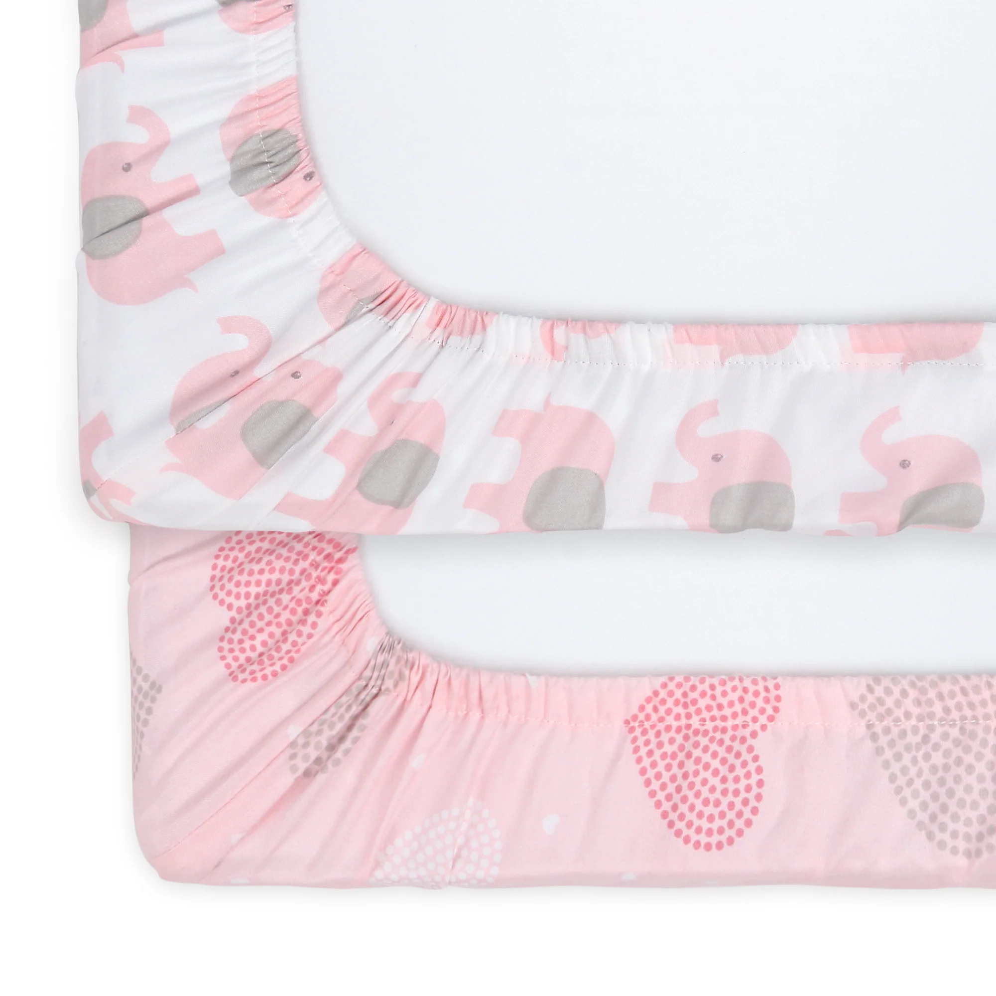 The Peanutshell pack n play sheets will fit any mini crib, playard, pack and play, or portable crib. Pink elephants on a crisp white ground and hearts in shades of pink and grey on the soft pink ground are sure to surround baby with love as she goes off to dreamland. Each sheet in this 2 pack fitted sheet set is made of plush soft microfiber, which is smooth against your baby’s delicate skin. Set of two mini crib sheets makes for quick and easy changes, with simple machine wash/tumble dry care.